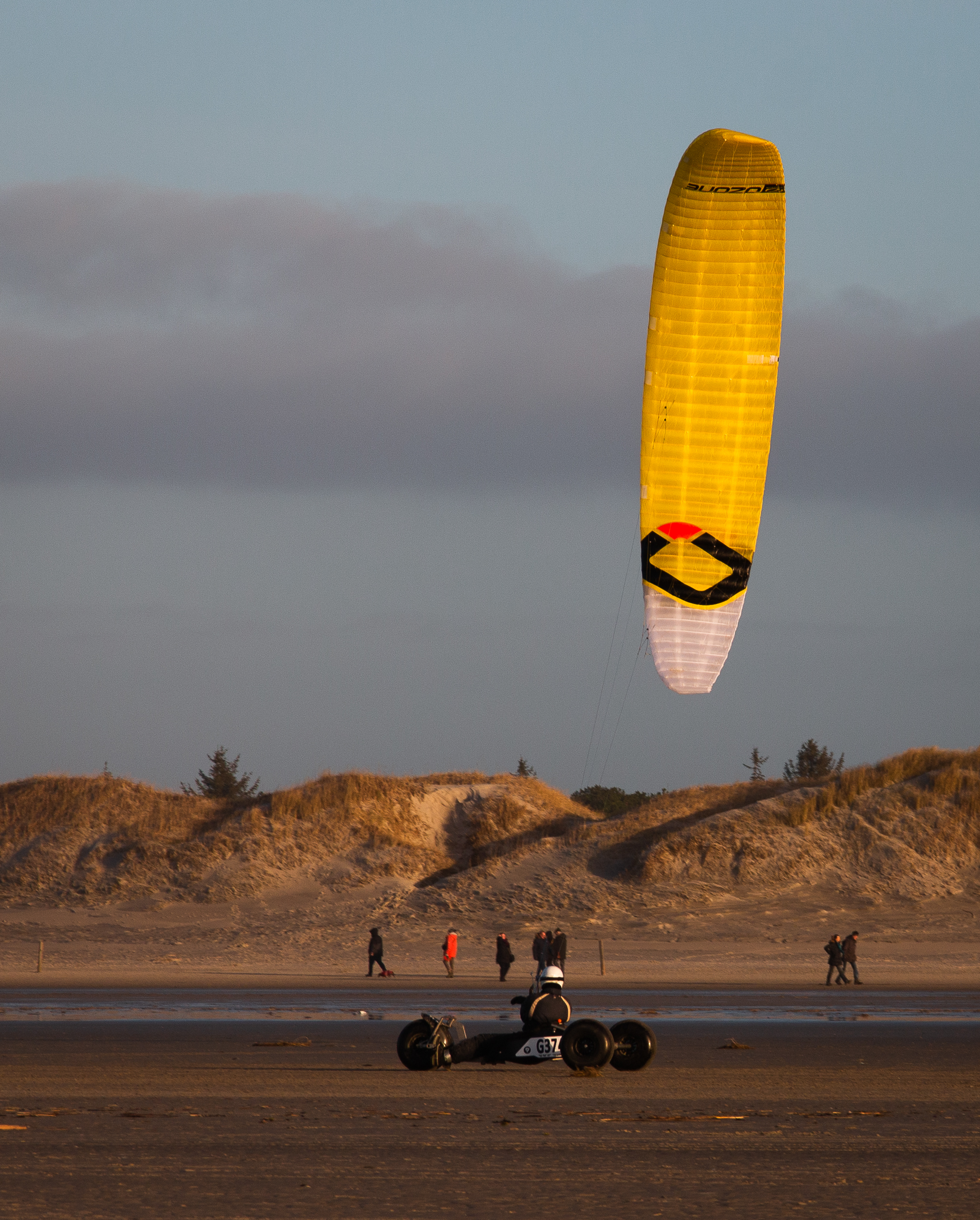 Weiter oben am Strand ist es anders. Dort wo der Sand hart und glatt ist, sind ein paar moderne Ritter zu sehen, dick eingepackt, unkenntlich, weil mit geschlossenem Visier. Auf ihren dreibeinigen Schlachtrössern aus Stahlrohr und Gummi, lassen sie sich ziehen vom Wind der die Fallschirmseide bläht. Sie sind nur zum Spass hier, nicht zu meditativem Anlass. Gerne würden sie diesen Strand möglichst im gestreckten Galopp entlang jagen. Aber zu schwach ist inzwischen der Wind – nicht viel mehr als eine Brise ist geblieben – und deshalb wird aus dem Galopp nur mehr ein Trab. Ihren Spass haben sie trotzdem. Und sollen ihn haben.