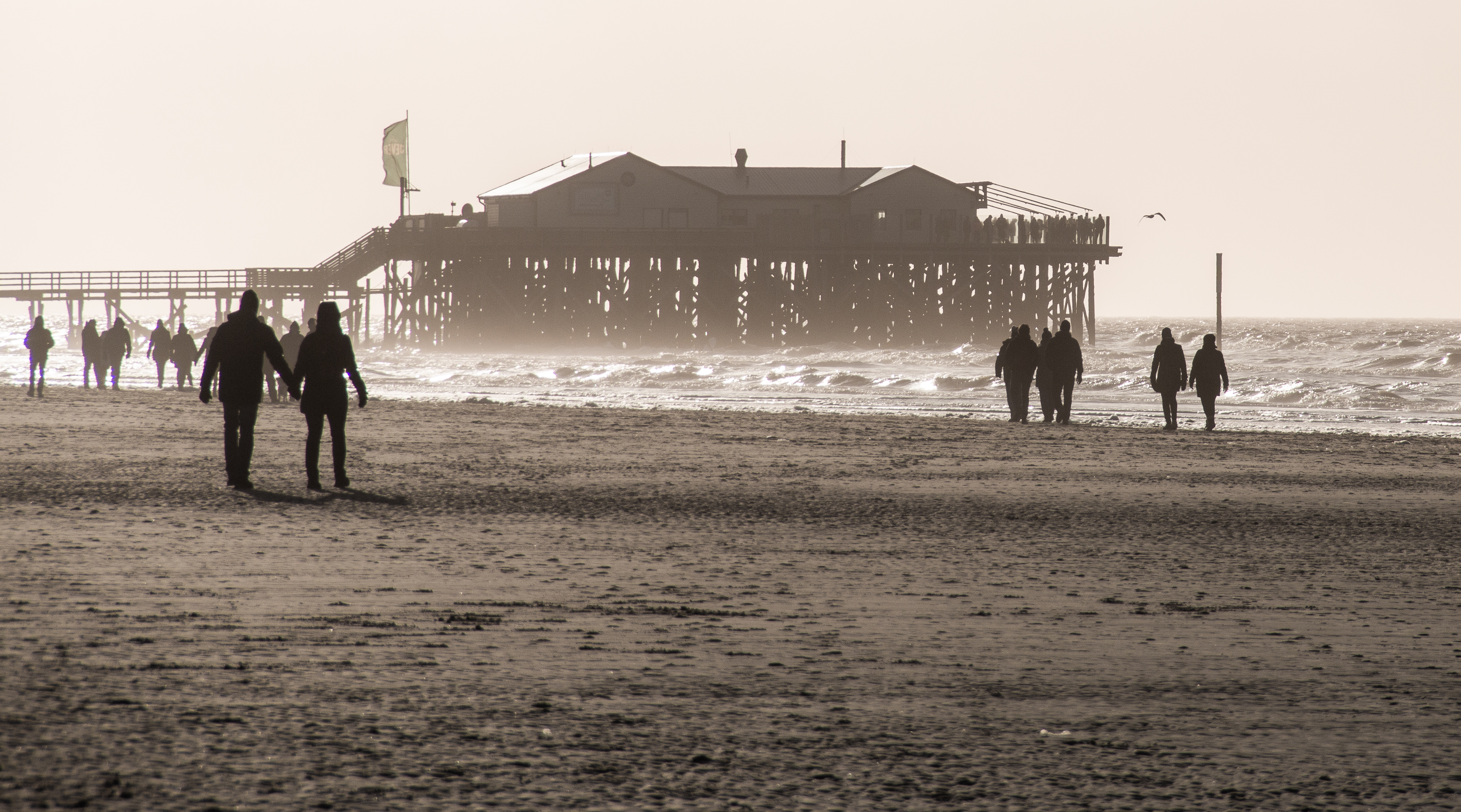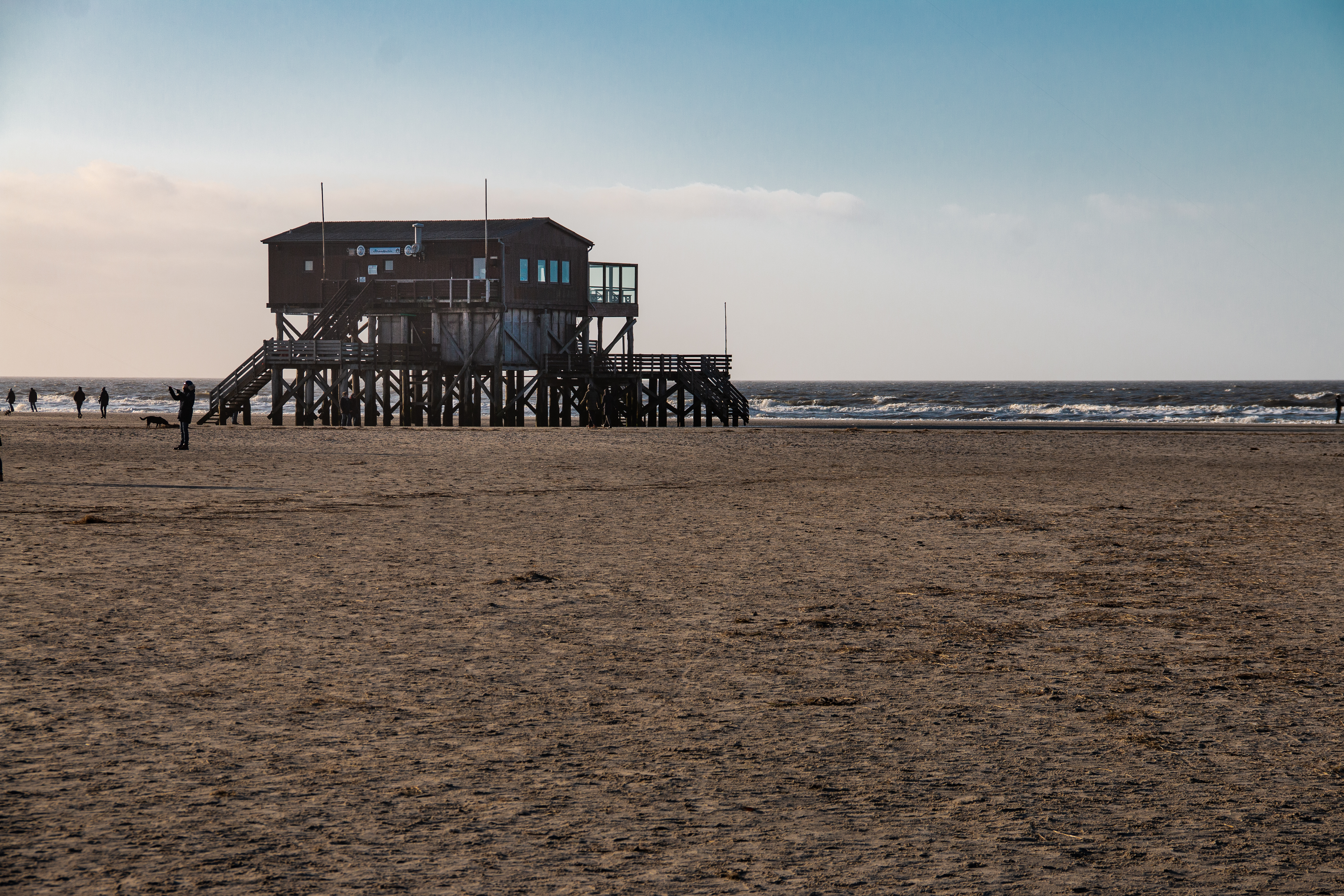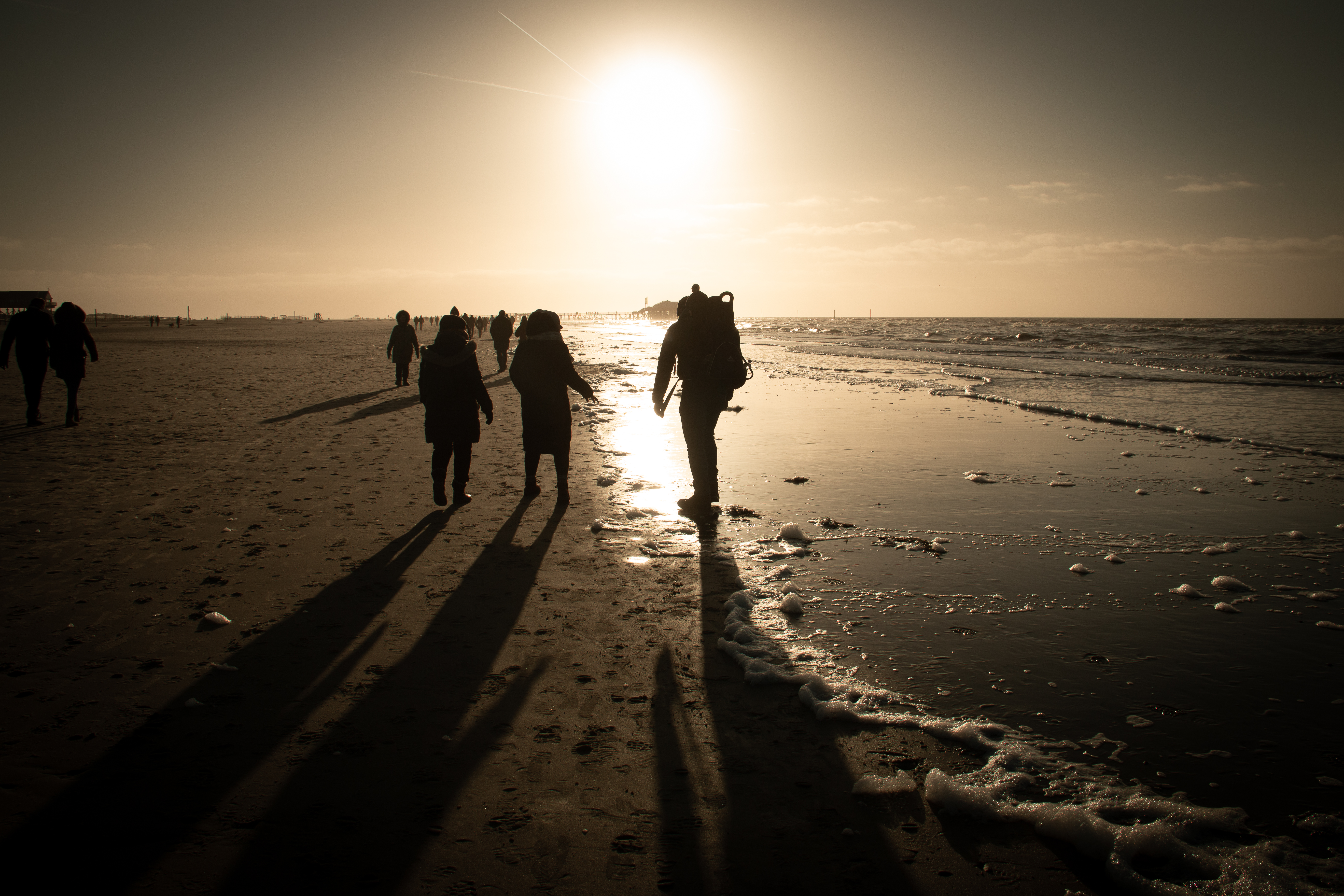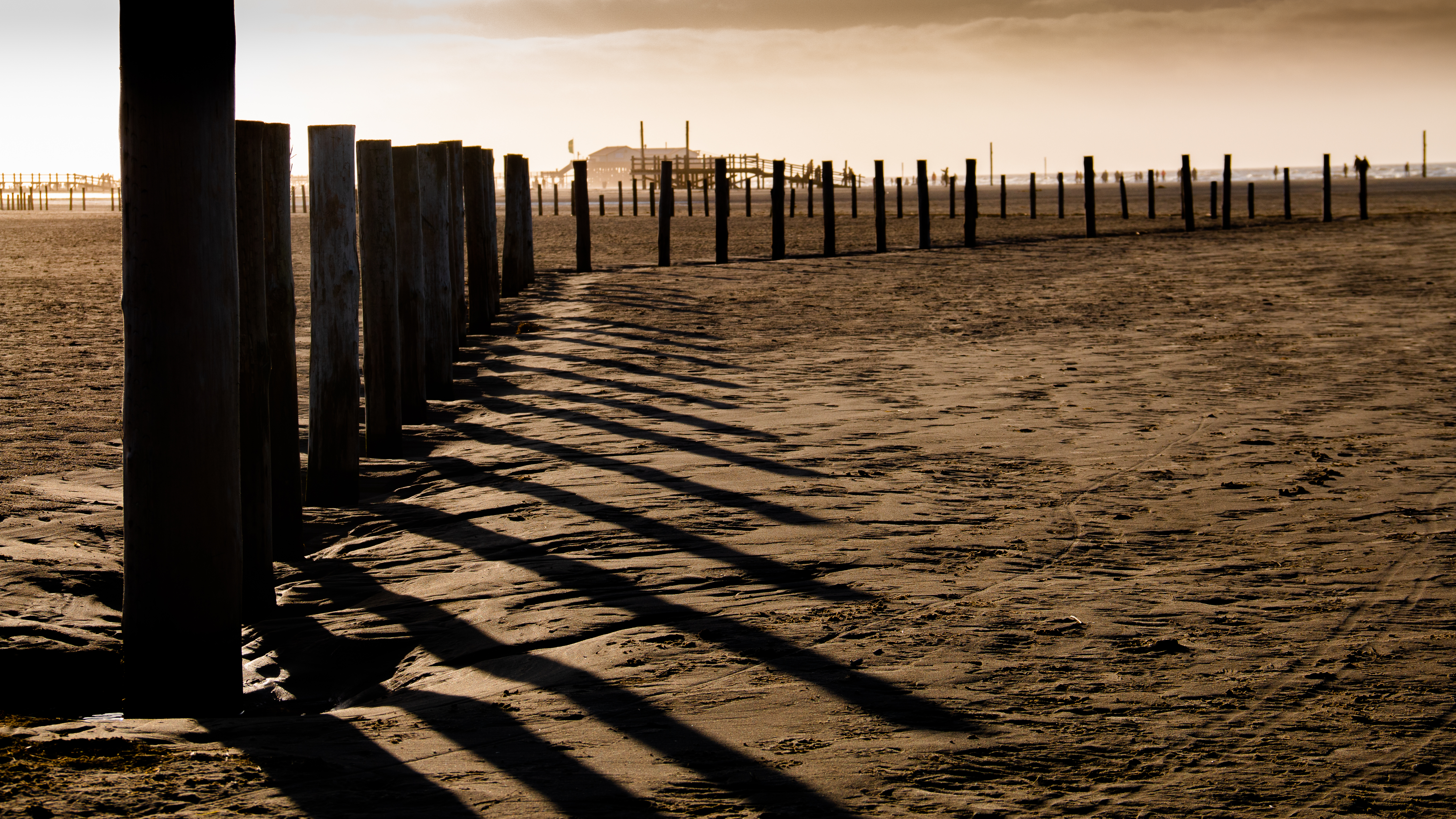 Die Holzbauten auf den Pfählen im Süden haben schon vielen Stürmen standgehalten. Das späte Licht spielt mit Deinen Sinneseindrücken, malt Schatten auf den Sand. Im Gegenlicht wirken die Häuser fremd, eine leichte Gischt über der verbliebenen, schwachen Brandung zeichnet die Bilder sanft, macht sie weich. Die tief stehende Sonne verschiebt die Farben nach Sepia.