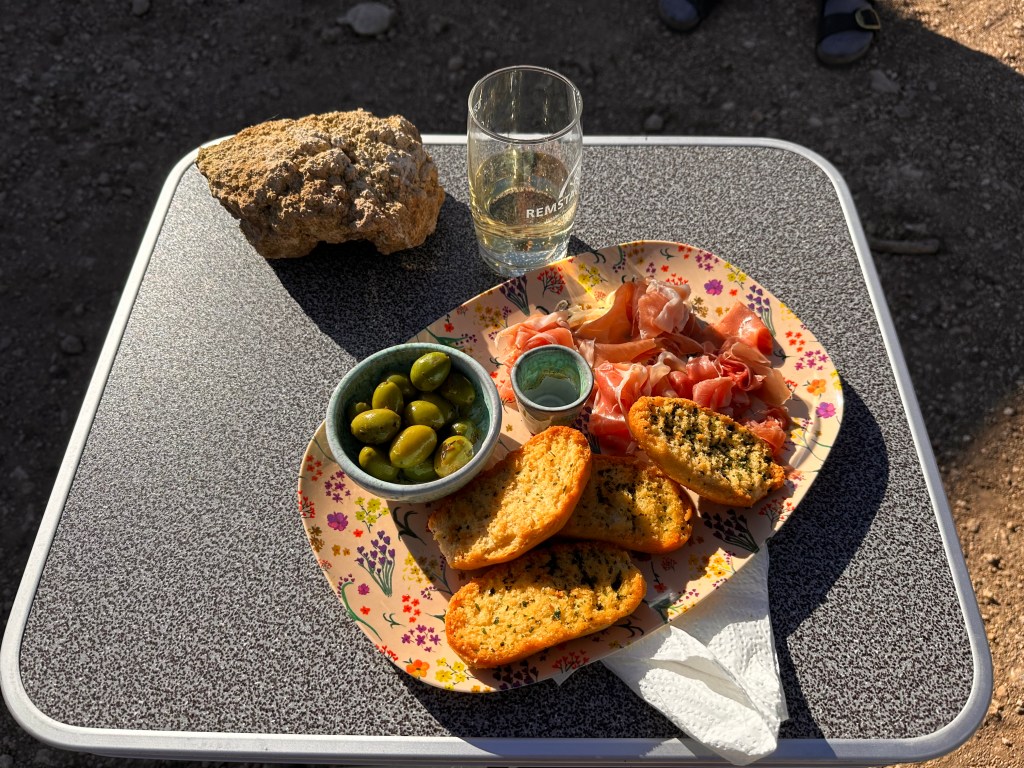 Zu dem nicht gerade entspannenden Anstieg kommt heute auch noch ein ekelig heftiger Wind hinzu. Und natürlich weht er genau gegenan. Komisch, beim Radfahren kommt der Wind immer von vorne! Ich bin mit zwei Packtaschen plus einem vollen Rucksack ziemlich beladen und trotz e-Bike und Max-Unterstützung bin ich, angekommen am Mobil, ziemlich fertig. Saane zaubert auf die Schnelle Tapas del la casa, dazu gibts für mich ein schönes, kaltes Cervesa, für sie ein Gläschen Weisswein.