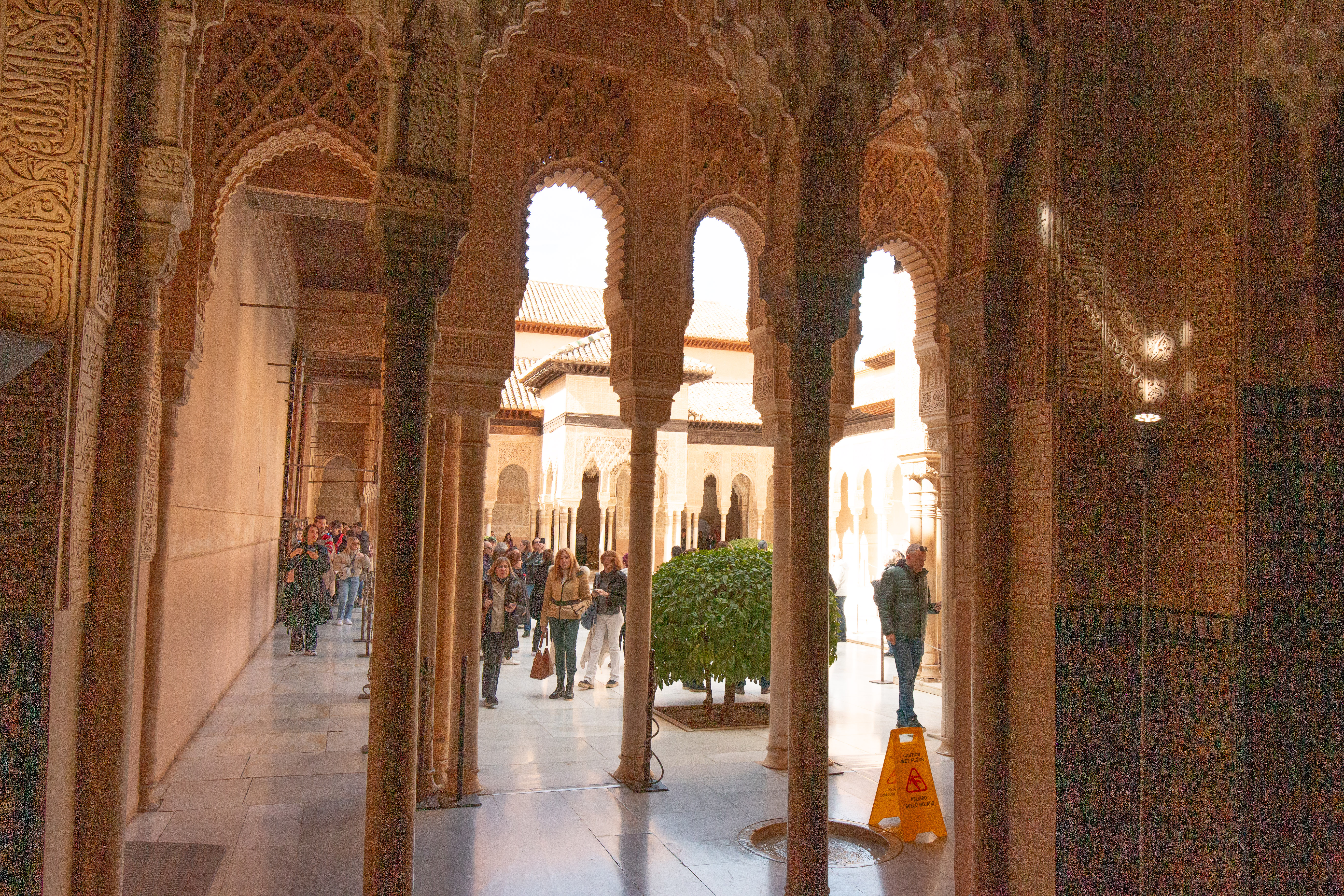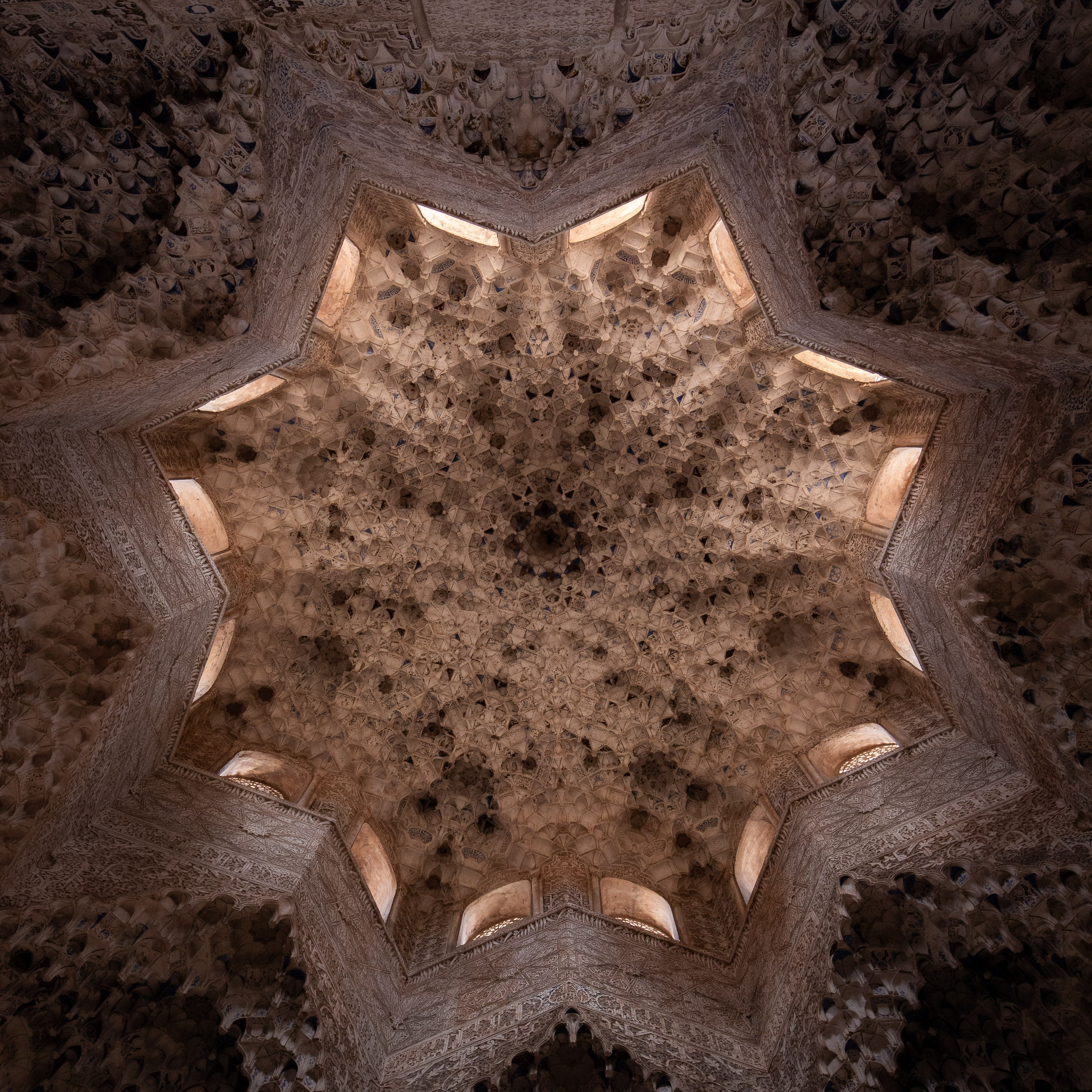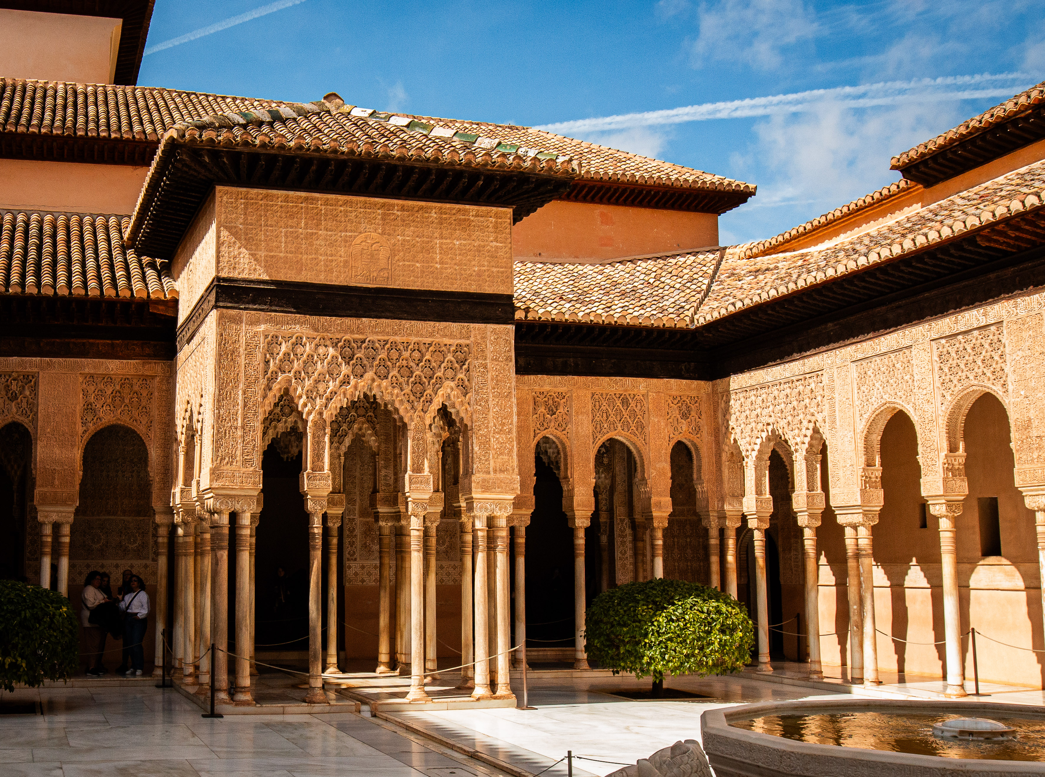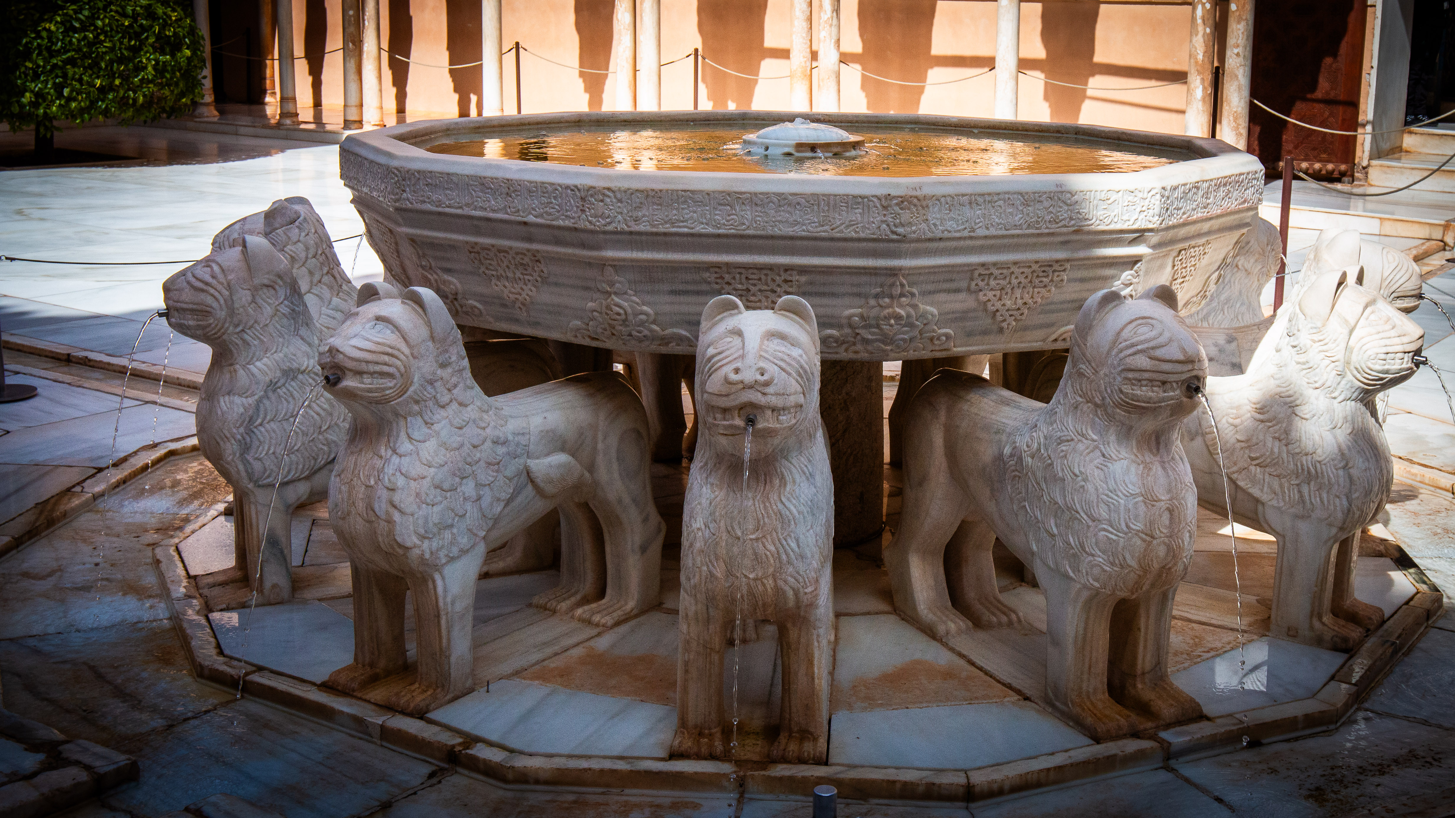 Wir bewundern die vielfältigen Fähigkeiten der maurischen Baumeister: die gesamte Alhambra verfügt bis heute über ein eigenes, autarkes Bewässerungssystem. Fliessendes Wasser hoch über der Stadt und den im Tal fliessenden Flüssen Genil und Darro!. Das Geheimnis liegt in einem Meisterwerk der Wasserbaukunst verborgen: In über sechs Kilometern Entfernung haben die fähigen alten Meister den Fluss teilweise umgeleitet in ein einzigartiges System aus Kanälen, Rohren, Zwischenbecken und Sandfiltern! Jedes Haus der Alhambra verfügte über fließend Wasser und Abwasser! Alle Palasträume sind exakt in den vier Himmelsrichtungen verbaut – bis auf die Moscheen, diese sind auf’s Grad genau nach Mekka ausgerichtet. Viele Beispiele für die Verwendung der mystischen Zahlen des Islam (1, 3, 5, 7, 8) in der Architektur.