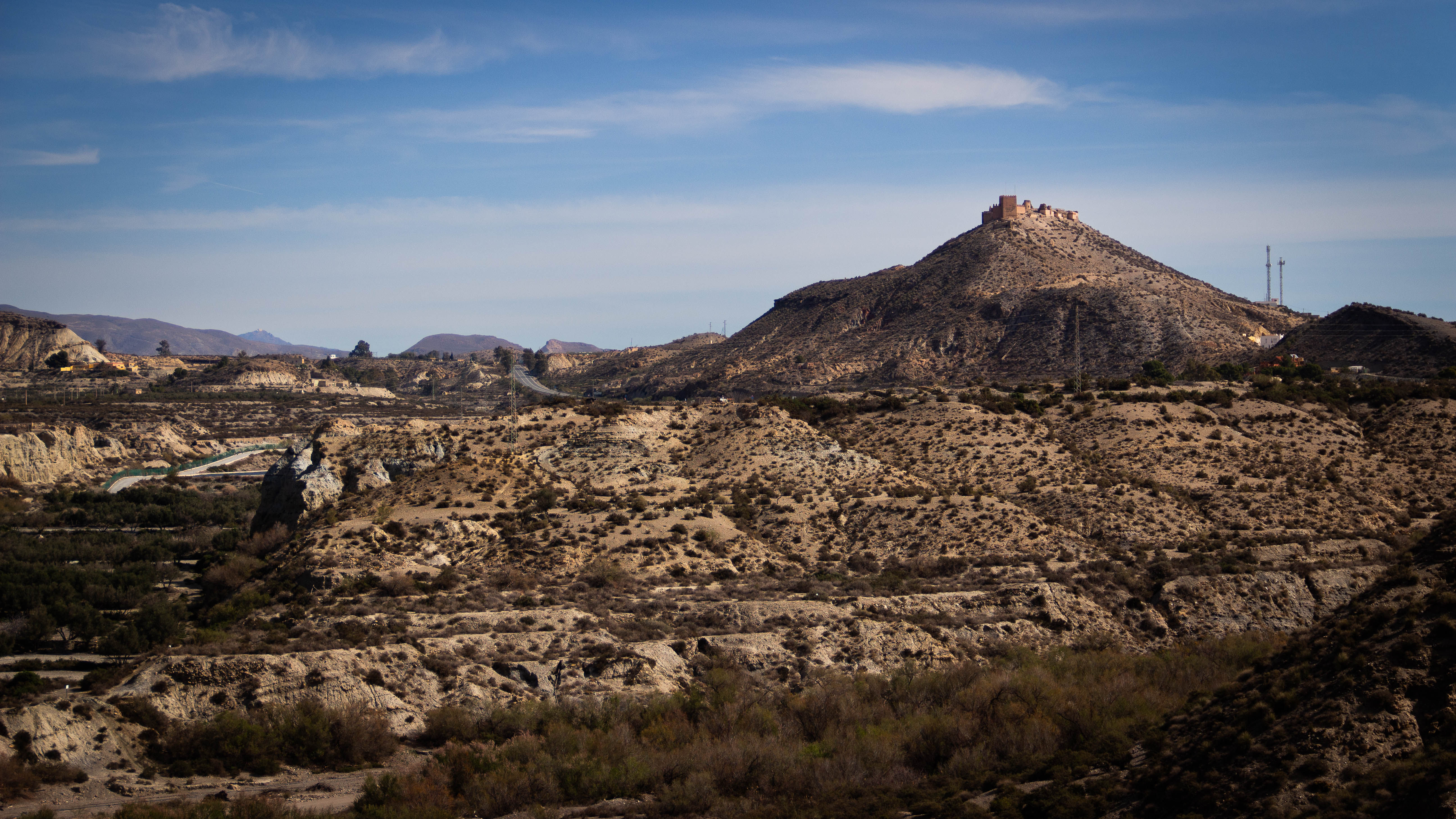 Am Morgen verlassen wir nach herrlich ruhiger Nacht unseren Stellplatz am Flugfeld. Der Tag hatte mit einem wundervollen Sonnenaufgang begonnen und wir sind voller Tatendrang. Es ist ein schönes Gefühl ein (fast) wieder hergestelltes Mobil zu haben. Zur Sicherheit machen wir unseren Wassertank randvoll, denn wir haben noch keinen genauen Plan, wo heute Nacht und evtl. morgen Abend sein werden. Zunächst geht es die N340 entlang in die Wüste um Tabernas. Dies hatte ich mir schon zu Hause vorgenommen. Auf dem Weg dahin sieht es zunächst ganz ähnlich aus wie im Großteil von Andalusien: karge Landschaft, bewässerte Olivenbäume, soweit das Auge reicht.
