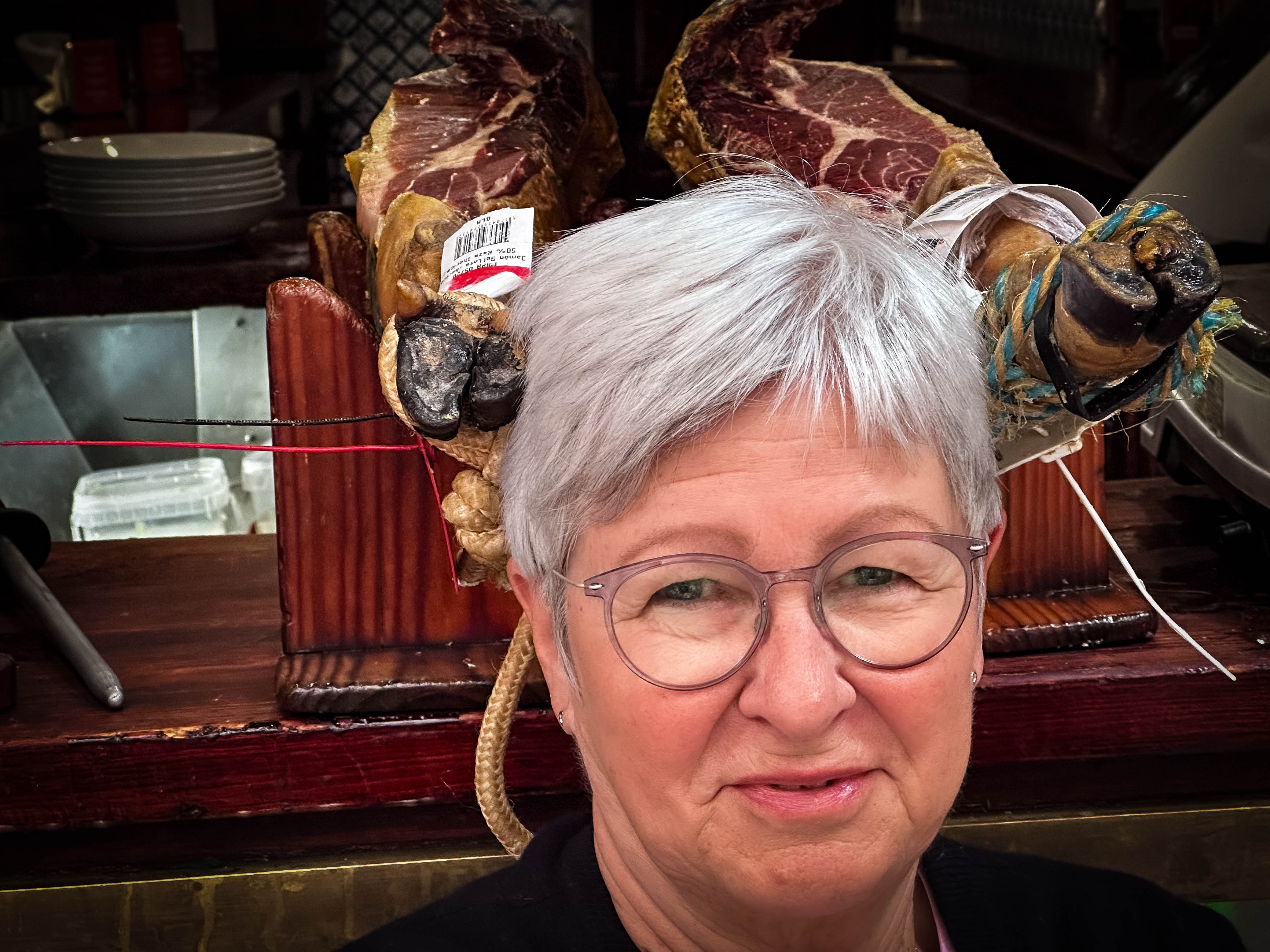 Naja, eigentlich fahren wir nur über die Plaza de España und direkt in die Altstadt. Da der Himmel es heute nicht gut mit dem Fotografen meint, stimme ich zu. Beim schmackhaften Essen in einer Bodega der Juderia wachsen meiner lieben Frau plötzlich Hörner, die aber ganz nach traditionellem Ibericoschinken aussehen.