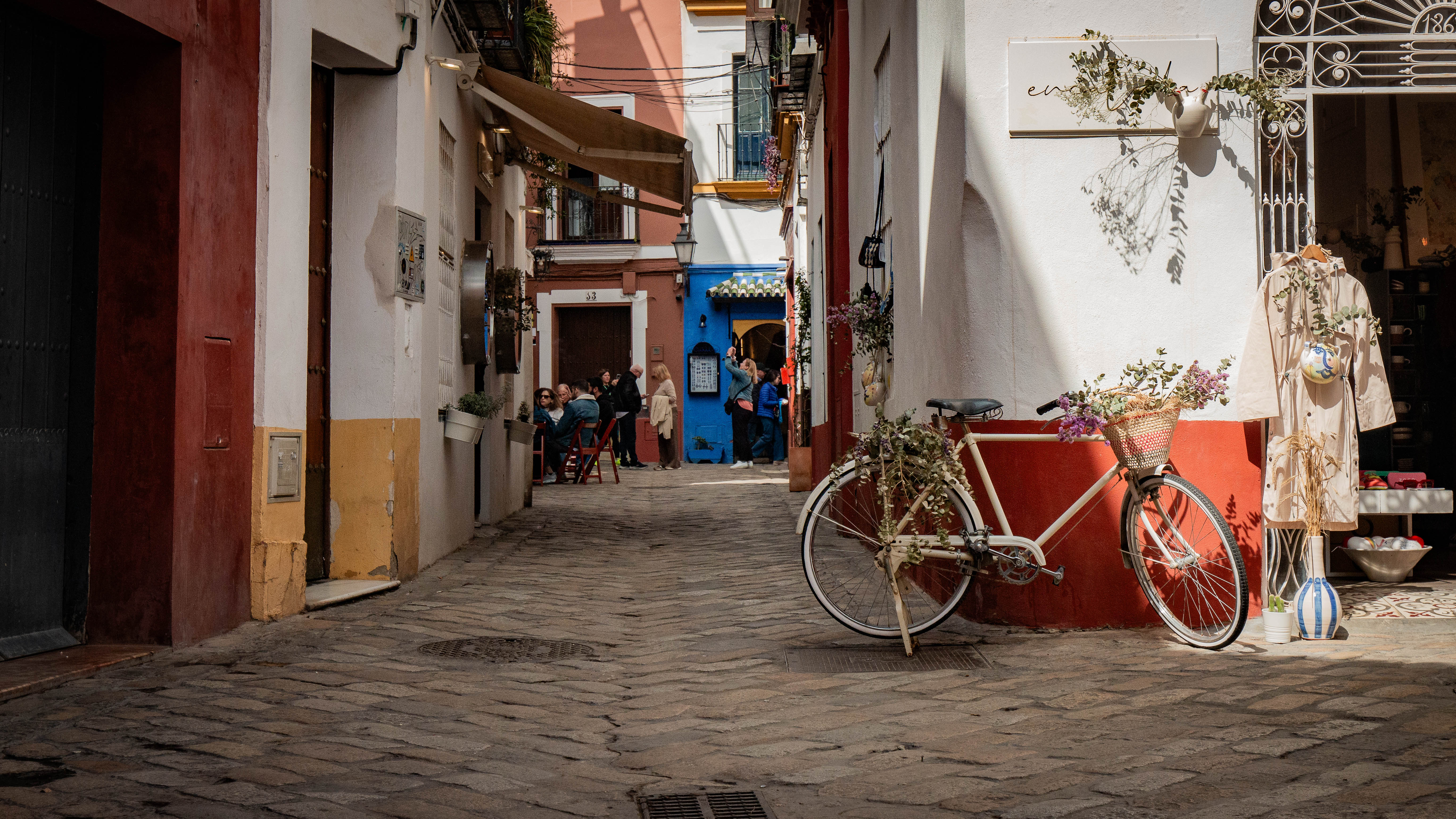 Viele Gassen in den Altstadtvierteln sind so schmal, dass wir die Räder über weite Strecken schieben müssen. Am der Plaza de Santa Cruz schliessen wir unsere Fahrräder an einem herrlichen Orangenbaum fest und starten unsere Erkundungstour zu Fuss. Ein verstecktes Mahnmal erinnert hier an das traurige Ende des ursprünglichen Viertels.