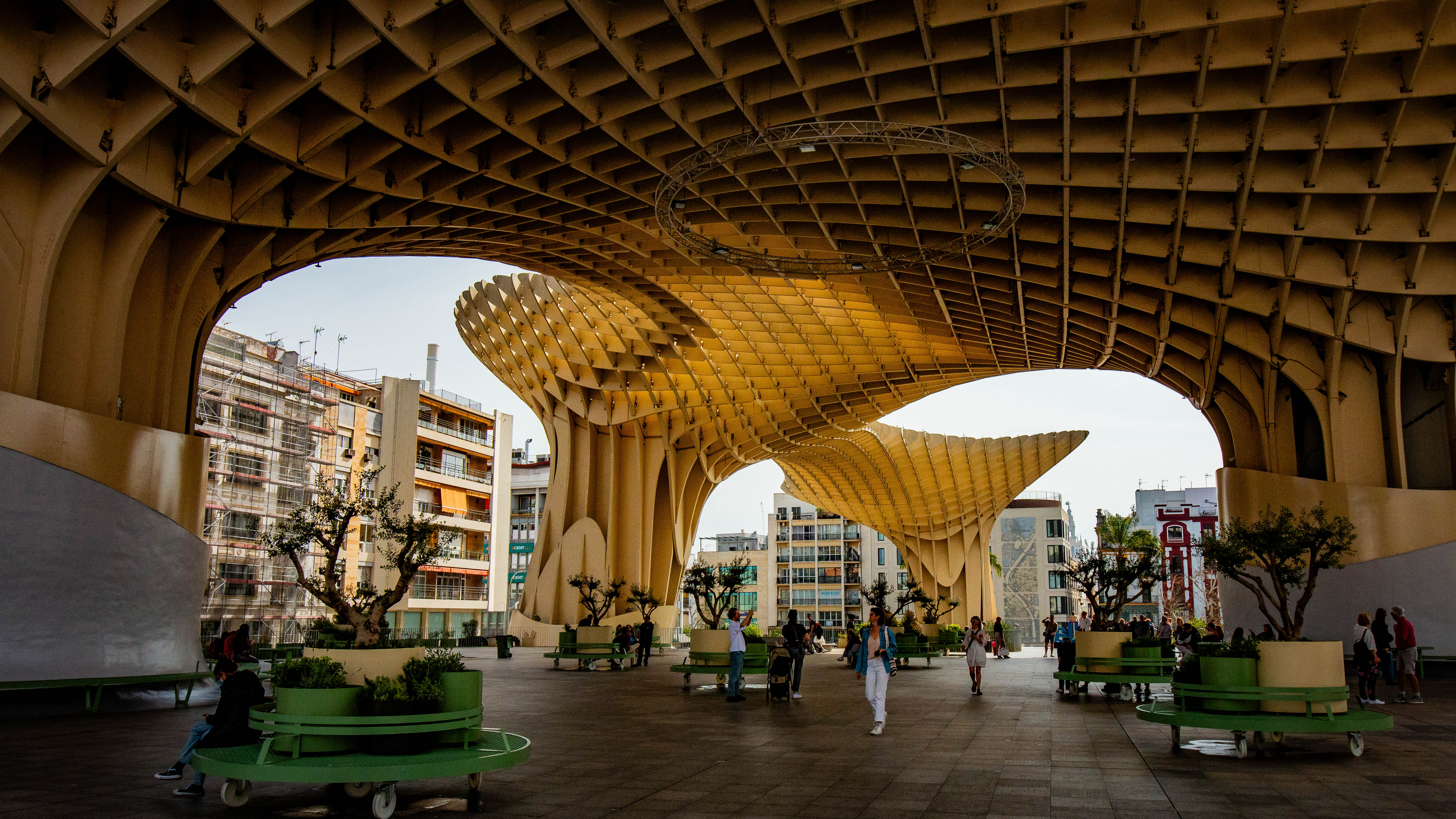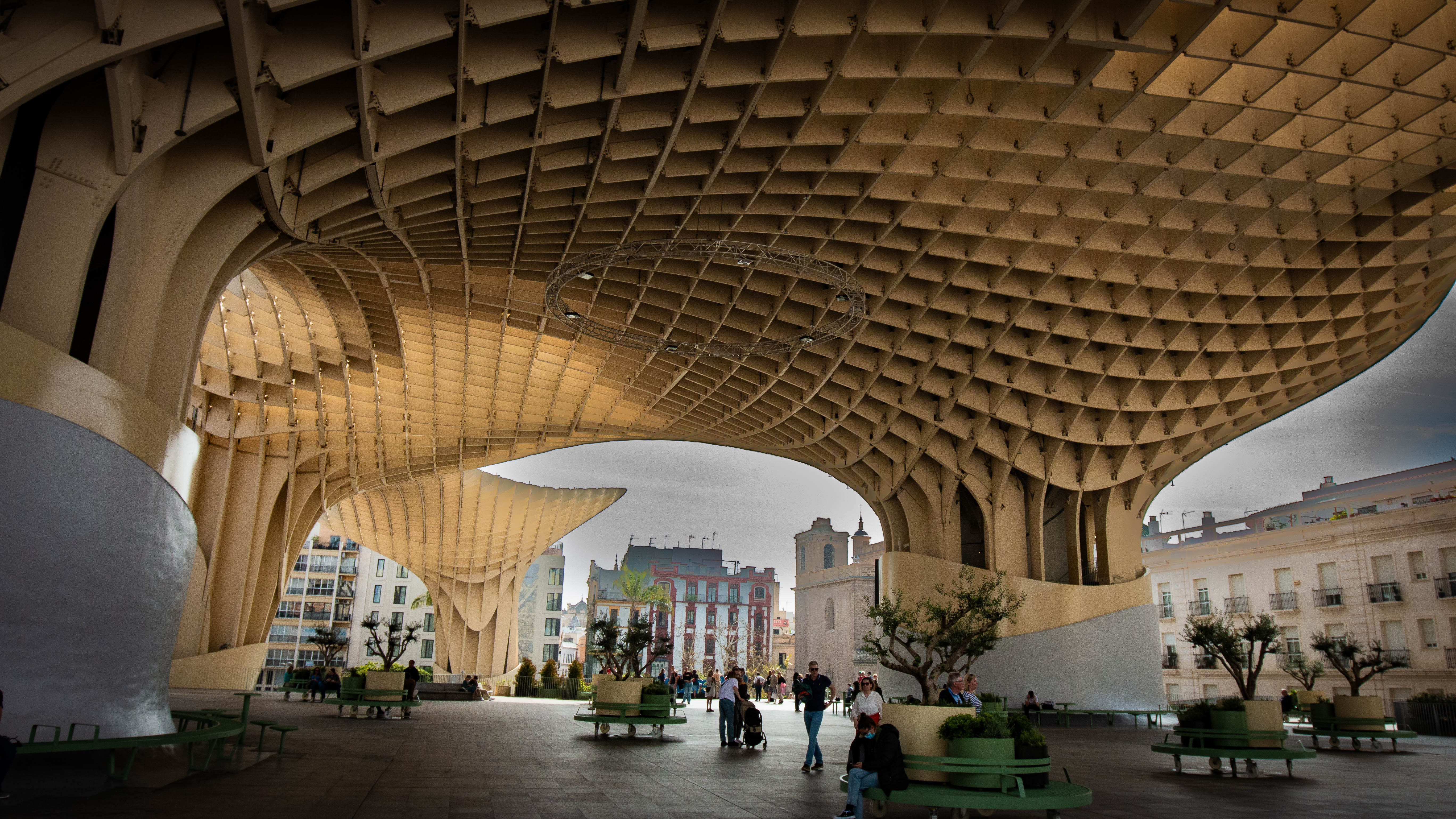 Wir schlängeln uns, im wahrsten Sinne des Wortes, durch zum Parasol Metropole, einer beeindruckenden Holzkonstruktion an der Plaza de la Encarnatión. Mit dem Lift geht es hinauf zu einem phantastischen Rundblick über Sevilla.