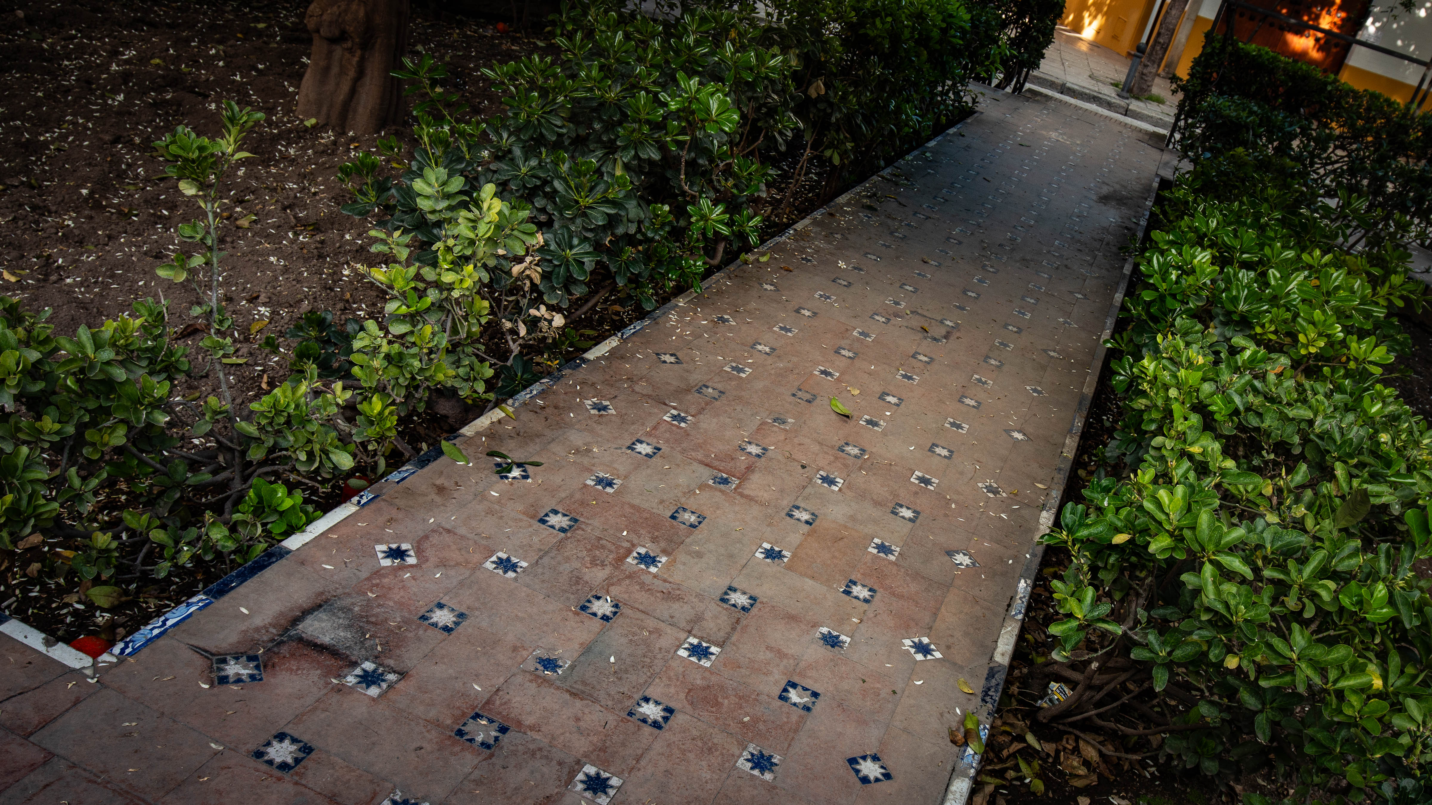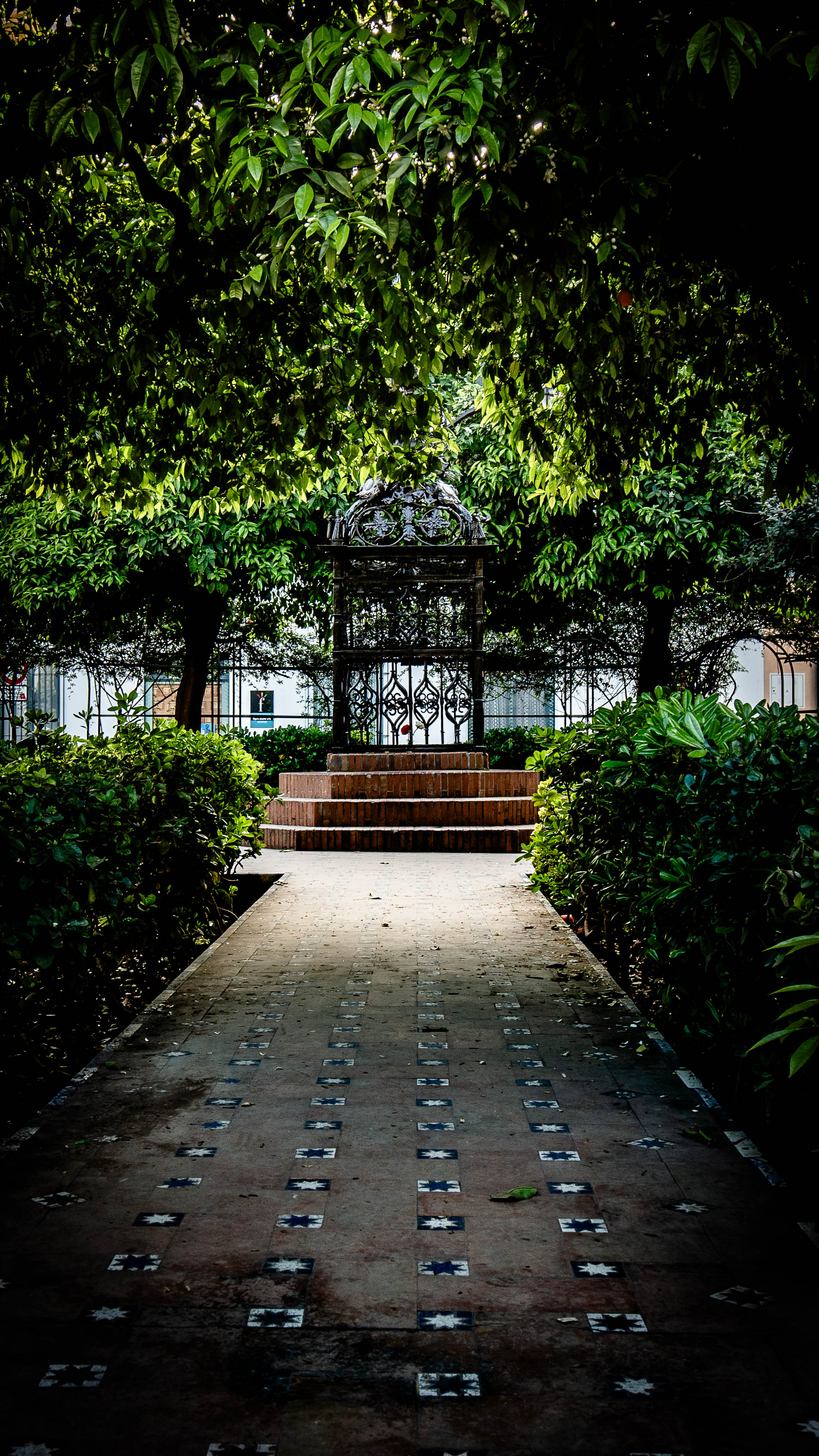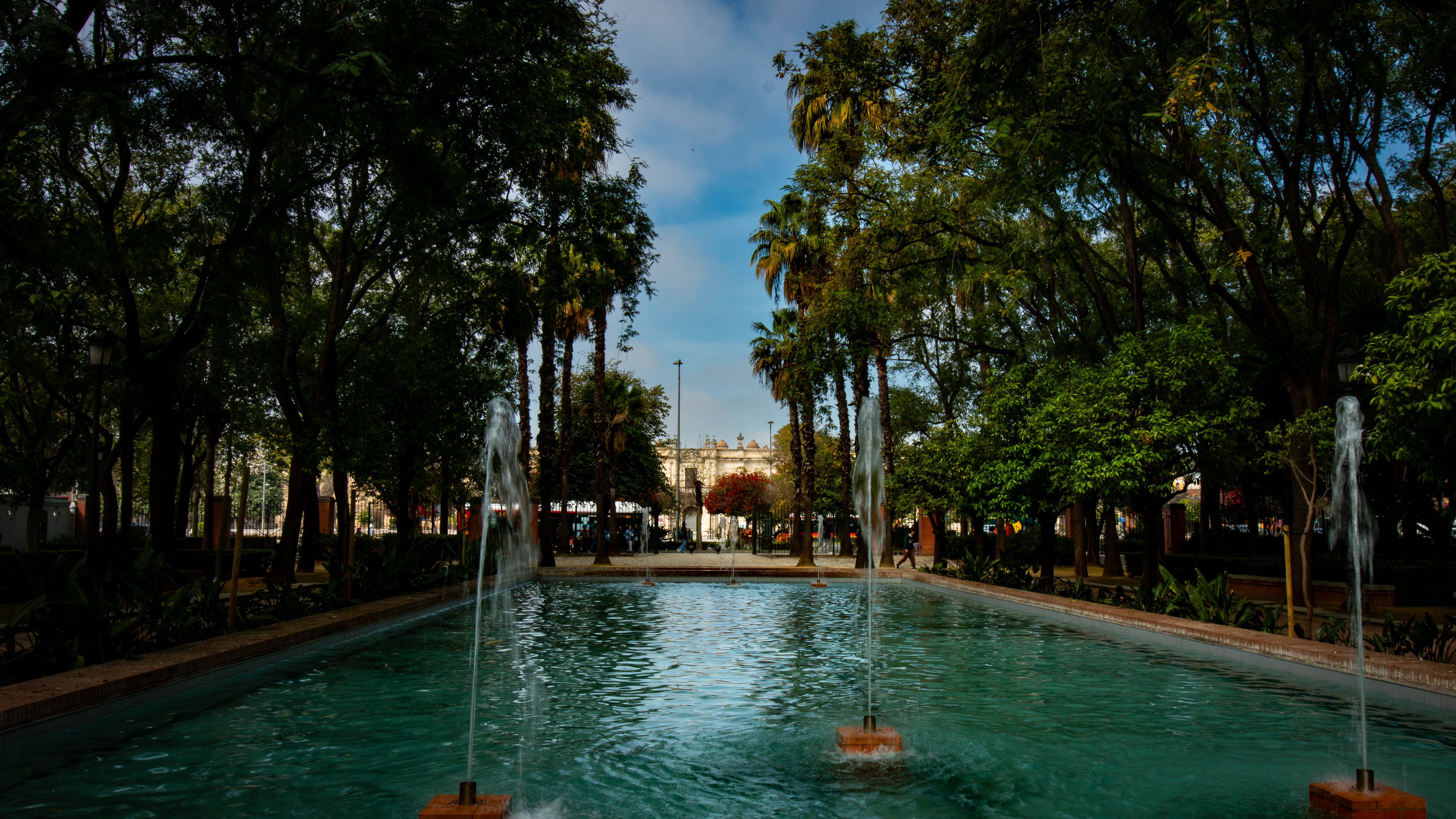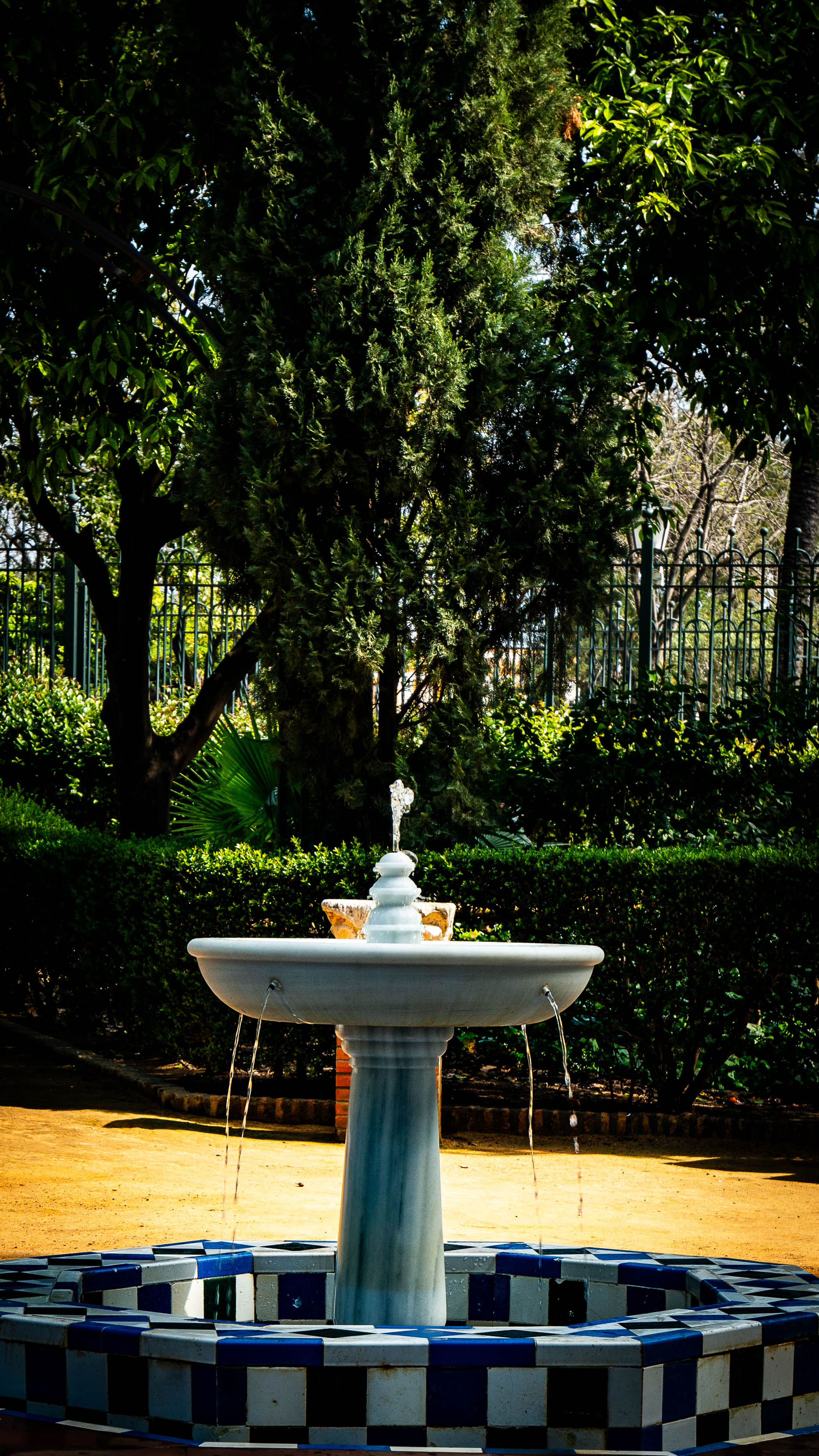Bald fallen wir aber in unser eigenes Tempo zurück, auch weil ich die Kamera dabei habe. Wir durchstreifen den Park des Alcazar, der gerade geöffnet wird. Der Verkehr ausserhalb der Parks ist sehr stark und trotz der vielen Velorouten ist das Radfahren nicht ohne: Hauptgrund sind die Unmassen an E-Scootern, die hier offenbar keinerlei Geschwindigkeitsbegrenzung unterliegen, und scheinbar sind alle getunt. Mit einem Affenzahn schlängeln sie sich sich über Rad- und Fusswege, wechseln unvermittelt die Richtung und überholen Dich im Zentimeterabstand. Dazwischen die Massen an Fussgängern, für die die Abgrenzungen der Fahrradwege nur optional sind: in aller Seelenruhe benutzen sie diese auch als Gehweg oder bleiben auch mal für einen Klönschnack mit einem zufällig getroffenen Bekannten mitten drauf stehen. Aber alle sind tief entspannt und trotzdem irgendwie rücksichtsvoll aufeinander. Und oft hört man ein „Perdón!“, wenn man sich mal ausnahmsweise mit der Fahrradklingel Platz schaffen muss. Das Gehupe der Autos, das man aus anderen, besonders südlichen Großstädten kennt, scheint hier jedenfalls schwer verpönt.