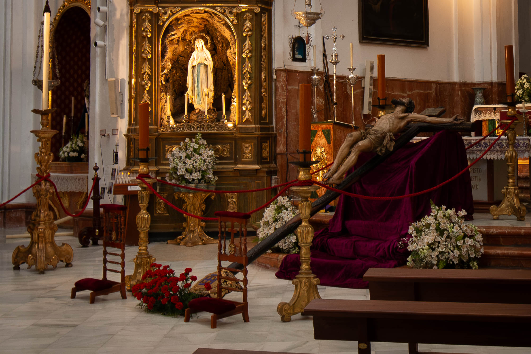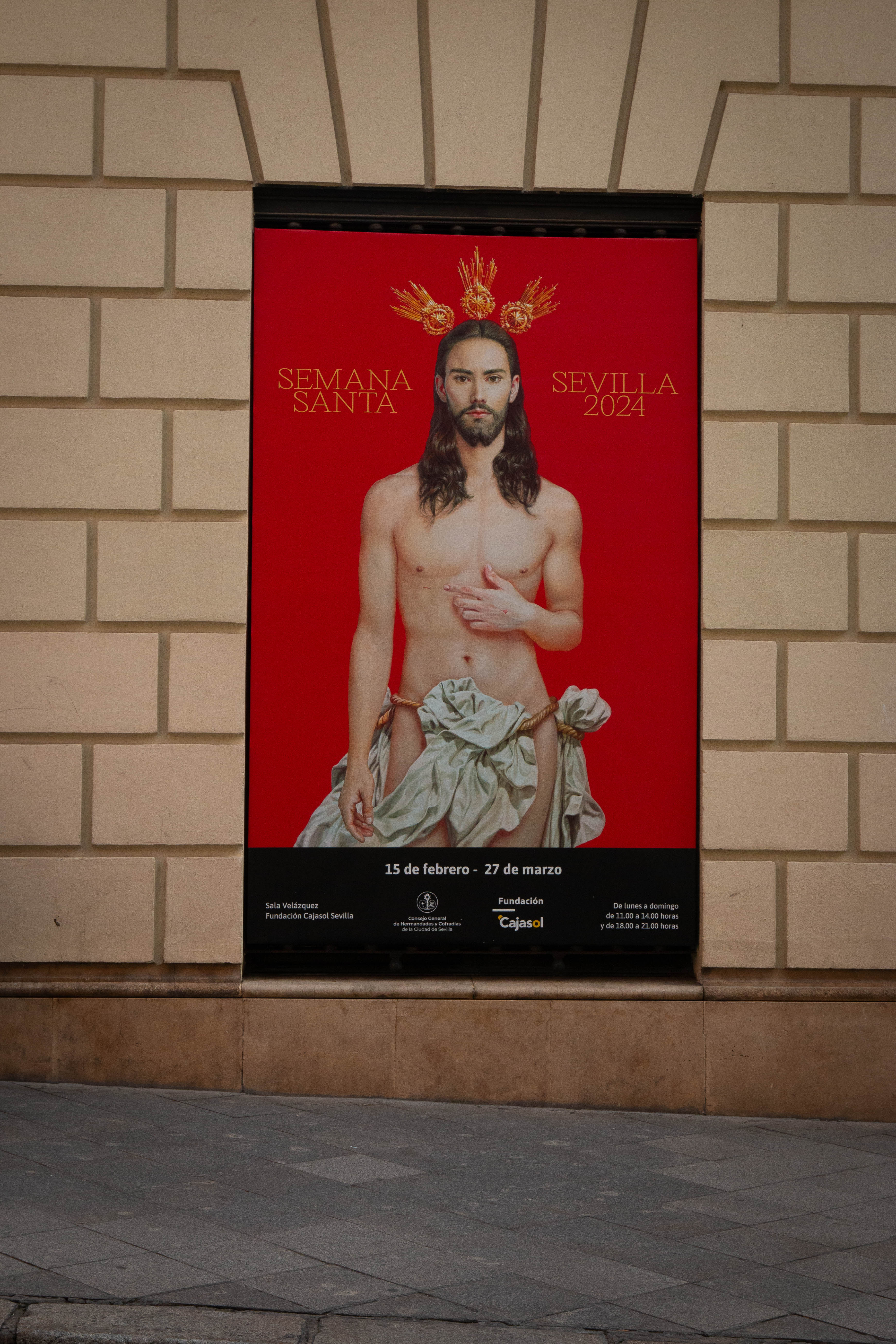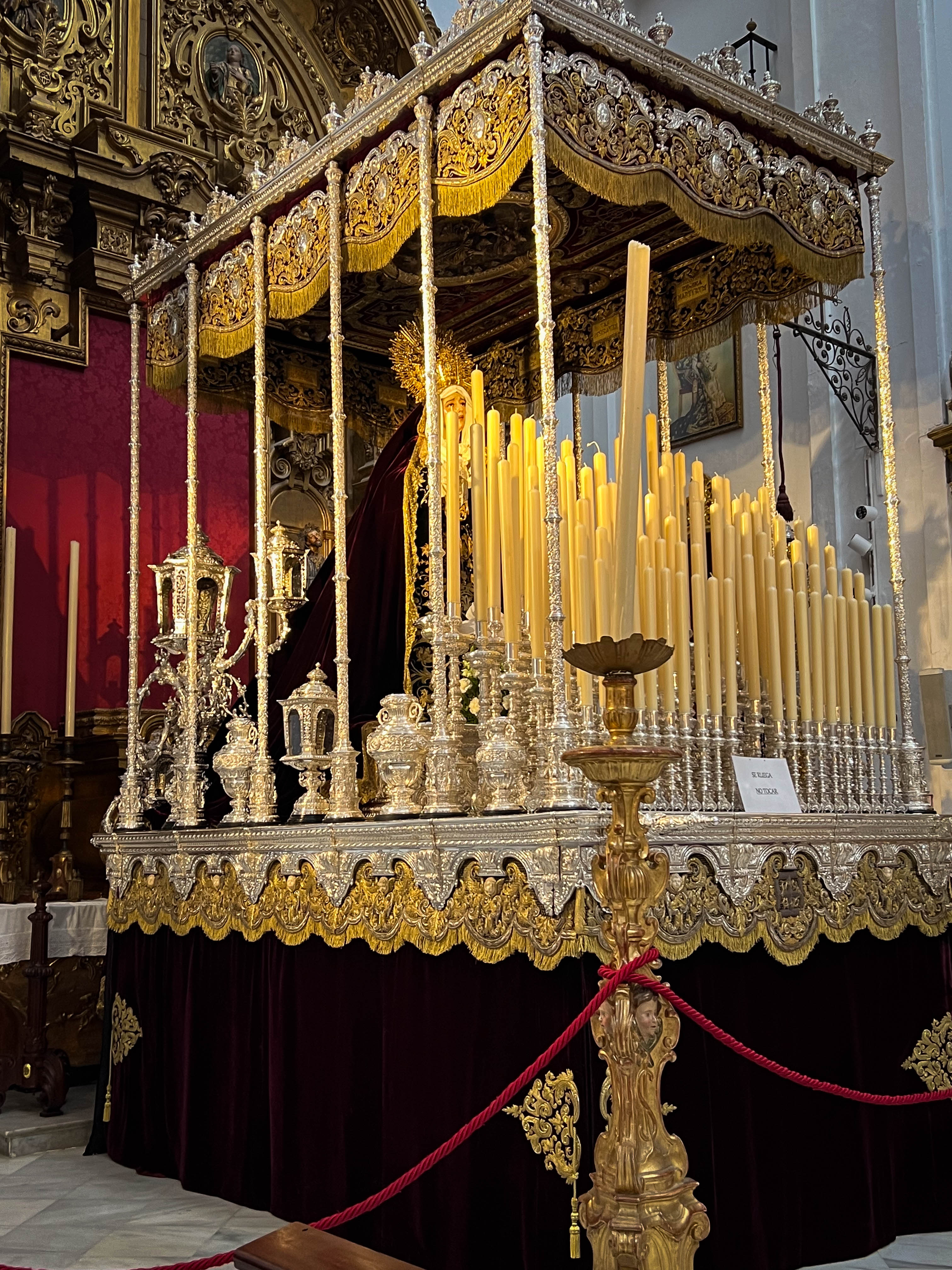 Aber zurück ins hier und heute. Wirklich atemberaubend eng sind hier teilweise die Gassen, unvermittelt stößt man auf einen kleinen Platz, es gibt so viel zu Entdeckern, kleine Läden, Cafés, Bodegas, Tapasbars, daneben eine alte Kirche, eingezwängt in die Häuserreihen, bei der man, bei genauem Hinsehen ihre wechselvolle Geschichte erahnen kann. Drinnen stehen bereits die großen Kruzifixe und Marienaltäre bereit, die in der Semana Santa, der Karwoche, in riesigen Prozessionen durch die Städte getragen werden. Das diesjährige Plakat zur Semana Santa wird in Sevilla heiss diskutiert, wegen seiner angeblich homoerotischen Darstellung des Jesus.