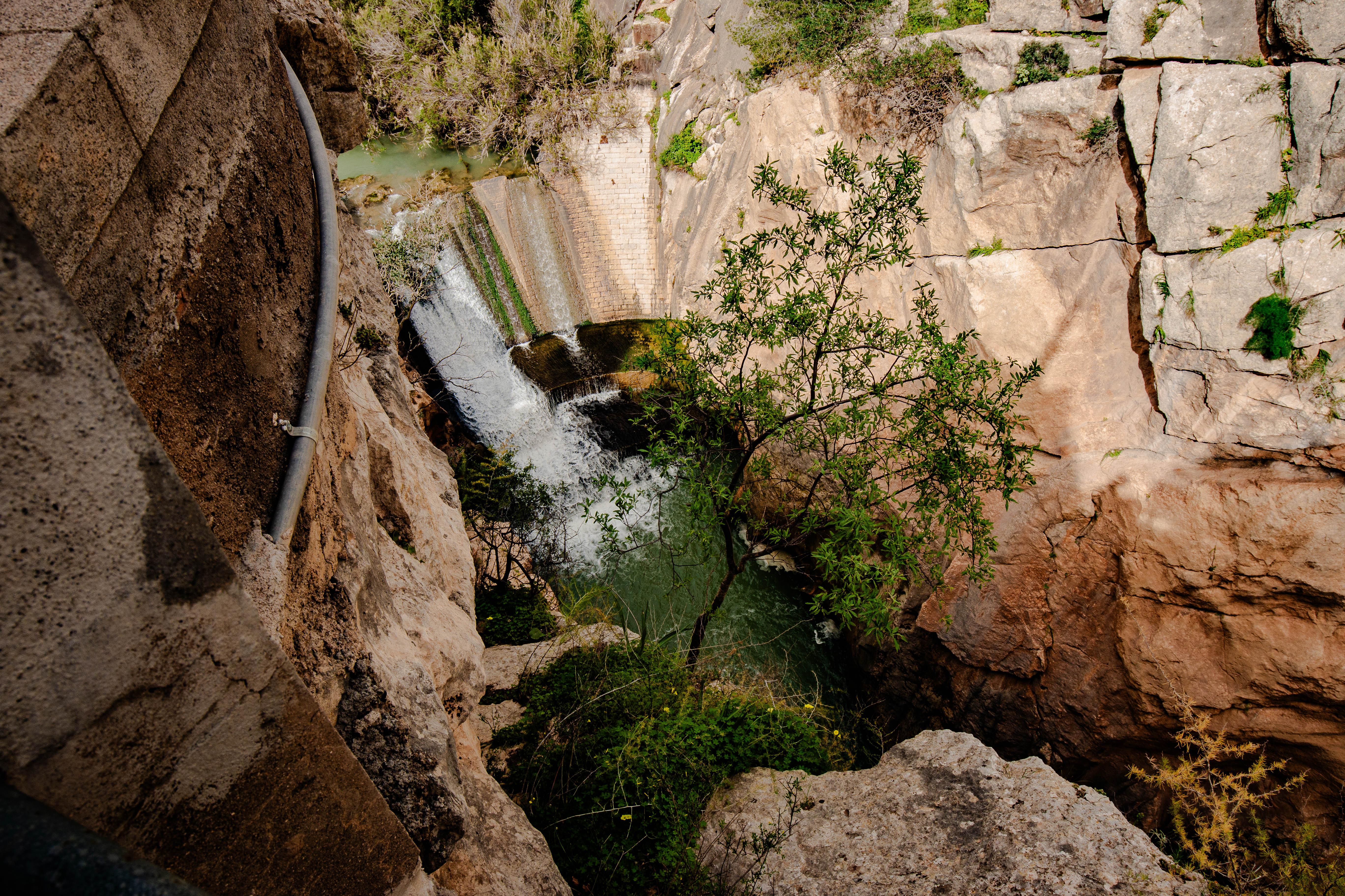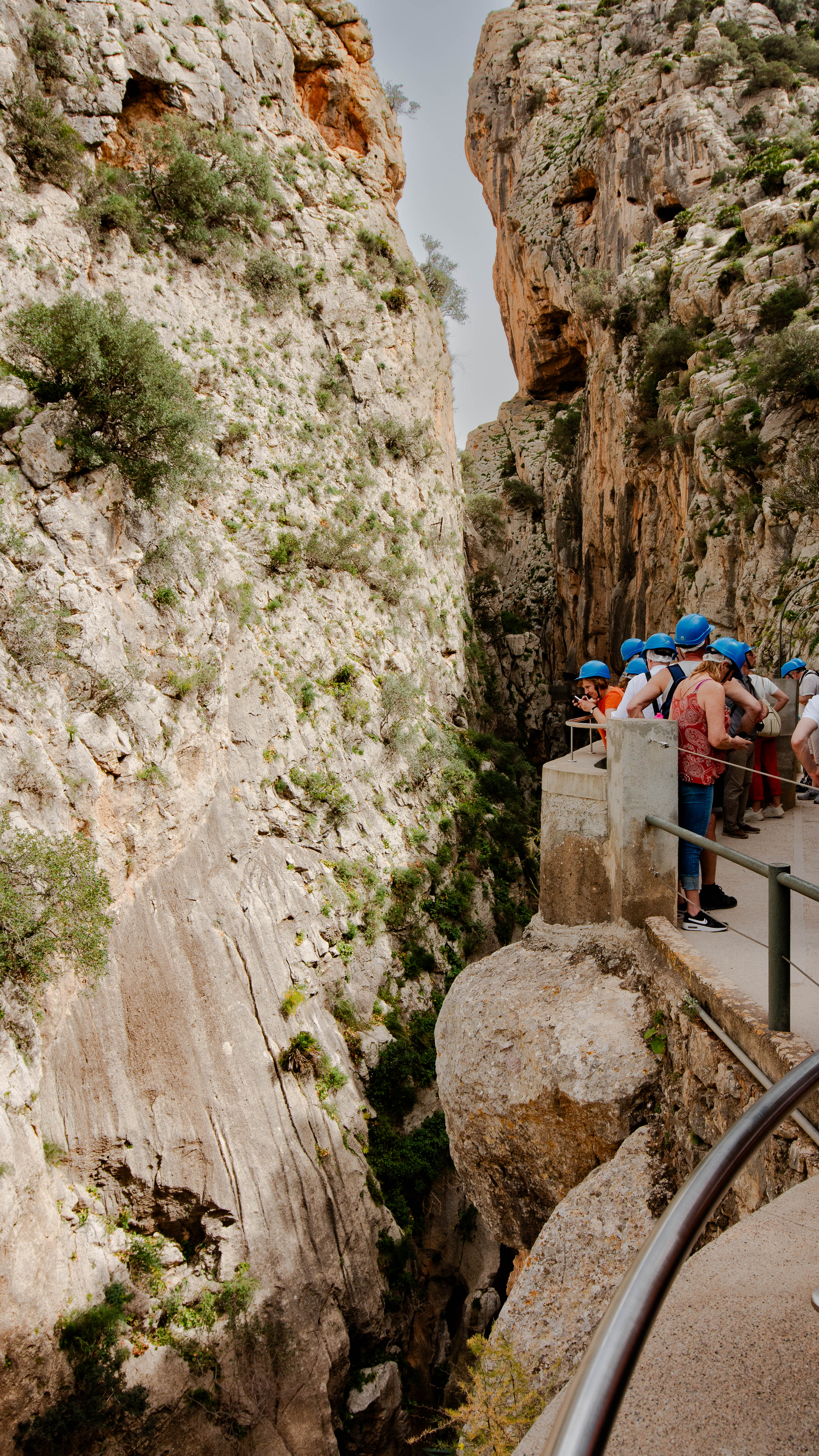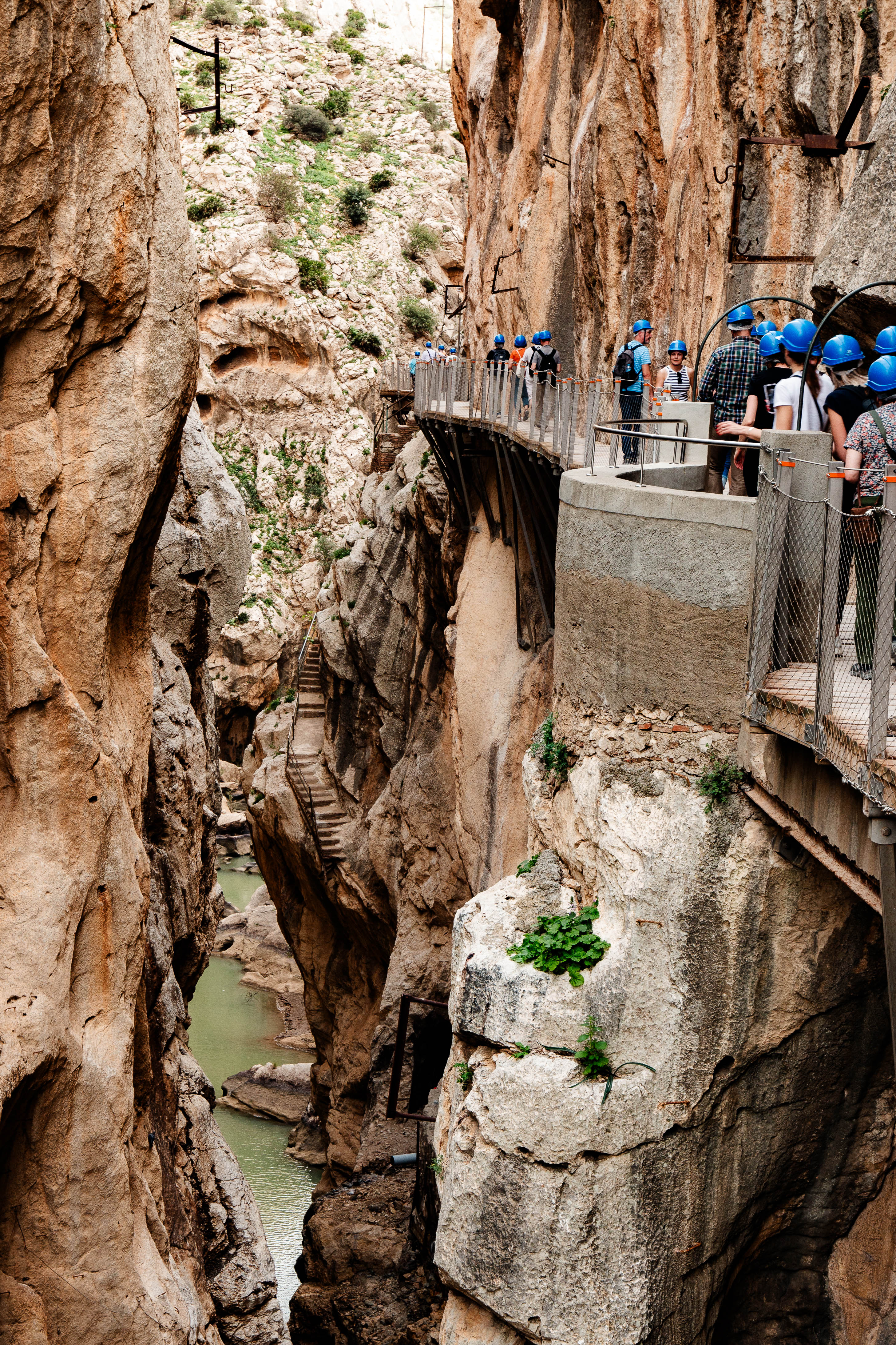 Jetzt ist es soweit, ich stehe am Eingang, bekomme einen hübschen, blauen Helm verpasst, er ist absolut obligatorisch zu tragen, dazu eine Sicherheitsunterweisung: absolut kein Verlassen des Weges, keine Hinterlassenschaften irgendwelcher Art, weil Naturschutzgebiet, keine Selfiesticks, keine großen Rucksäcke, keine Kinder unter 8 Jahren, usw. usw. Die Zeit zum Durchqueren: ca. 2 1/2 Stunden, wenn man, wie ich, fotografieren will. Der Weg beginnt harmlos, ein Spazierweg, doch nach wenigen 100 Metern kommt mir ein Ehepaar entgegen, sie: kreidebleich. Auf die Frage, ob alles in Ordnung sei kommt die Antwort von ihr: „Ich muss zurück, das hier kann ich nicht!“. Und tatsächlich, nach ein paar weiteren Metern geht es dann „zur Sache“. Höhenangst ist hier leider sehr kontraproduktiv, Adrenalin wird produziert, angesichts der engen Schlucht, den gewaltigen Felsformationen und vor allem der Höhe, bzw. der Tiefe von sicher 50 Meter, in die man hinunter auf den Fluss blickt, der sich durch die enge Schluckt zwängt.