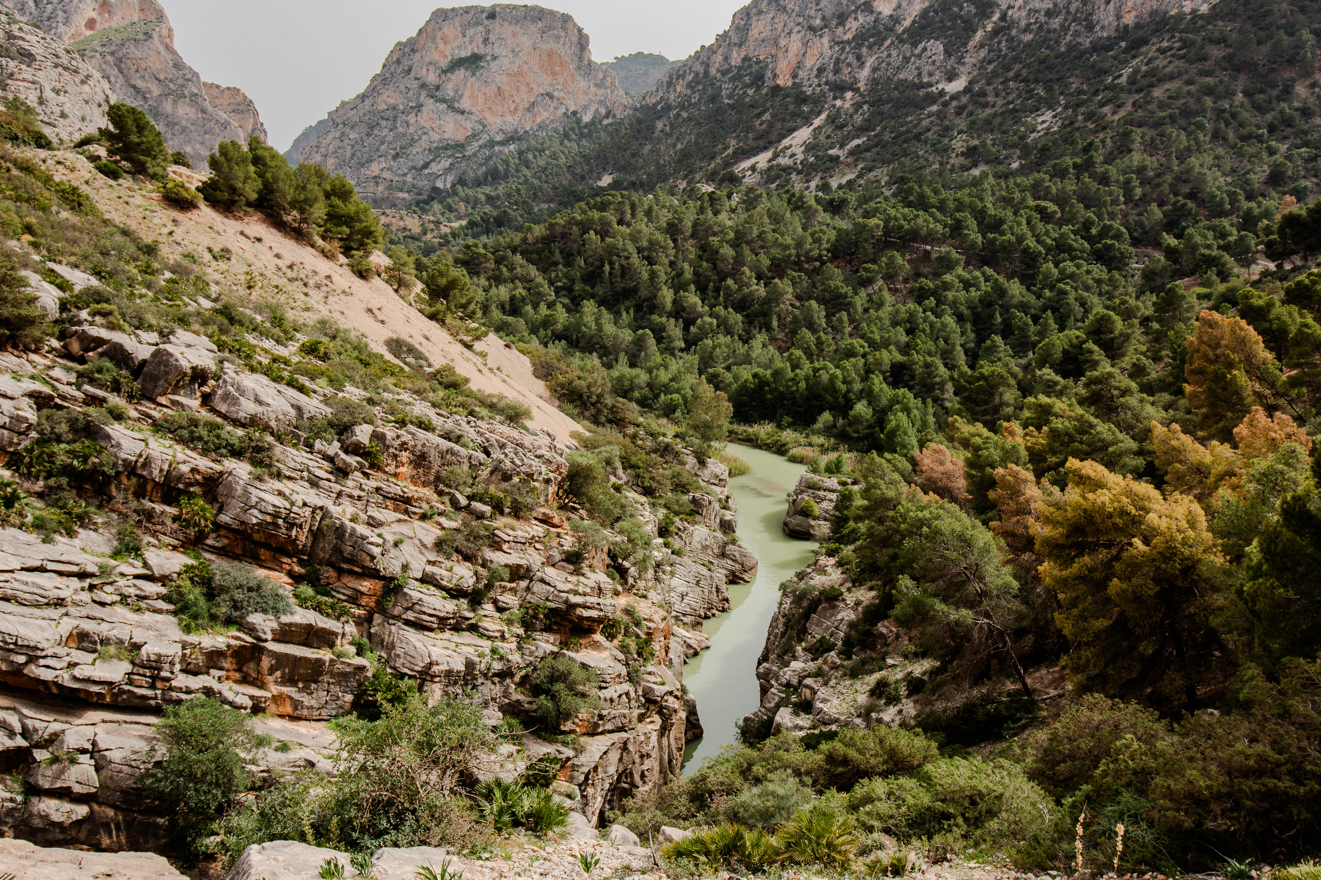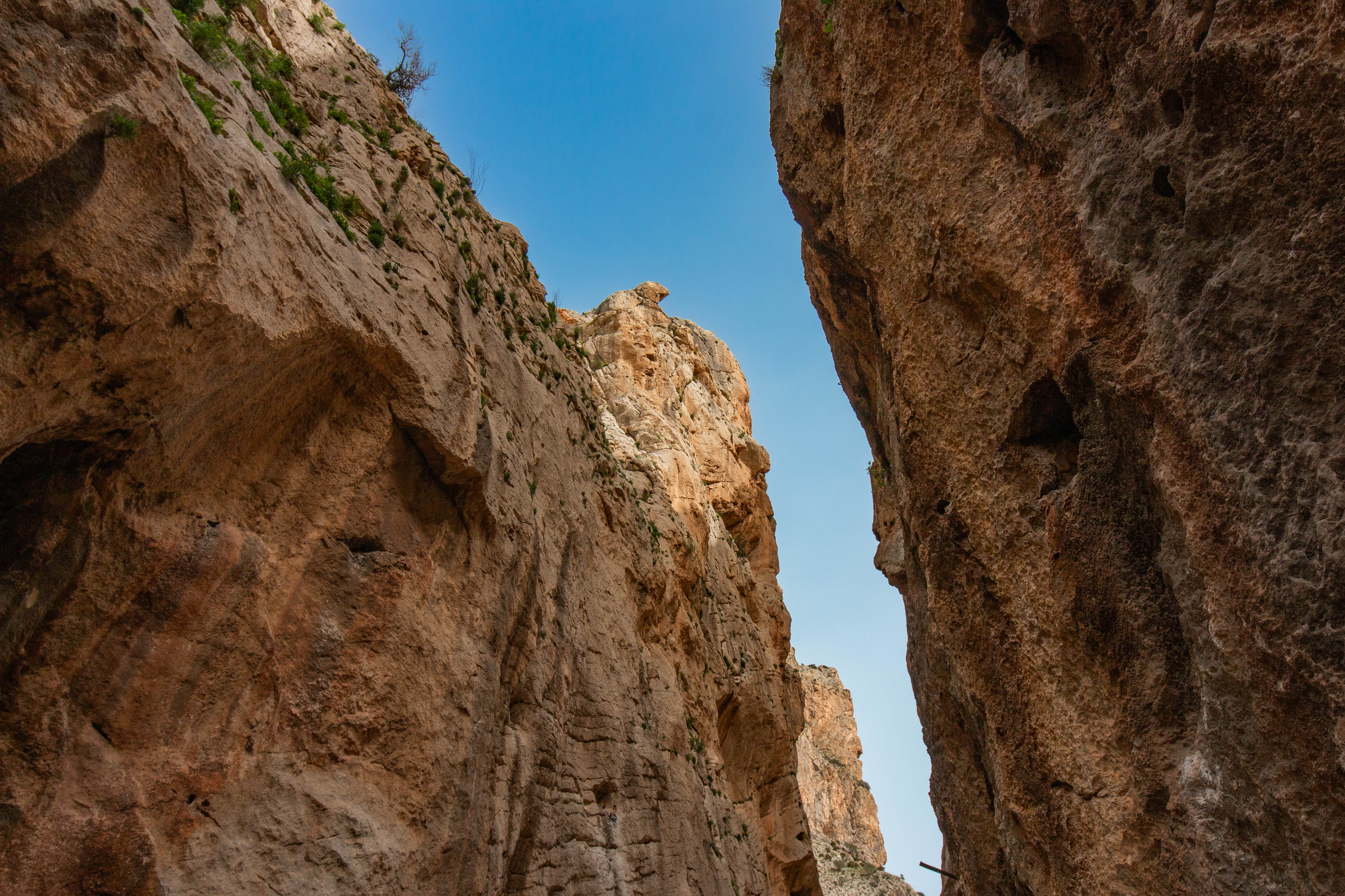 Es geht durch die südliche Schlucht in Richtung Ausgang. Steil fallen die Felswände, die jetzt in einem ganz besonderen Licht erscheinen, tief hinunter ins enge Tal.