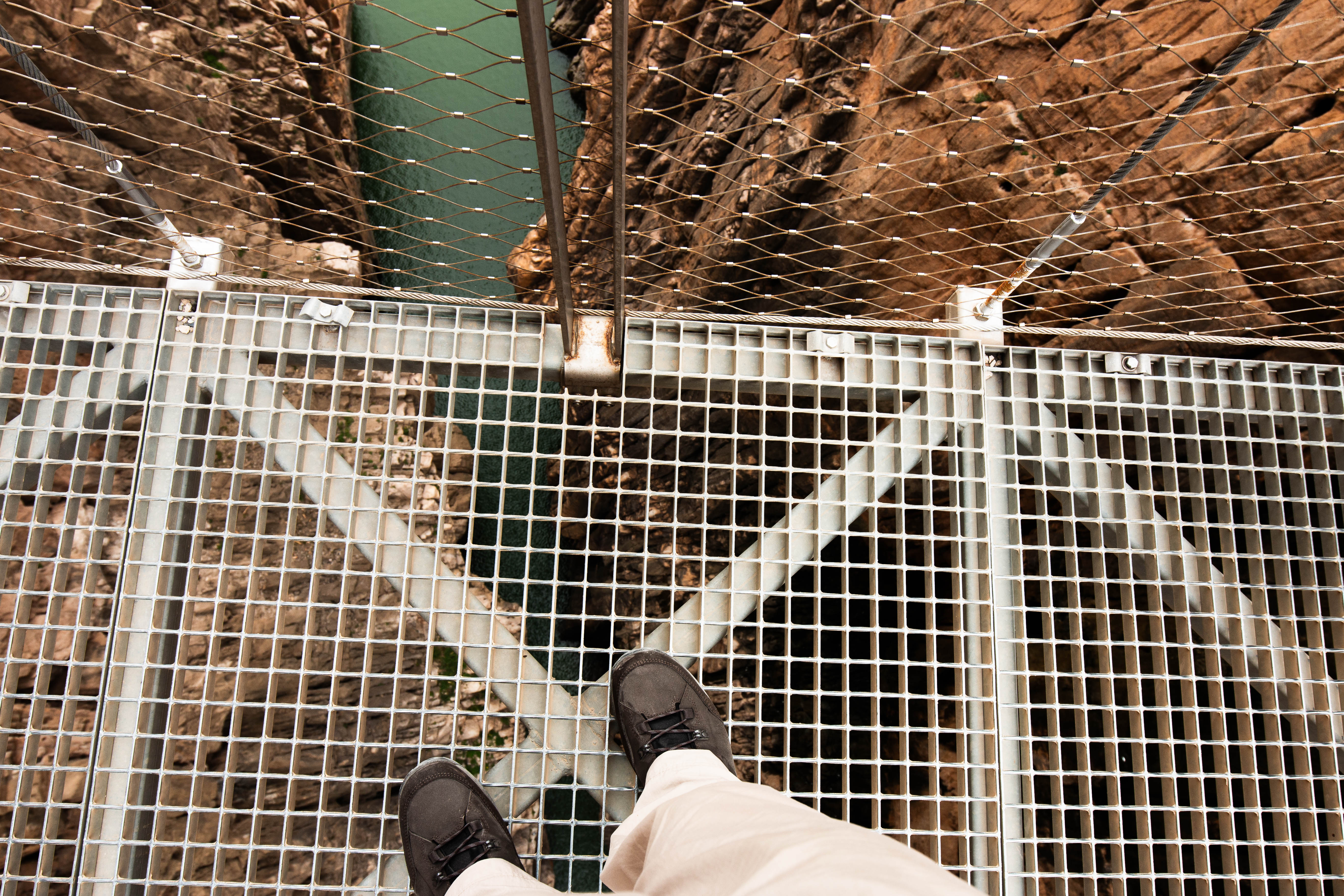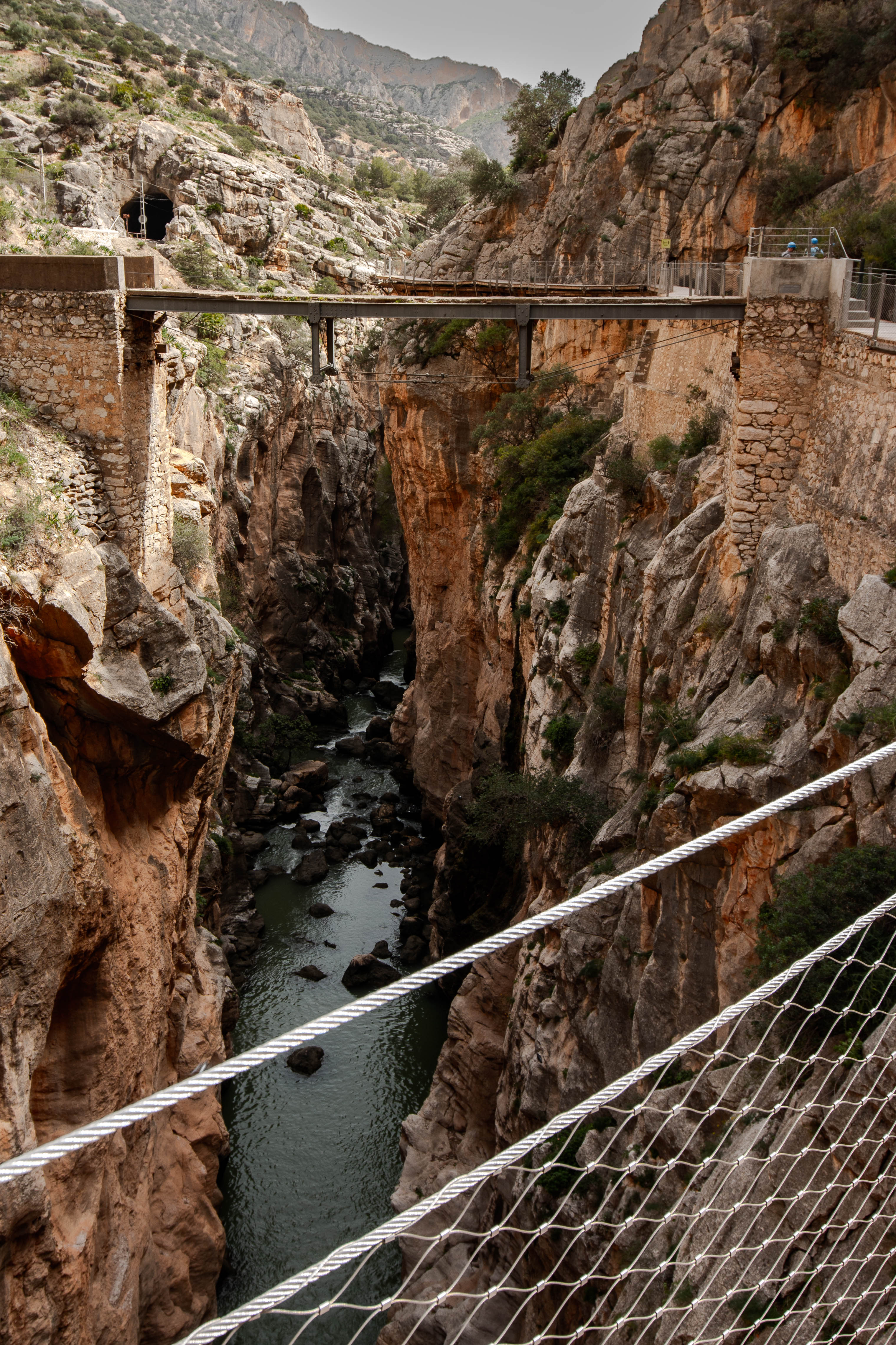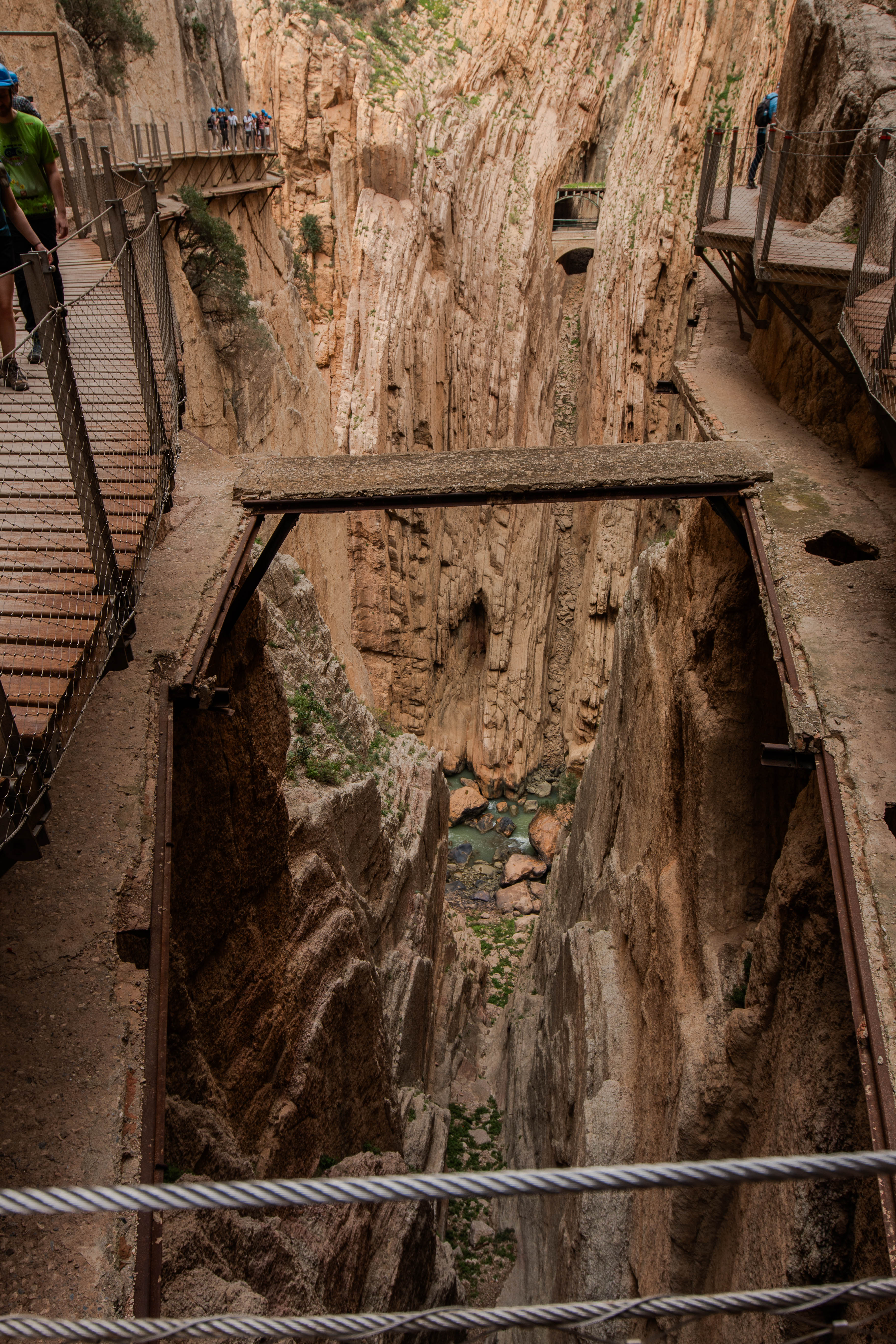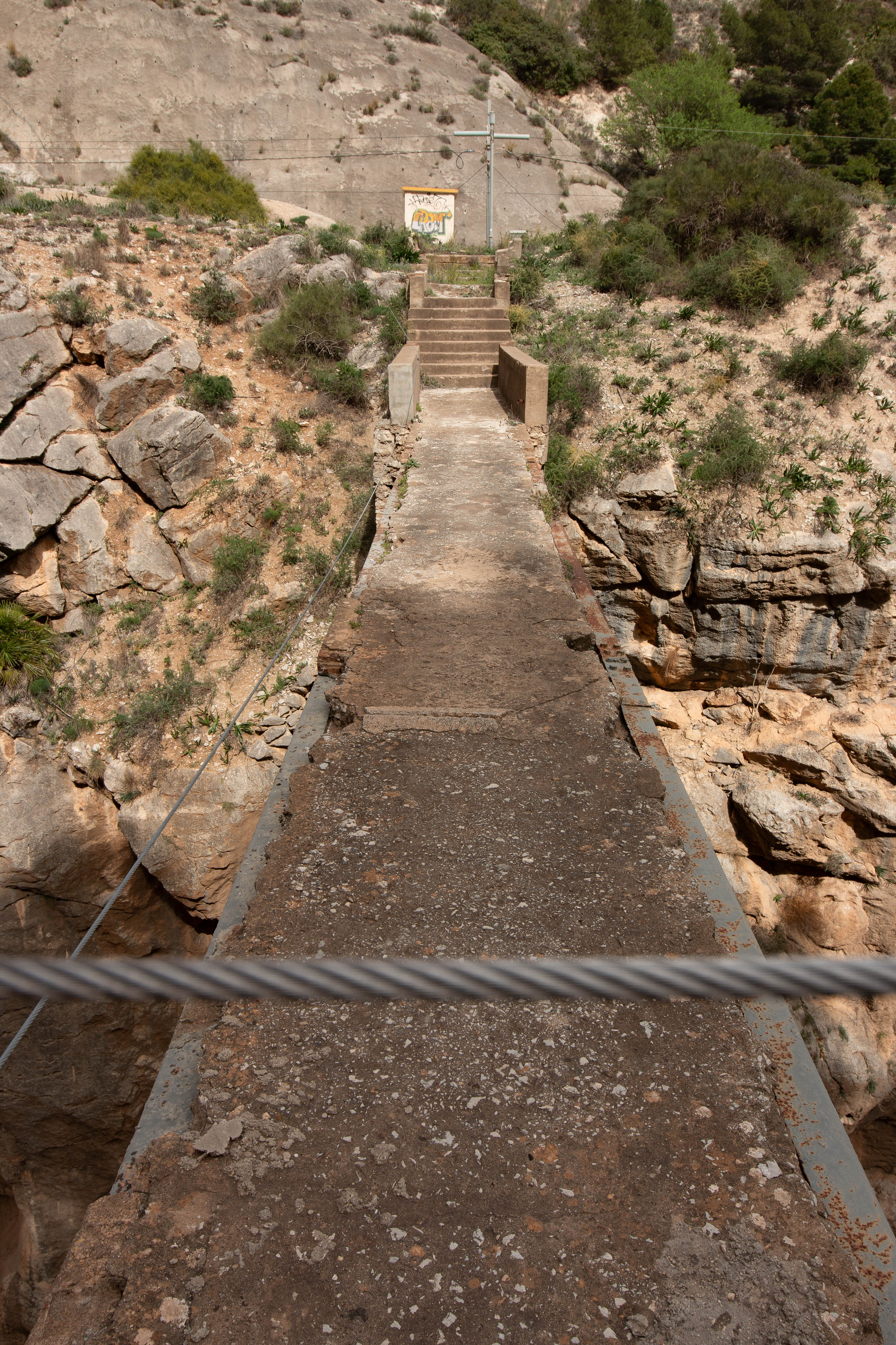 Nach etwa einem Drittel der Strecke führt der Weg kurze Zeit parallel zu der Bahnlinie auf der anderen Seite der Schlucht. Zwischen zwei Tunnels gibt es tatsächlich so etwas wie einen kleinen Bahnhof. Über diesen soll im absoluten Notfall, bei Blockade beider Zugänge, der Caminito evakuiert werden. Inwieweit jeder in einer solchen Situation die unten gezeigte Brücke ohne Geländer zu passieren bereit und in der Lage wäre, bleibt einmal dahingestellt.