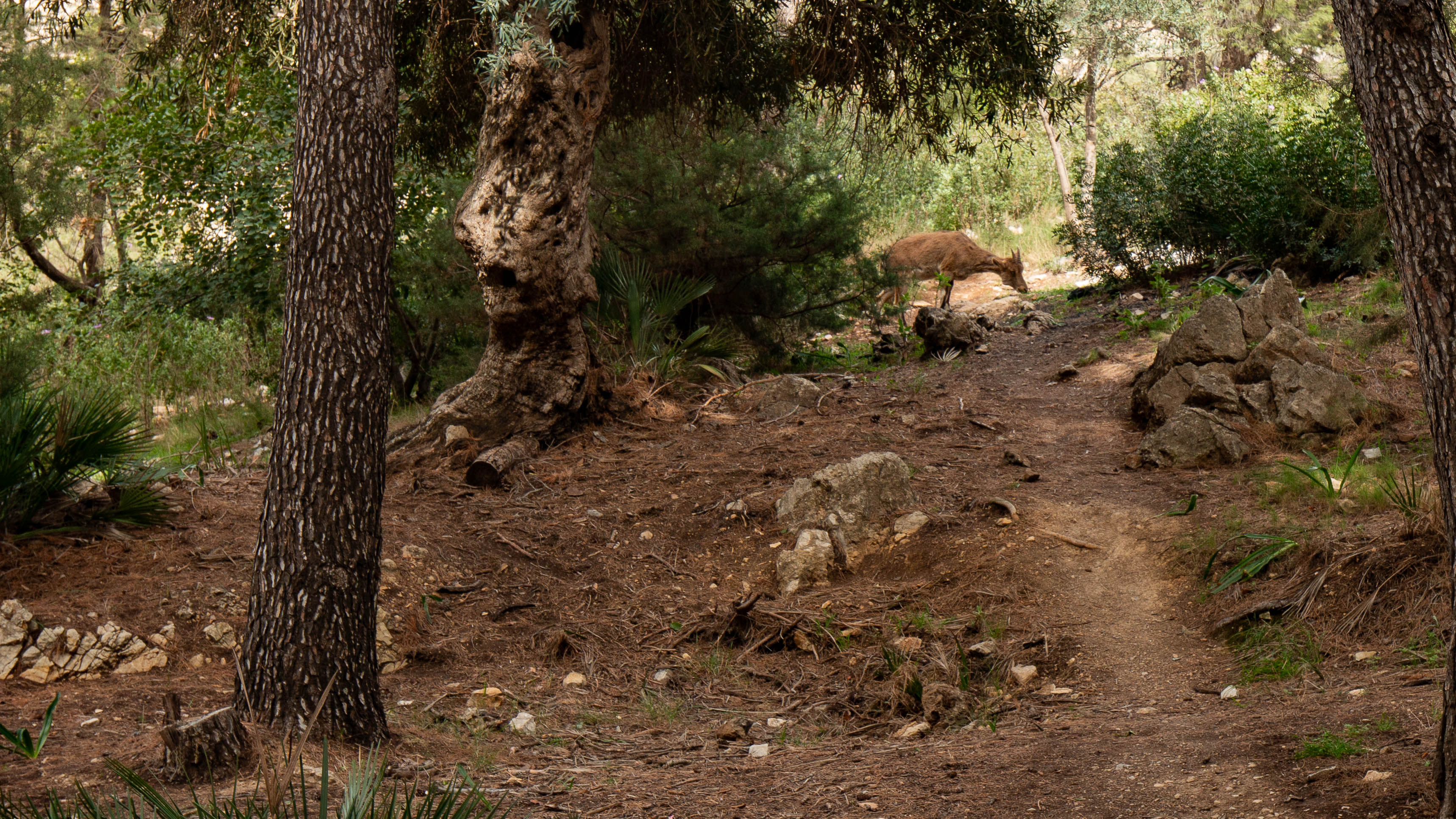 Bald weitet sich auf unserem Weg gen Süden die Schlucht und gibt den Blick frei auf eine Art Hochtal, dicht bestanden mit Aleppo-Kiefern, Johannisbrotbäumen und europäischen Palmen. In diesem äußerst geschützten Hochtal leben Ottern, diverses Wild und: Gänsegeier. Ich sehe die mächtigen Vögel im Flug, sie haben bis zu 2 1/2 Meter Spannweite und bringen 12 kg auf die Waage, aber leider kann ich sie nicht im Foto festhalten, ich habe lediglich ein Weitwinkelobjektiv dabei. Die Bergziege ist allerdings nahe genug.