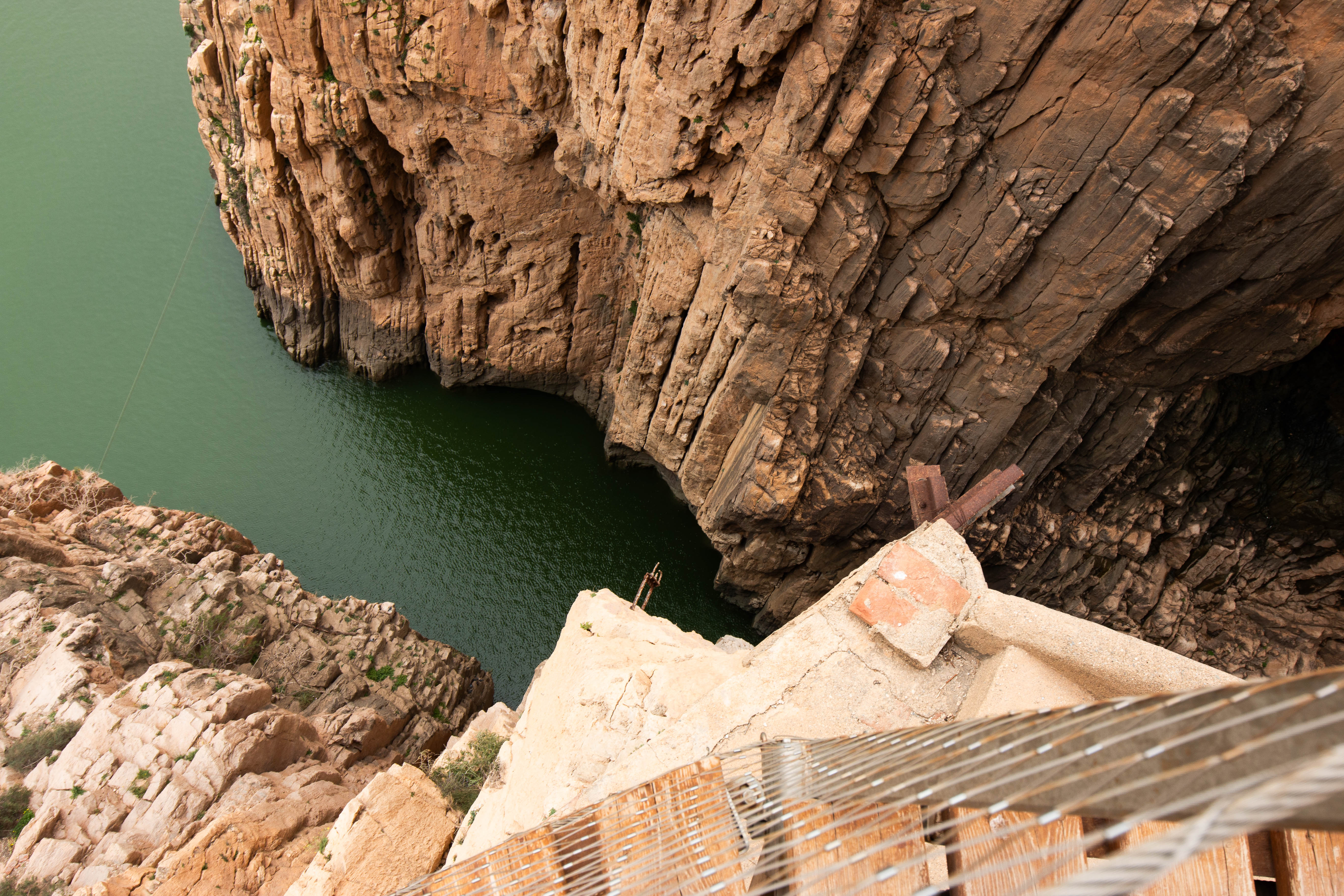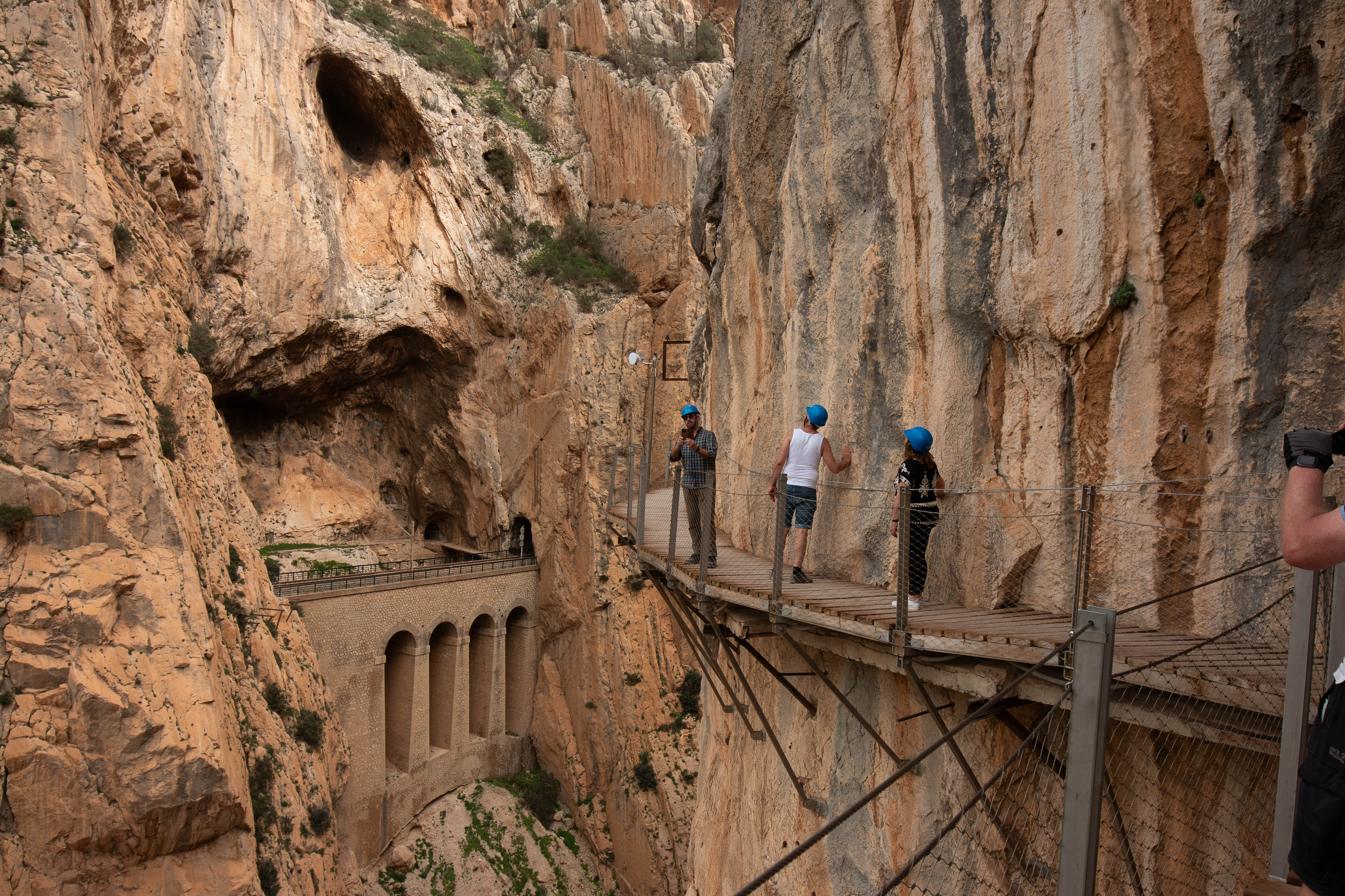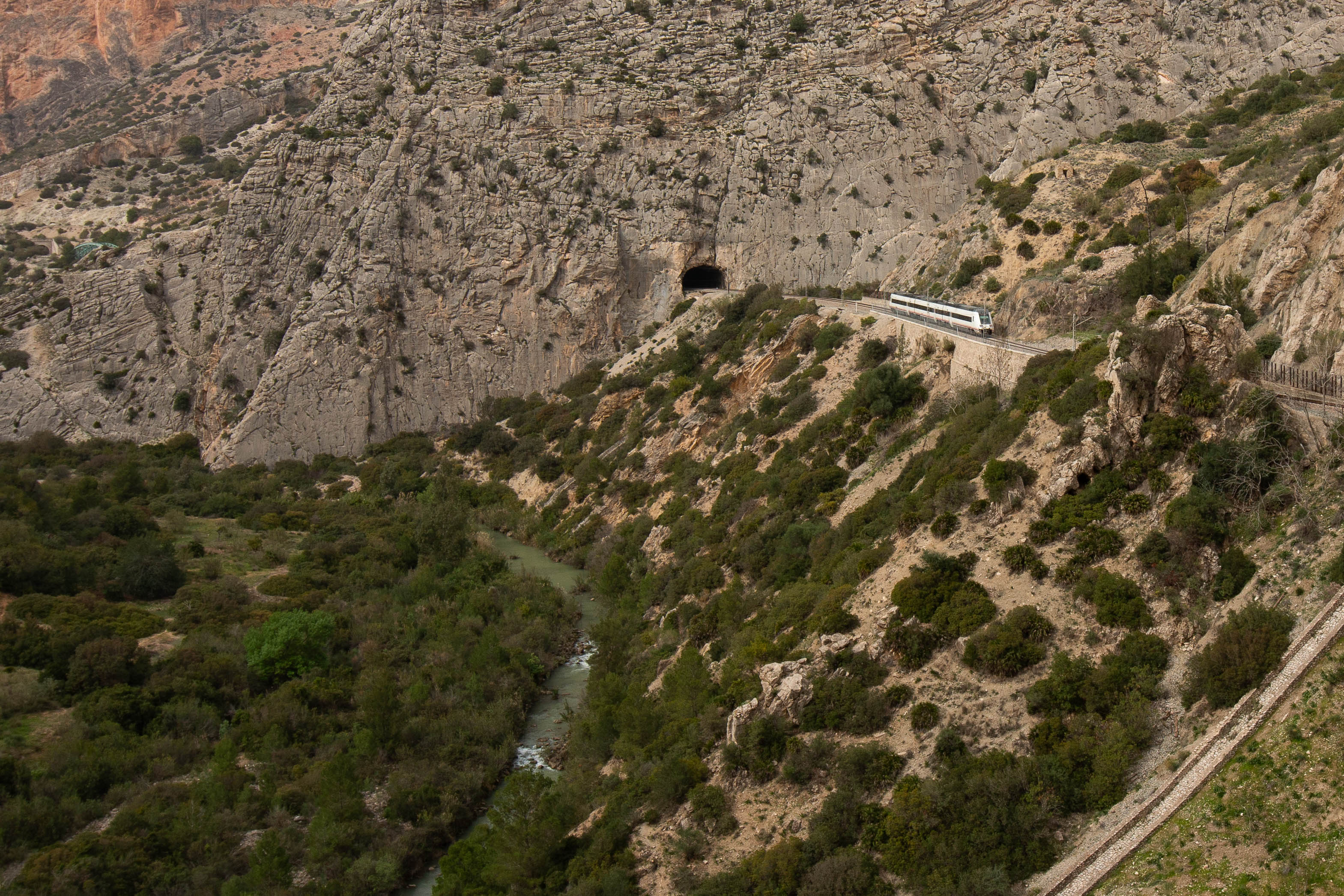 Nach dem Highlight der schwankenden Hängebrücke (105 Meter über dem Wasser) geht es heraus aus der Schlucht und noch einmal, auch sehr spektakulär, an einer Steilwand längs über die Eisenbahnbrücke vor El Chorro.