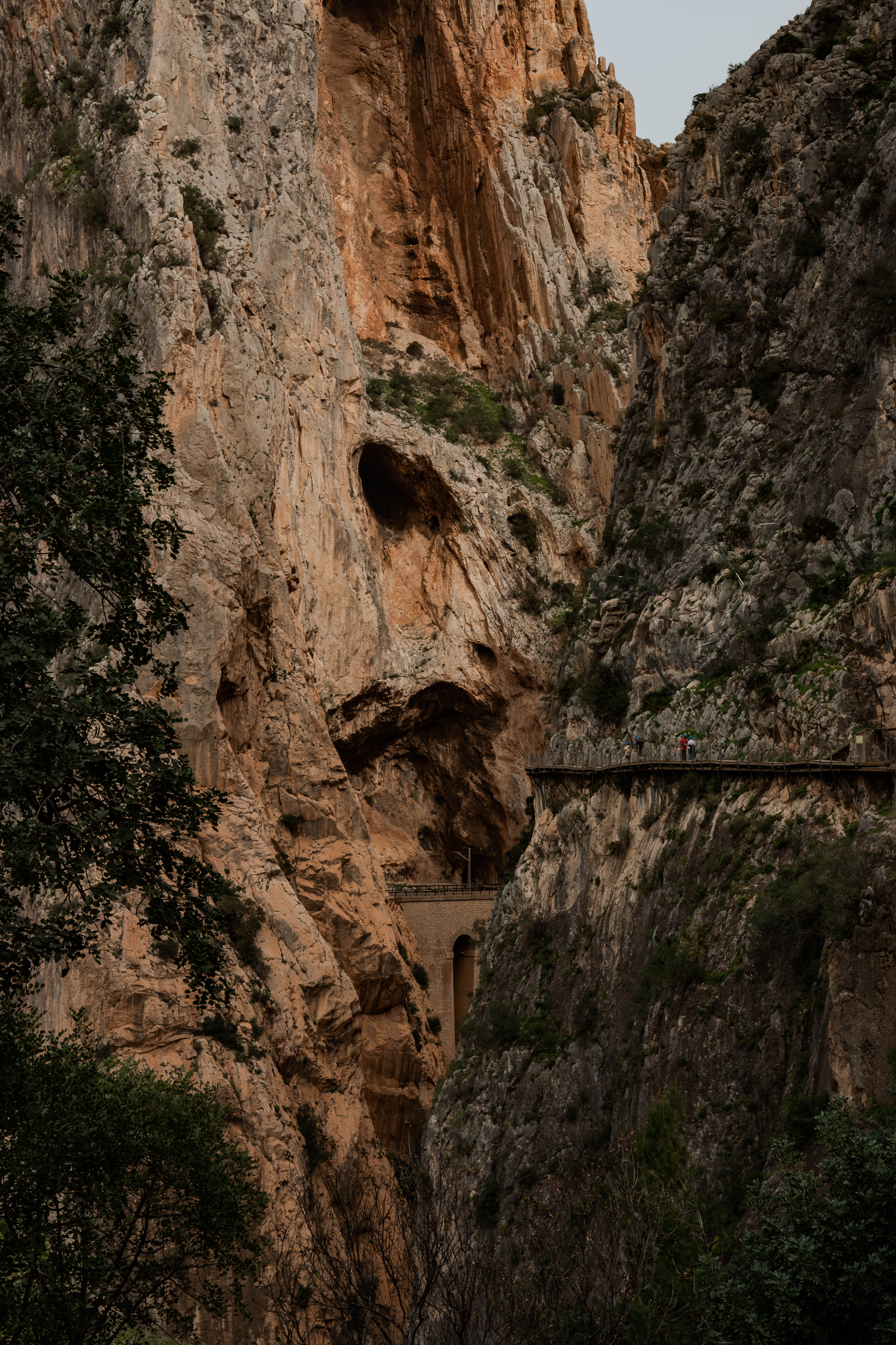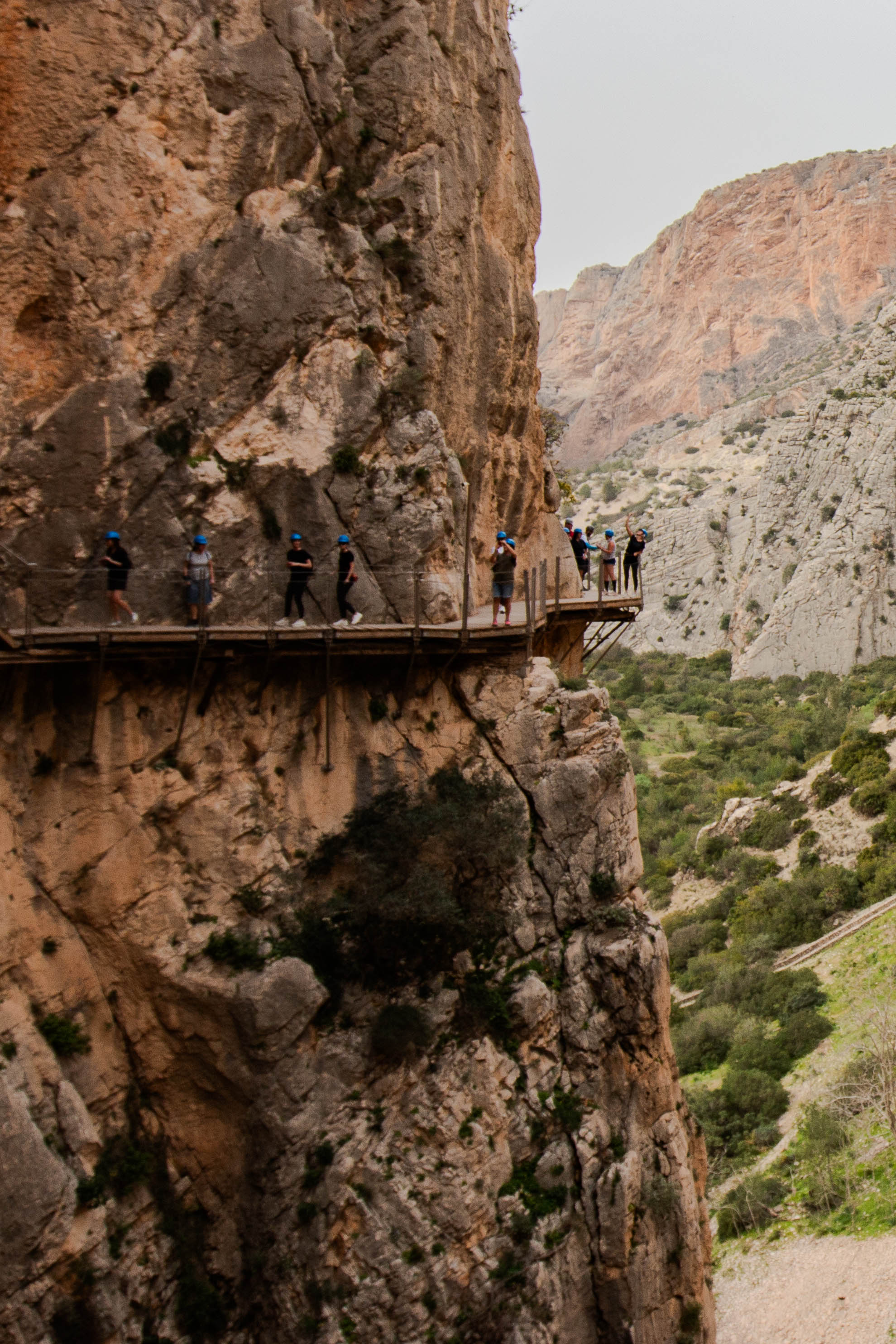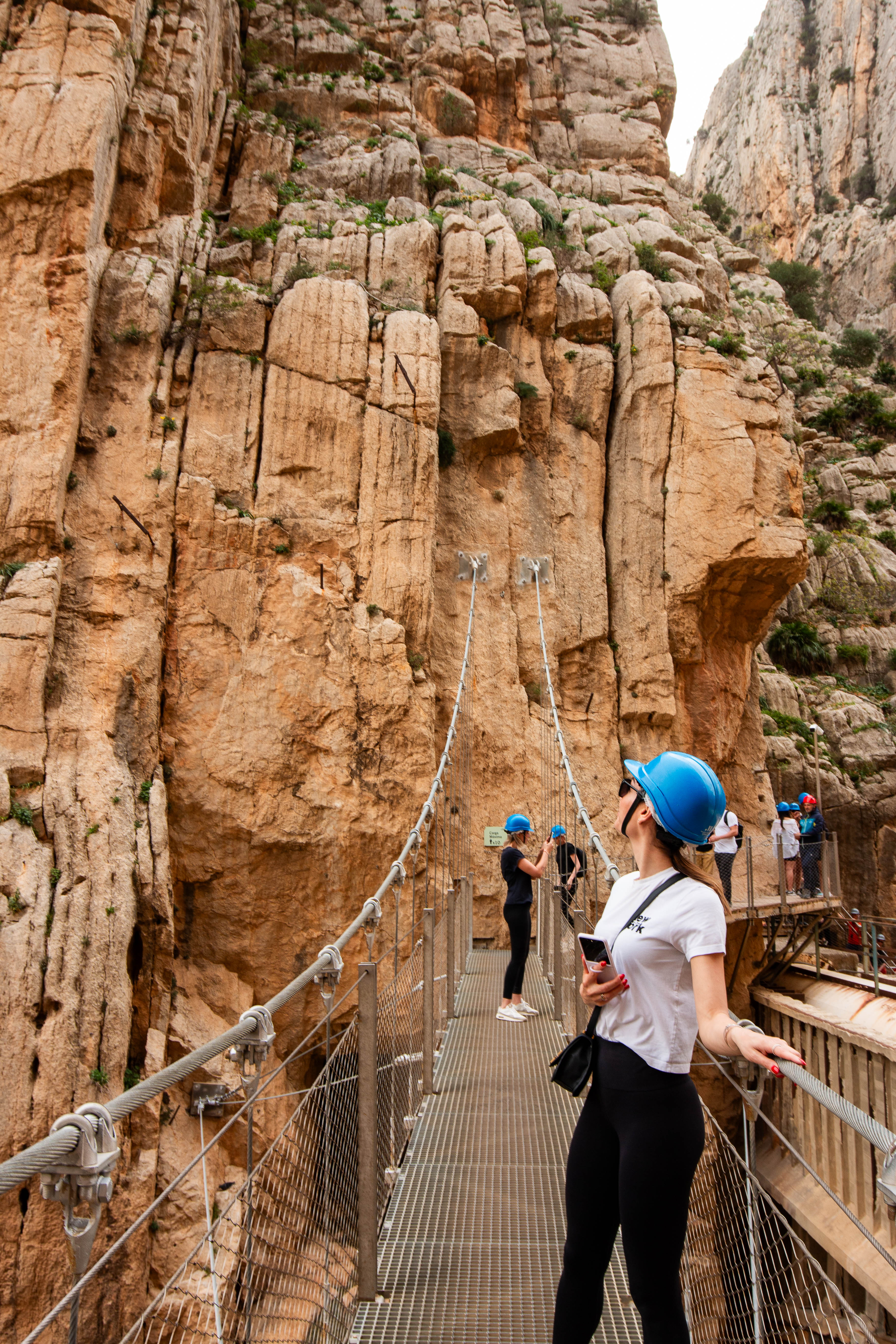 Nach dem Highlight der schwankenden Hängebrücke (105 Meter über dem Wasser) geht es heraus aus der Schlucht und noch einmal, auch sehr spektakulär, an einer Steilwand längs über die Eisenbahnbrücke vor El Chorro.