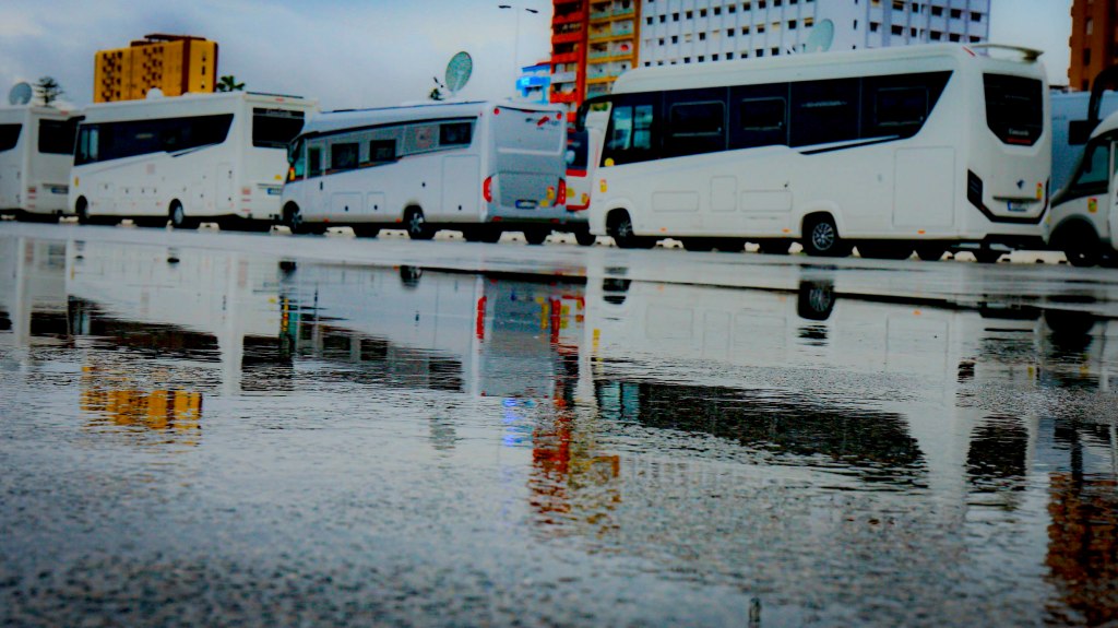 Liebe Freunde, es ist zum …! Da starten wir rechtzeitig heute morgen in Tarifa, wühlen uns mühsam mit den Vorderrädern aus dem Modder des völlig aufgeweichten Stellplatzes, fahren los und kommen tatsächlich rechtzeitig in Algeciras am Fährterminal an. Über Wind und Regen mag ich hier nicht mehr reden.