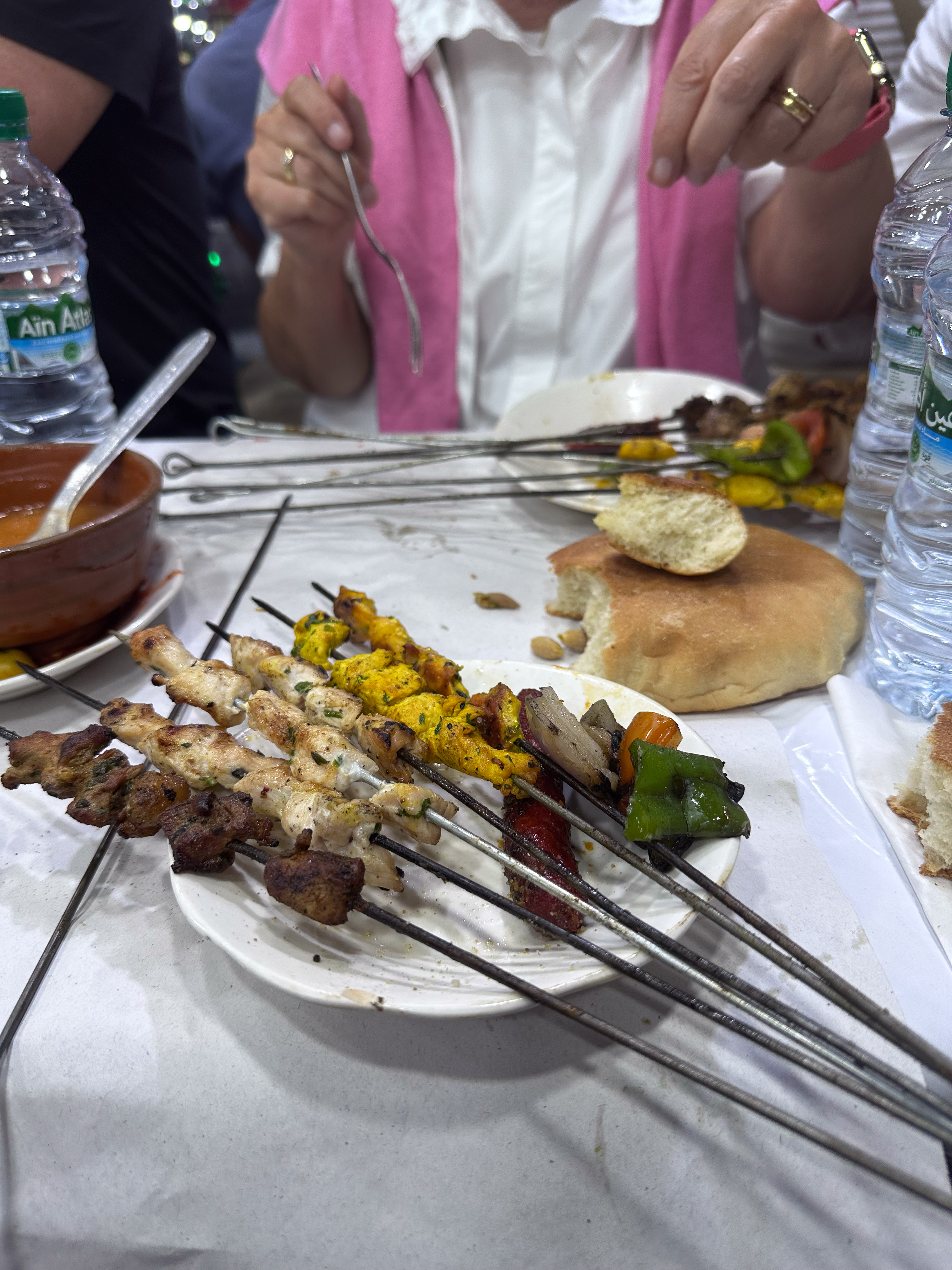 Wir lassen uns an einem nieder und erleben ein Abendessen der besonderen Art: Nach und nach werden uns in schneller Folge gefühlt ein Dutzend Speisen vorgesetzt, orientalische Speisen natürlich, Kichererbsensuppe, Fleischspieße vom offenen Feuer, Gemüse, Oliven, Couscous, Datteln, Süsskram. Nichtalkoholische Getränke. Happy Islam. Ramadan. Einen Minztee zum Abschluss? Na gut!