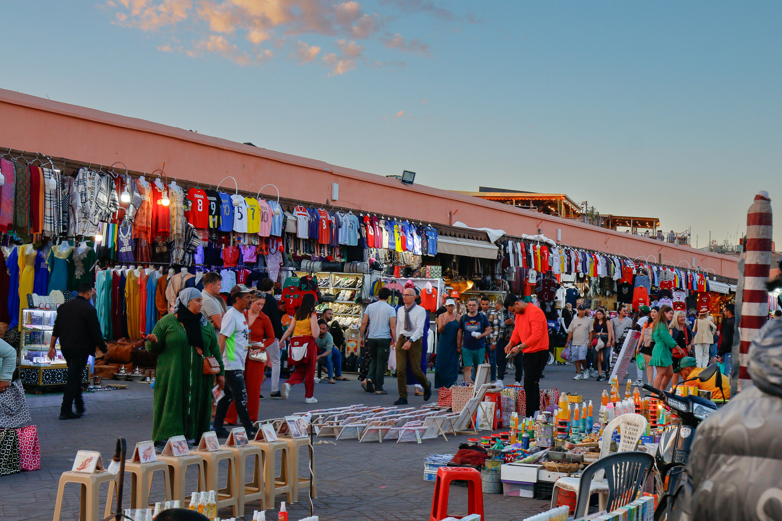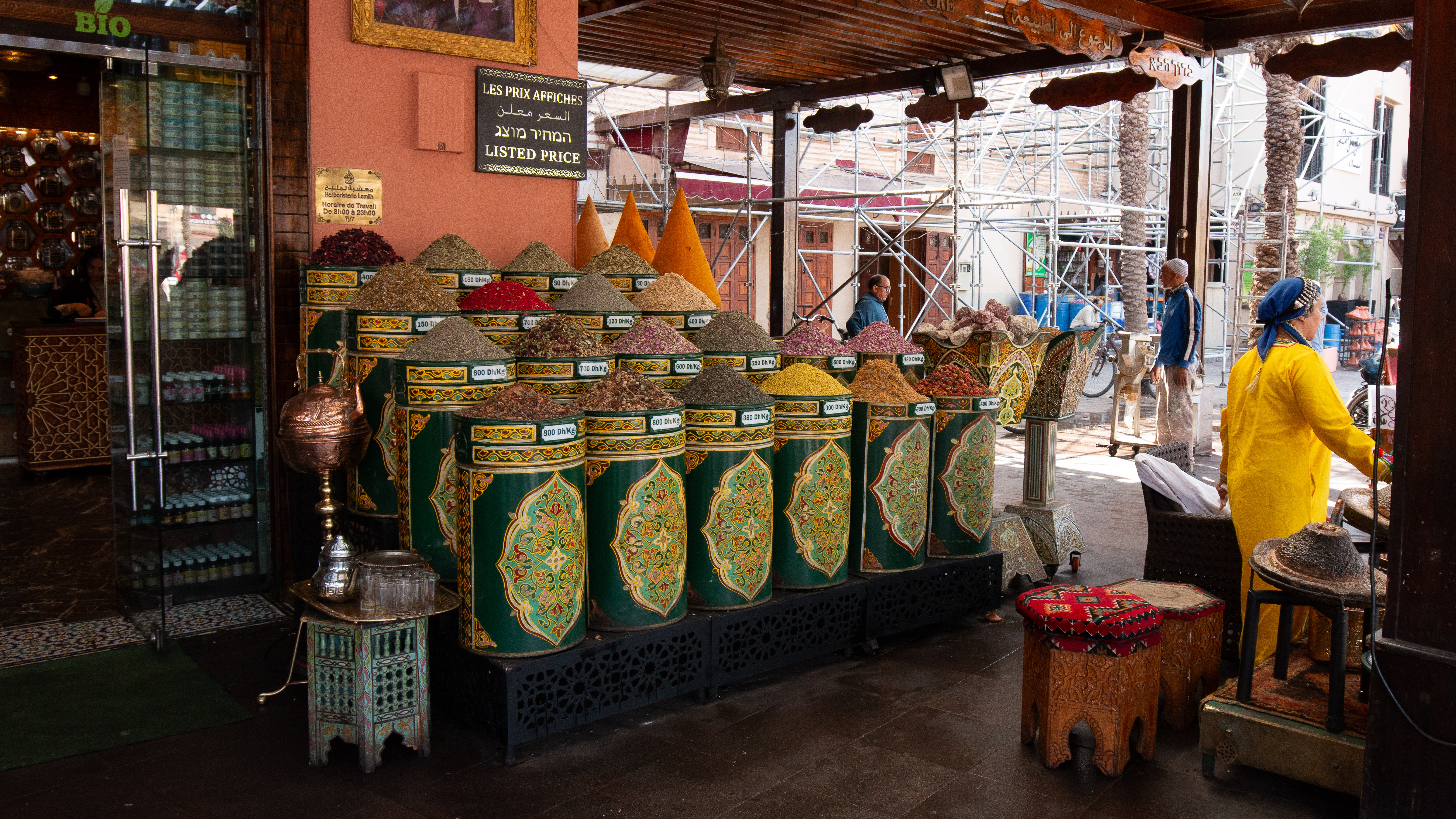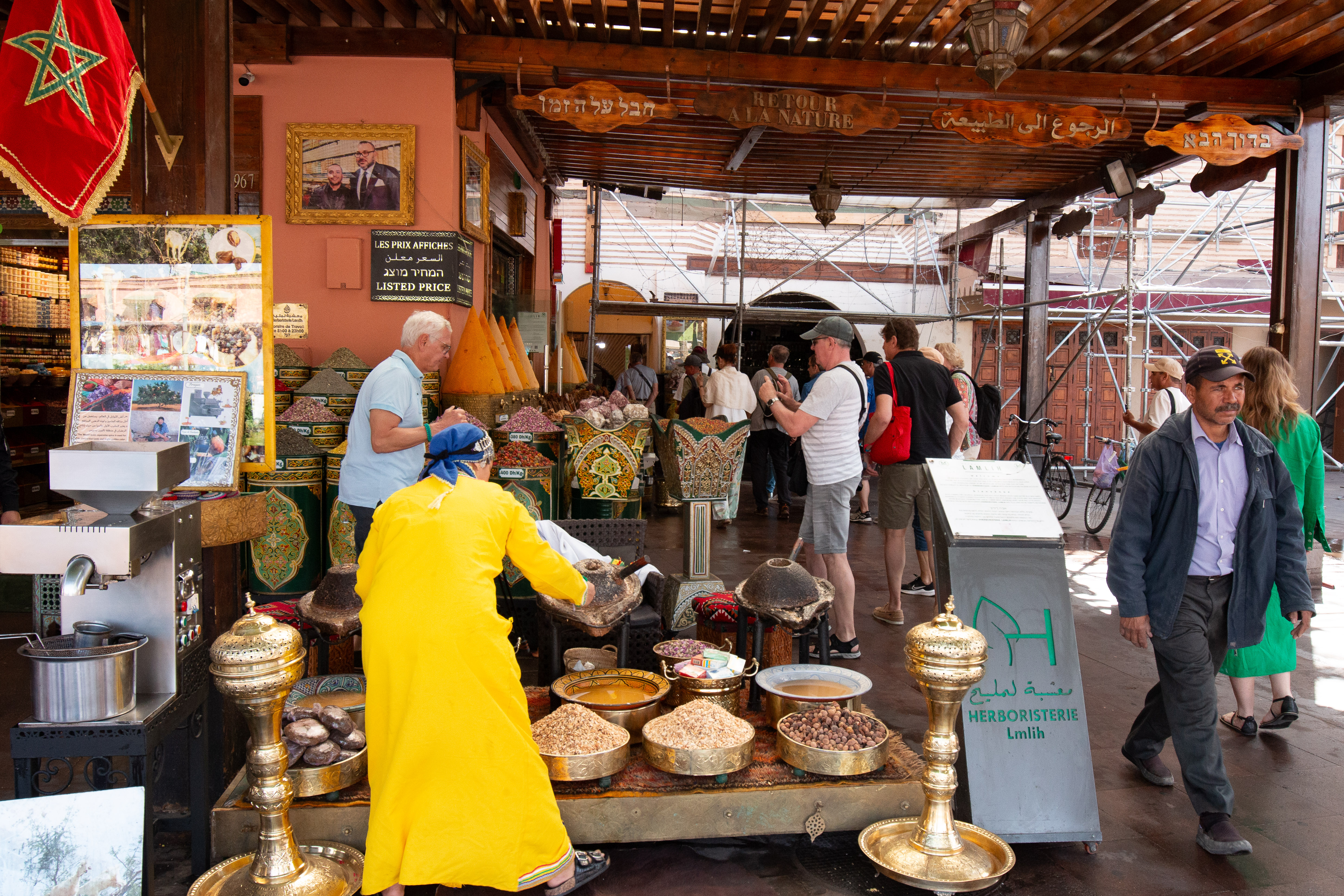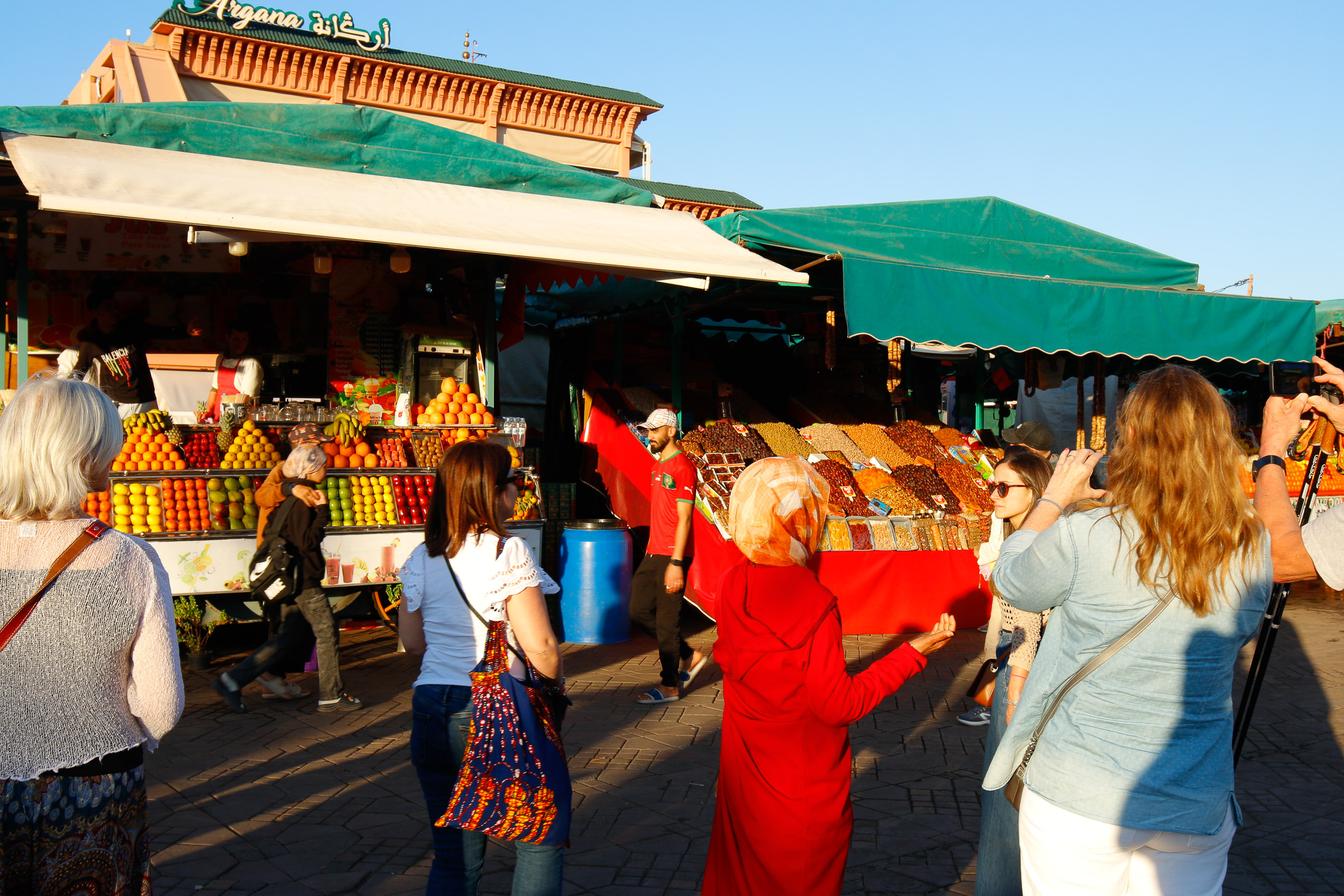Weiter geht es zum zentralen Platz von Marrakech, dem Djem el Fnaa. Uns empfängt ein orientalisches Durcheinander von Saftständen, Obstverkäufern unter grünen Zeltplanen, Gewürzhändlern, Lederwarenständen, Wahrsagerinnen, Schlangenbeschwörern und vielem mehr. Um den Platz herum mehrgeschossige Häuser, Cafés oder Restaurants zumeist, viele mit Dachterrasse. Dicht drängen sich die Menschenmassen durch die Gänge zwischen den Ständen, die Menge reisst uns einfach mit und spült uns in die angrenzenden Strassen der Souks in der Medina. Eine unvorstellbare Reizüberflutung: es ist heiss, es ist eng, eine Kakophonie von tausend Händlerstimmen, die sich schreiend Gehör verschaffen wollen, dazu Musik, orientalisch zumeist, grelle Farben, die Auslagen der Stände und Läden quellen über von Waren: Kleidung neben Souvenirs, Sonnenbrillen, Tinnef aus China, Gürtel und Taschen aus dem Atlasgebirge – dem Atlasgebirge? – „yes, yes, handmade from Berbers, oridschinal!! – come in and look! Best price, only here – where are you from? Oh Germany – Munschen schone Schdad, oh Hamburg auch schone Schdad – moin moin – lookim schene Farbn, allas Natür!, escht Ledr!, nix Plastik!“ Brennprobe mit dem herbeigezauberten Gasfeuerzeug. Sie reden mit Händen und Füssen, in jeder Touristensprache haben sie ein paar Brocken drauf, suchen damit ein kurzes Erstaunen zu wecken. Zeigt man dies, sitzt der Haken, an dem sie Dich in ihre Höhle zerren, wie die Muräne ihr Opfer. Es sind alles sehr talentierte Verkäufer, sie kennen jeden Trick um Dich zum Kauf von Dingen zu überreden, die Du nicht brauchst und eigentlich auch nicht willst. Aber bis auf ganz wenige Ausnahmen bleiben sie höflich und freundlich wenn Du klar zu erkennen gibst, dass kein Interesse besteht.