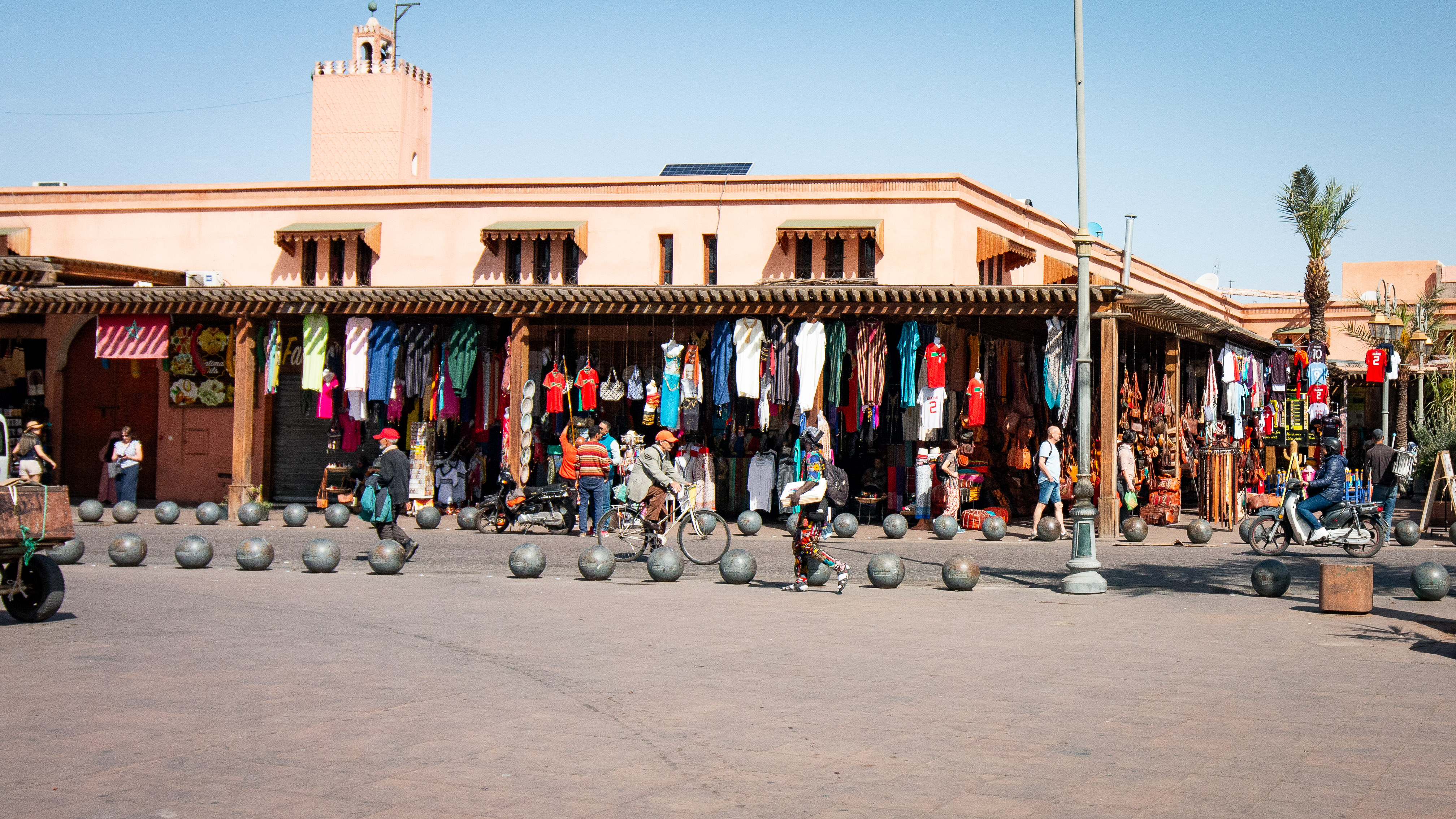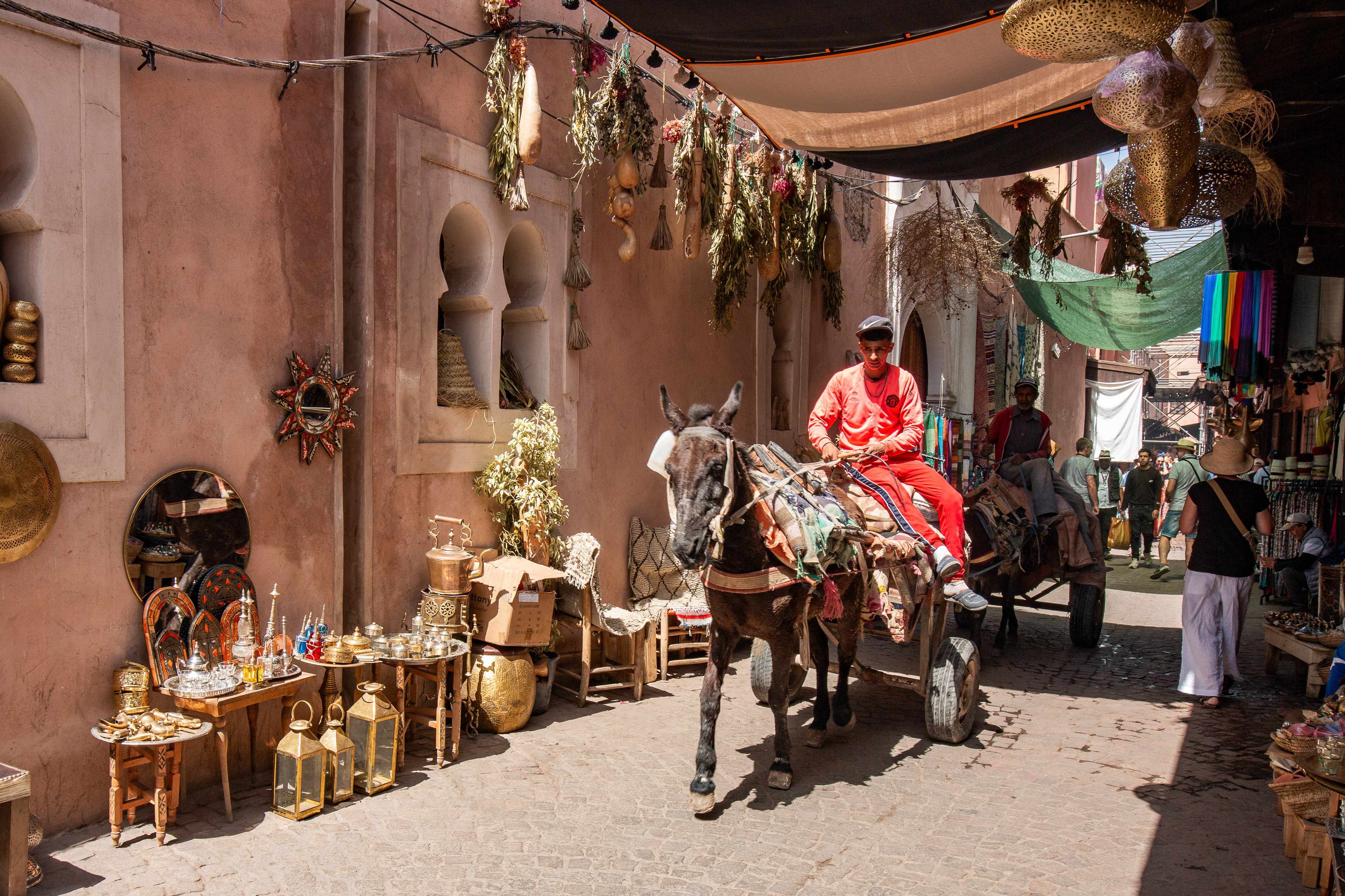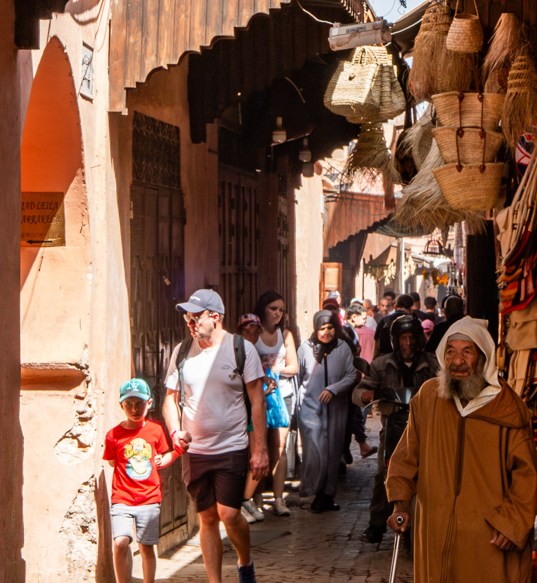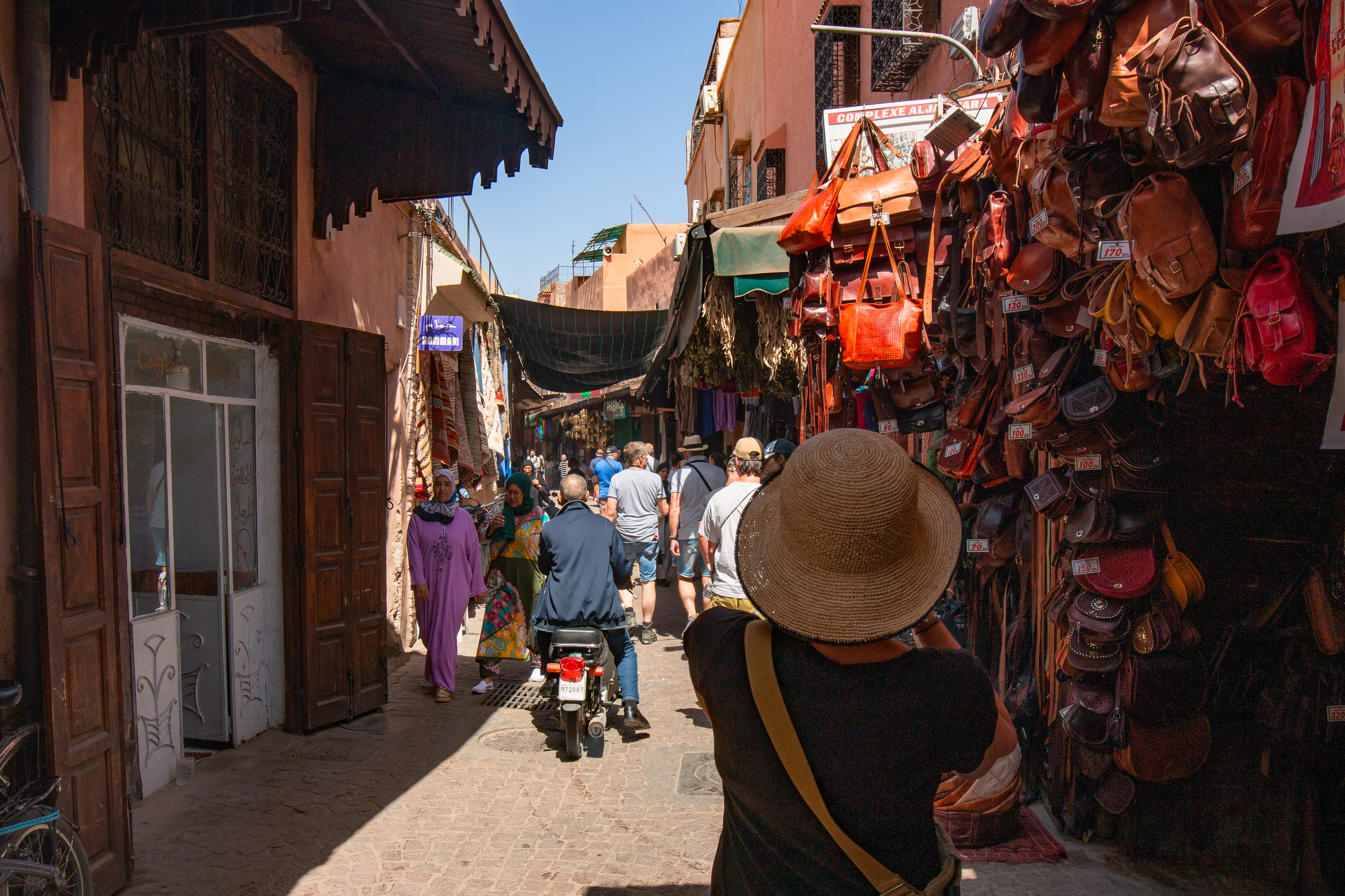 Weiter geht es zum zentralen Platz von Marrakech, dem Djem el Fnaa. Uns empfängt ein orientalisches Durcheinander von Saftständen, Obstverkäufern unter grünen Zeltplanen, Gewürzhändlern, Lederwarenständen, Wahrsagerinnen, Schlangenbeschwörern und vielem mehr. Um den Platz herum mehrgeschossige Häuser, Cafés oder Restaurants zumeist, viele mit Dachterrasse. Dicht drängen sich die Menschenmassen durch die Gänge zwischen den Ständen, die Menge reisst uns einfach mit und spült uns in die angrenzenden Strassen der Souks in der Medina. Eine unvorstellbare Reizüberflutung: es ist heiss, es ist eng, eine Kakophonie von tausend Händlerstimmen, die sich schreiend Gehör verschaffen wollen, dazu Musik, orientalisch zumeist, grelle Farben, die Auslagen der Stände und Läden quellen über von Waren: Kleidung neben Souvenirs, Sonnenbrillen, Tinnef aus China, Gürtel und Taschen aus dem Atlasgebirge – dem Atlasgebirge? – „yes, yes, handmade from Berbers, oridschinal!! – come in and look! Best price, only here – where are you from? Oh Germany – Munschen schone Schdad, oh Hamburg auch schone Schdad – moin moin – lookim schene Farbn, allas Natür!, escht Ledr!, nix Plastik!“ Brennprobe mit dem herbeigezauberten Gasfeuerzeug. Sie reden mit Händen und Füssen, in jeder Touristensprache haben sie ein paar Brocken drauf, suchen damit ein kurzes Erstaunen zu wecken. Zeigt man dies, sitzt der Haken, an dem sie Dich in ihre Höhle zerren, wie die Muräne ihr Opfer. Es sind alles sehr talentierte Verkäufer, sie kennen jeden Trick um Dich zum Kauf von Dingen zu überreden, die Du nicht brauchst und eigentlich auch nicht willst. Aber bis auf ganz wenige Ausnahmen bleiben sie höflich und freundlich wenn Du klar zu erkennen gibst, dass kein Interesse besteht.