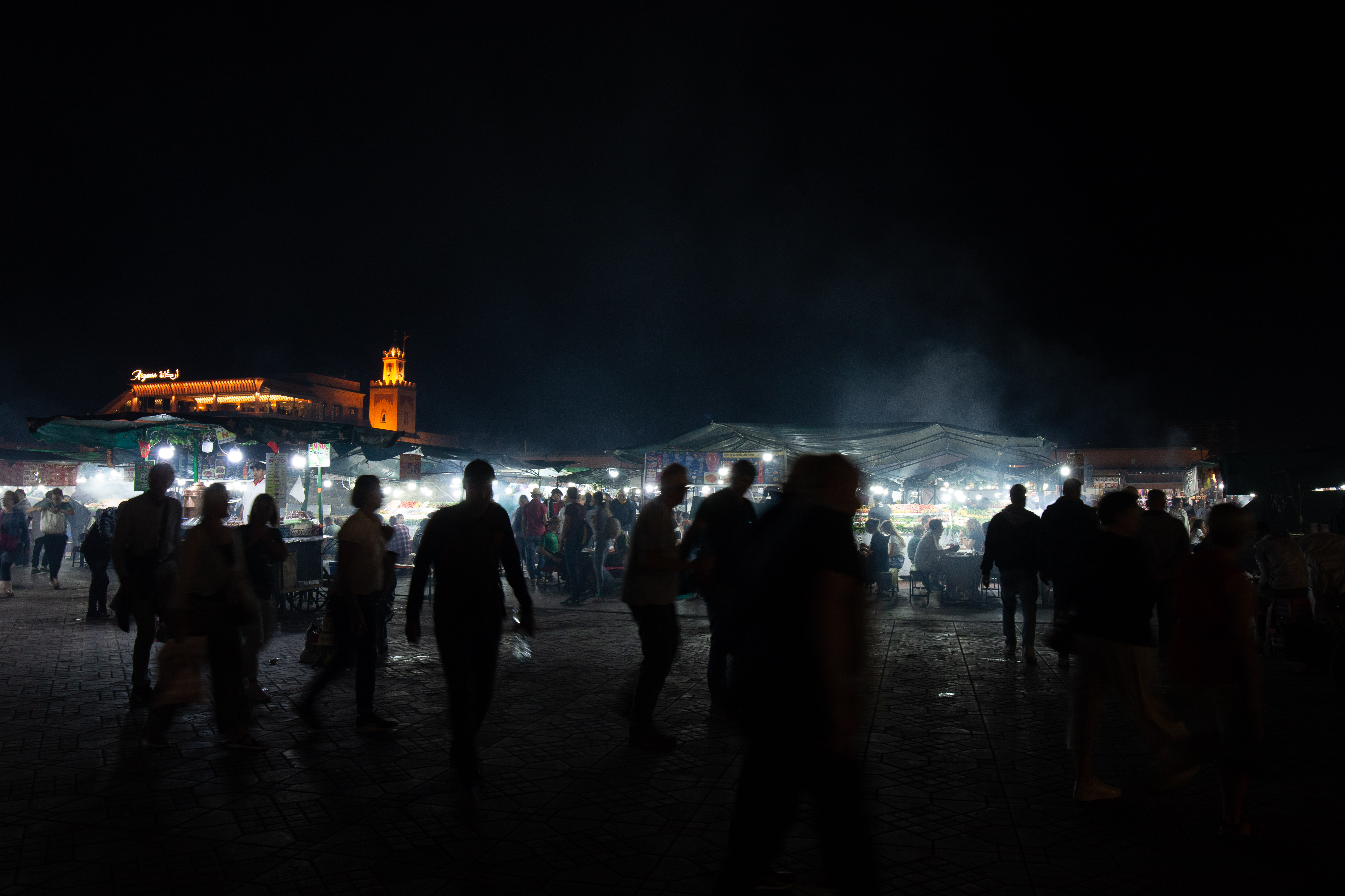 Mittlerweile ist es dunkel geworden und das Aussehen des Djem el Fnaa hat sich völlig verändert. Wo eben noch Händler ihre Waren anpriesen, stehen nun Tische und Bänke dicht an Dicht und ein Kochdunst wabert aus den Ständen dahinter.