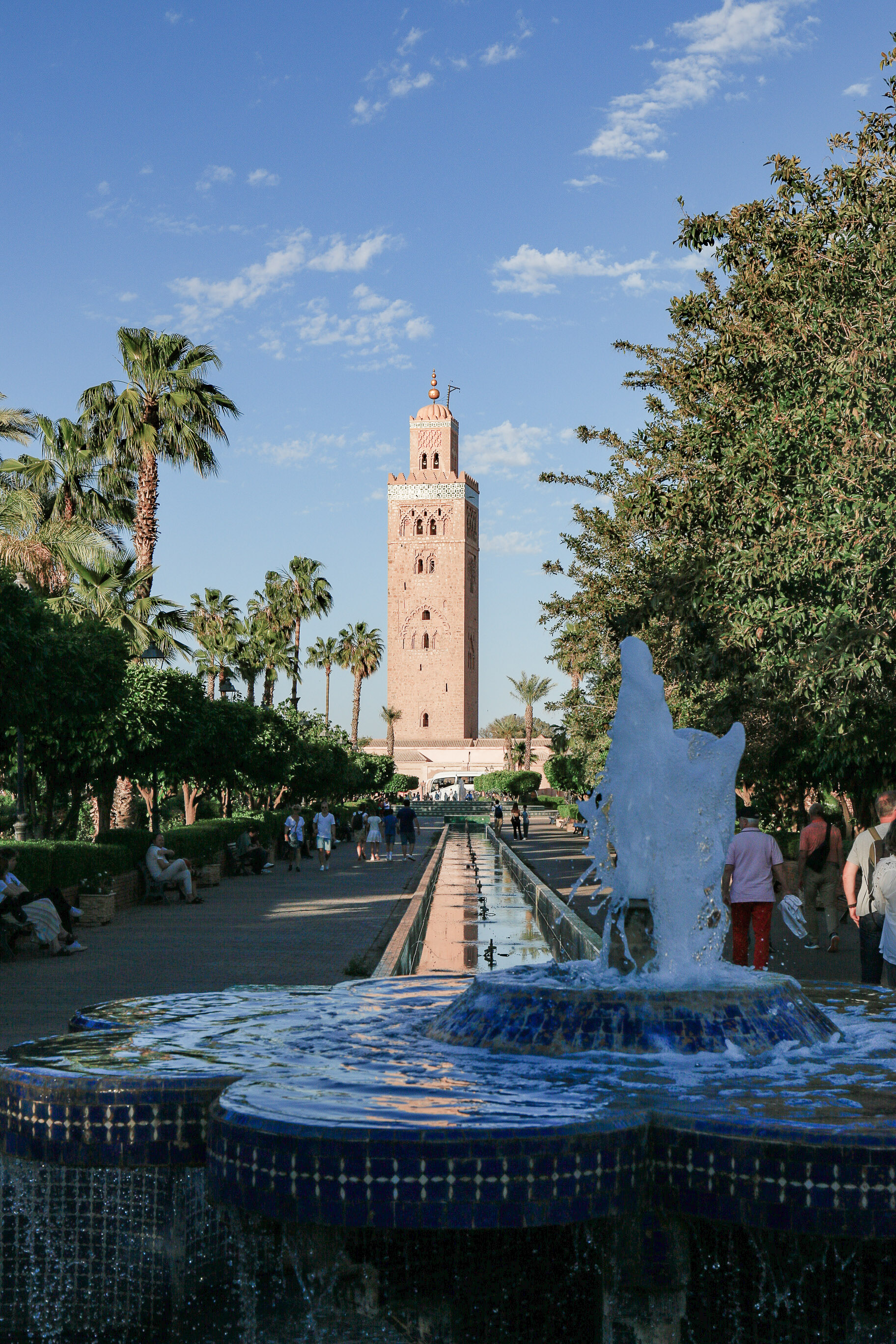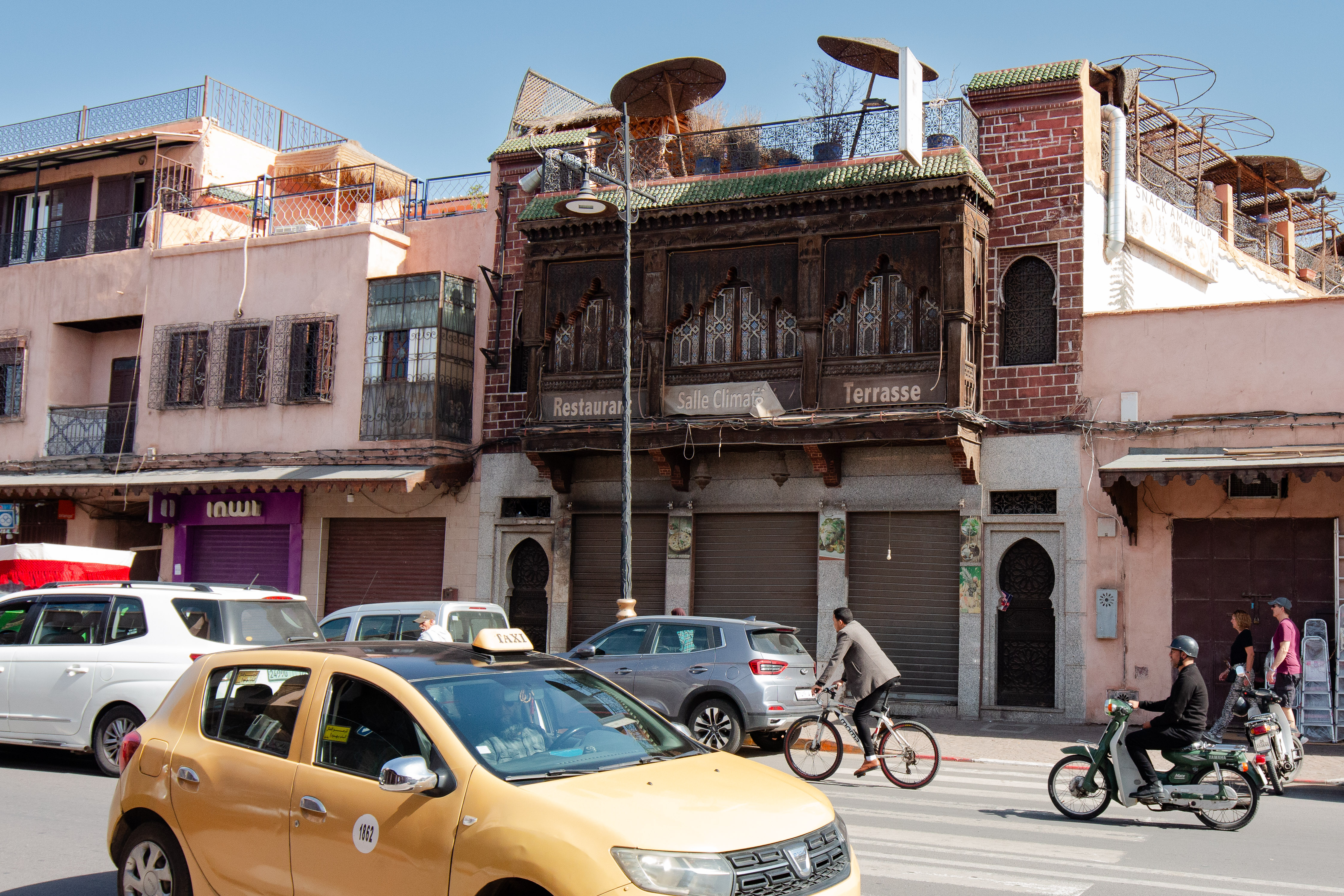 Wir benutzen wieder die gut ausgebaute Autobahn A5, ein paar Mautstellen sorgen für geringe Verzögerungen auf der Fahrt. Die Strecke führt an Casablanca vorbei, dort sehen wir einige stark heruntergekommene Wohnviertel, direkt neben der Autobahn, sie erinnern uns an die townships in Südafrika. Bald biegt die Route weiter ins Landesinnere ab und es wird grün. Grosse Felder mit jungem Wuchs beherrschen jetzt das Bild. Ungefähr nach halber Strecke ändert es sich urplötzlich: wie mit dem Lineal gezogen endet jegliche Vegetation und innerhalb vielleicht eines Kilometers beginnt eine Steinwüste, öde, rot, leer, soweit das Auge reicht. Mondlandschaft. Nach ein paar weiteren Kilometern tauchen vereinzelte Farmen auf, die Olivenbäume dort werden offenbar gut gewässert, grüne Quadrate von wenigen hundert Metern Kantenlänge inmitten einer unendlich erscheinenden Ödness. Menschen oder Tiere können wir nicht entdecken. Es gibt keinerlei Parkplätze hier an der Autobahn, sodass ich diese Leere noch nicht einmal fotografieren kann. Spotify haut mir den alten Hit von Crosby, Stills, Nash and Young „Marrakech Express“ gleich mehrfach und in ordentlicher Lautstärke um die Ohren. Einfach unglaublich, dass mich dieses Lied mit dem Sehnsuchtsort im Titel, seit den späten Sechzigern von mir so oft gehört, mich gerade an diesem heutigen Tag, tatsächlich dorthin begleitet. Hätte ich mir damals nicht träumen lassen.