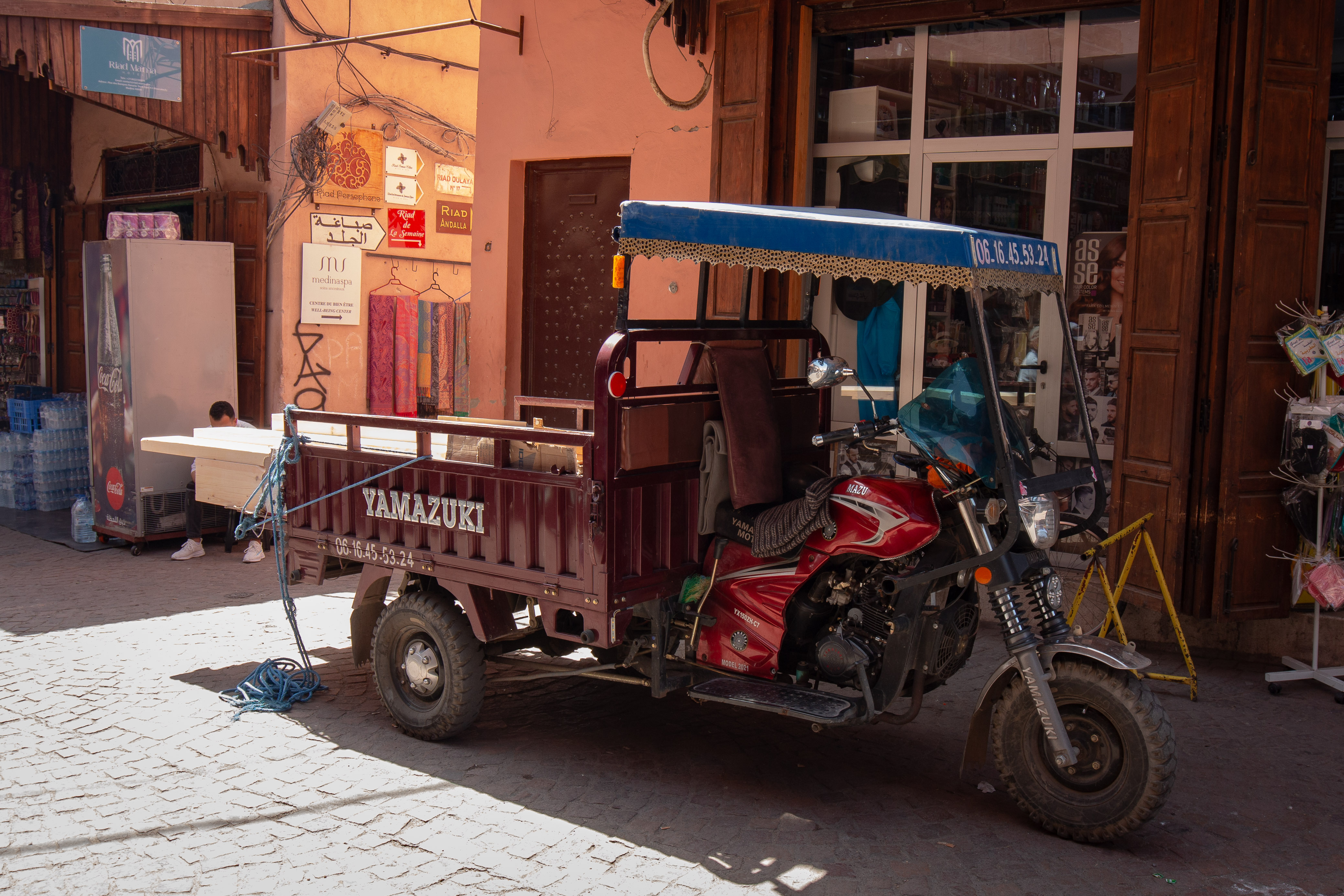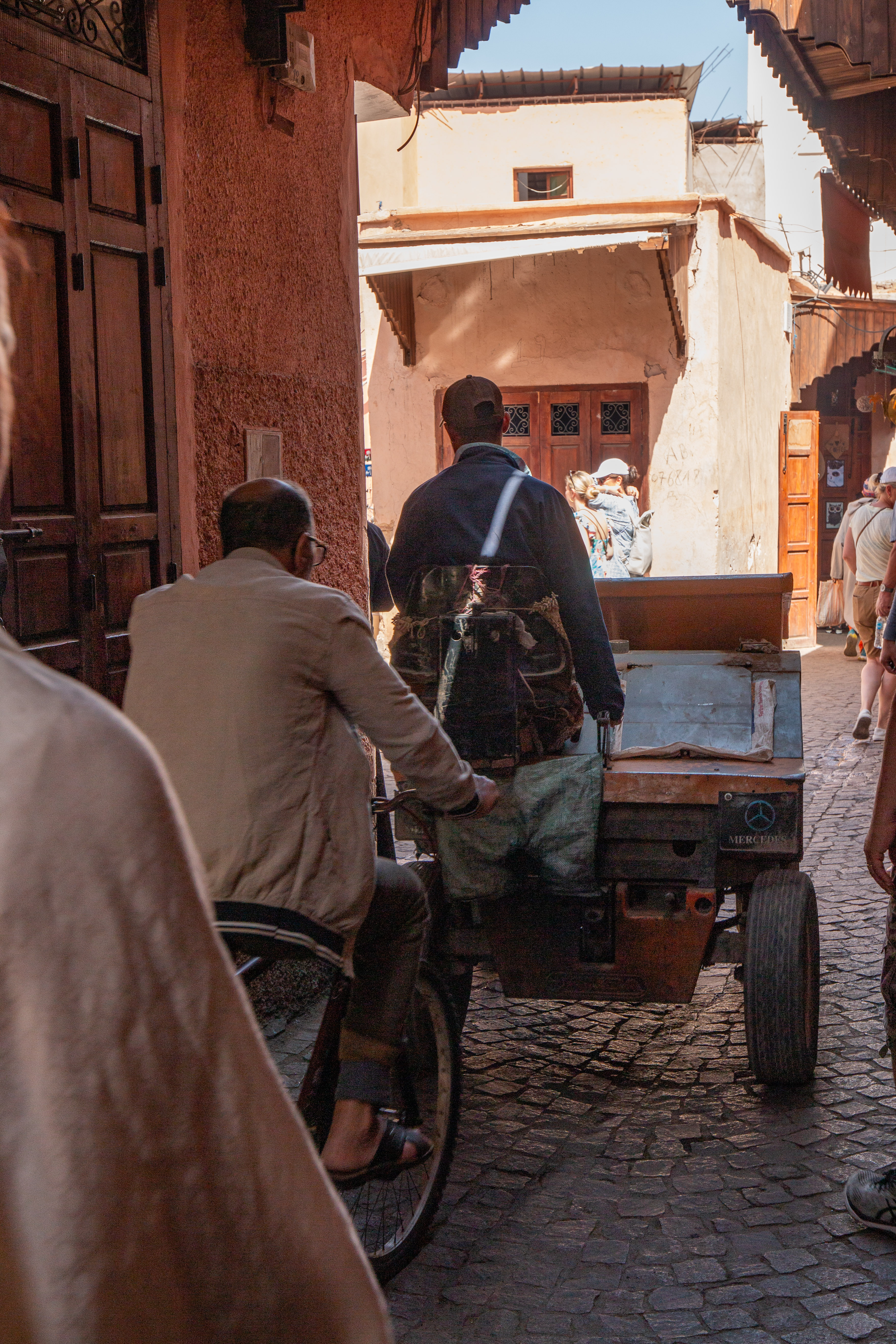 Was für ein Chaos herrscht hier auf den Strassen. Hatten wir doch in Rabat noch geglaubt, der Verkehr dort wäre irre, dass hier übersteigt jegliche Vorstellungskraft. Autos, LKW, Busse, Radfahrer, Fussgänger, Pferdekutschen und vor allem Mopeds versuchen, so schnell als irgend möglich, ihr Ziel zu erreichen. Stoppen für Fussgänger an Zebrastreifen gilt als übertriebene Höflichkeit, die querenden Fussgänger gleichen Toreros auf ihrem Weg zur anderen Strassenseite. Ampeln gibt es kaum, dafür Roundabouts. Hier bietet sich die Möglichkeit für Autofahrer durch haarsträubende Links-Rechts Kombinationen im Kreisel ein oder zwei Autolängen gut zu machen. Jeder Millimeter Lücke wird zum Reindrängeln ausgenutzt. Im Vorteil sind eindeutig die Mopeds. Sie überholen uns und auch ihre Kollegen rechts und links und alle gleichzeitig und das in einem Affentempo. Ein wildes Schlenkern über alle Spuren, inklusive Bankett. Helme werden offenbar als Ausdruck von Feigheit angesehen und sind daher verpönt. Egal ob Oma, Kleinkind oder Umzugsgut, alles Mögliche – und Unmögliche – wird auf dem Sozius transportiert. Apropos Seitenabstand: den gibts nicht!