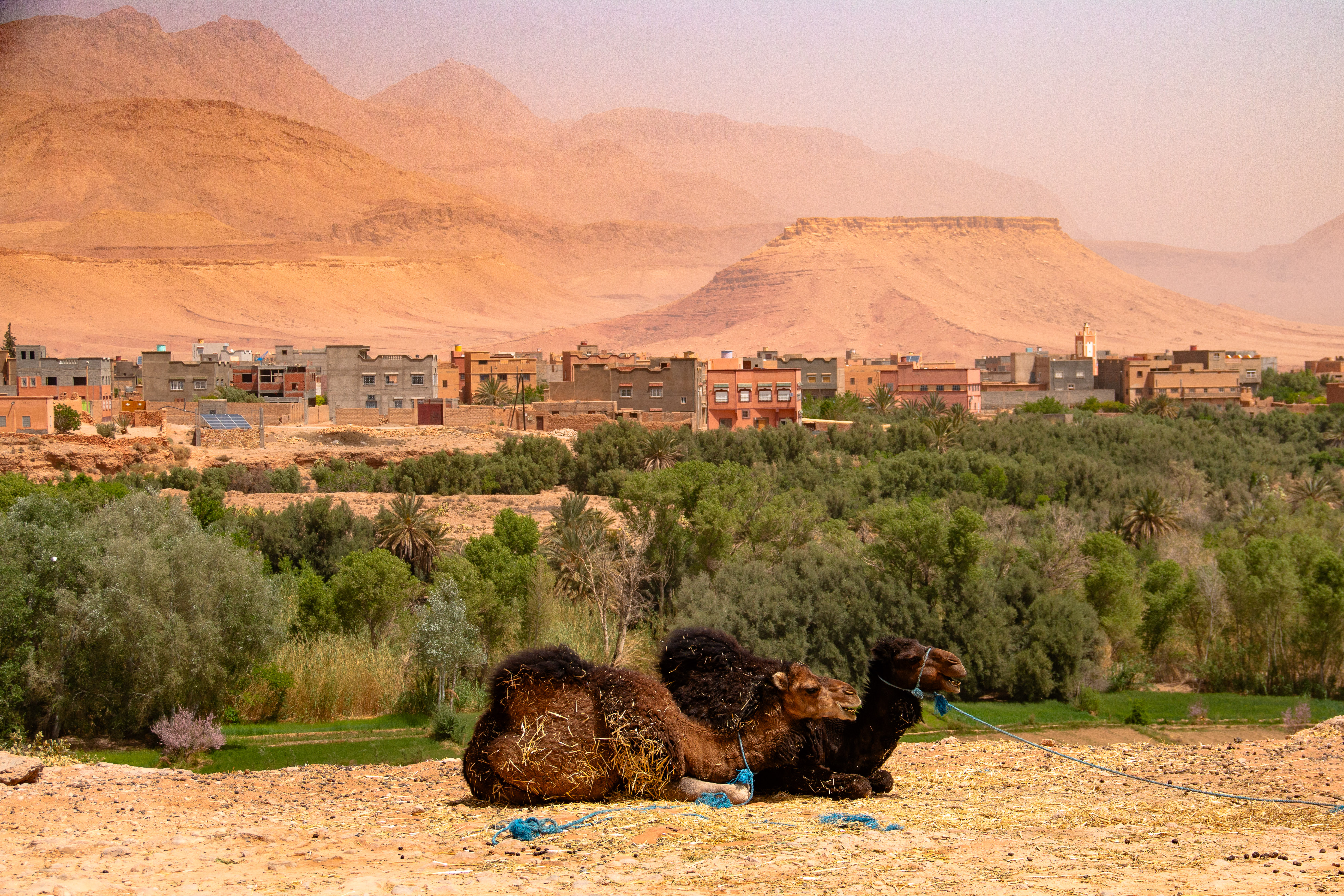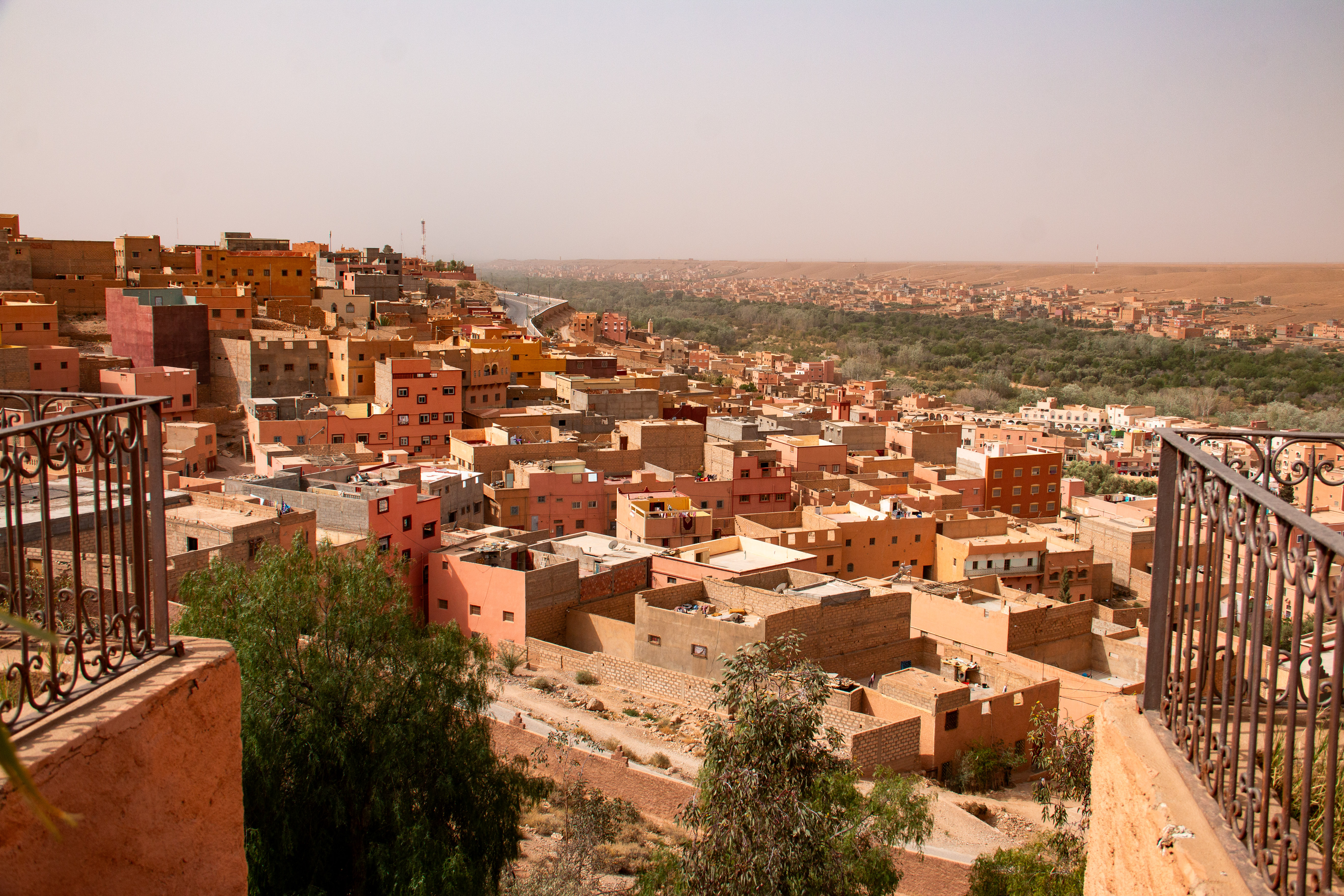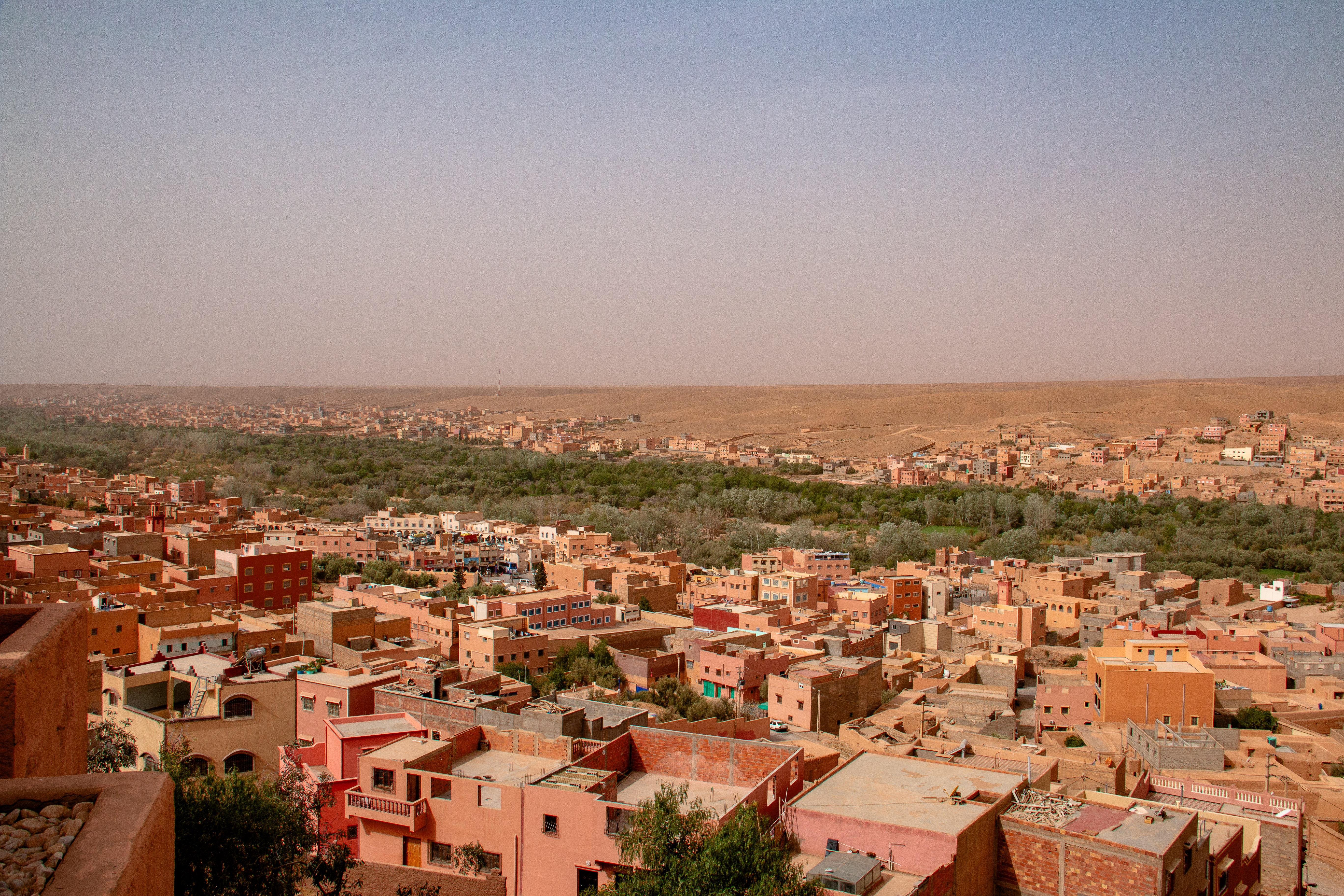 Von Aït-Ben-Haddou brechen wir nach einer erholsamen und sicheren Nacht auf, Hassan der Parkwächer passte gut auf uns auf. Wir folgen weiter der „Strasse der Kasbahs“ Richtung Osten. Über Nacht hat sich das Wetter, nein, vielmehr die Sicht, verändert: wohl bedingt durch den starken Wind der letzten Tage erscheint jetzt die Luft nahezu gesättigt mit rotem Saharastaub. Ich hatte gehofft, bei Abfahrt von einer nahen Anhöhe noch ein Abschiedsfoto schiessen zu können, aber daraus wird nichts, es ist einfach zu diesig. Von Zuhause hören wir, dass der Dunst durch den Wind bis nach Norddeutschland getragen wurde. Wir sind jetzt Richtung Wüste unterwegs und die Infrastruktur wird spärlicher, das gilt es bei unseren Stops zu brerücksdichtigren, besonders was Entsorgung und das Bunkern von Frischwasser betrifft.