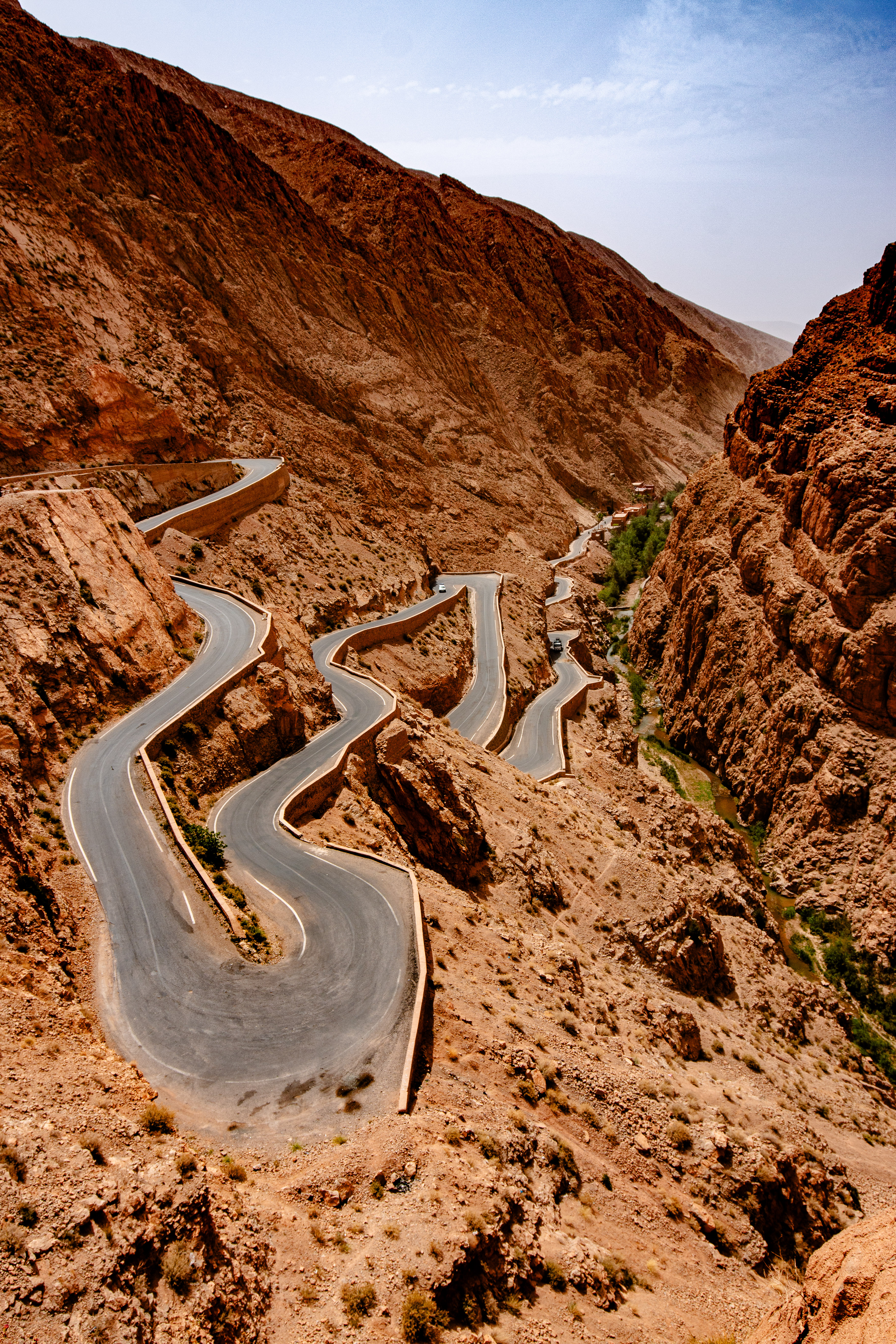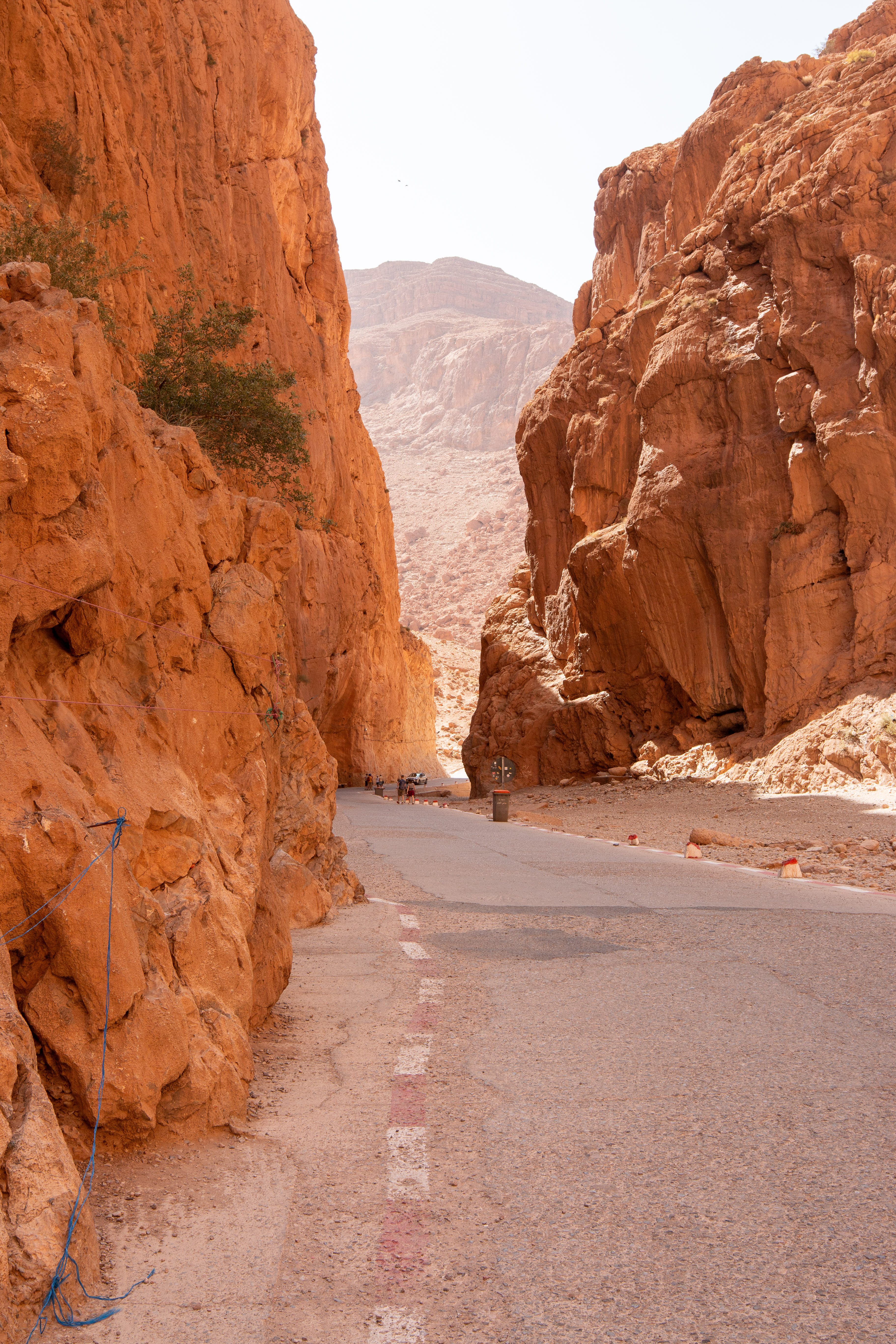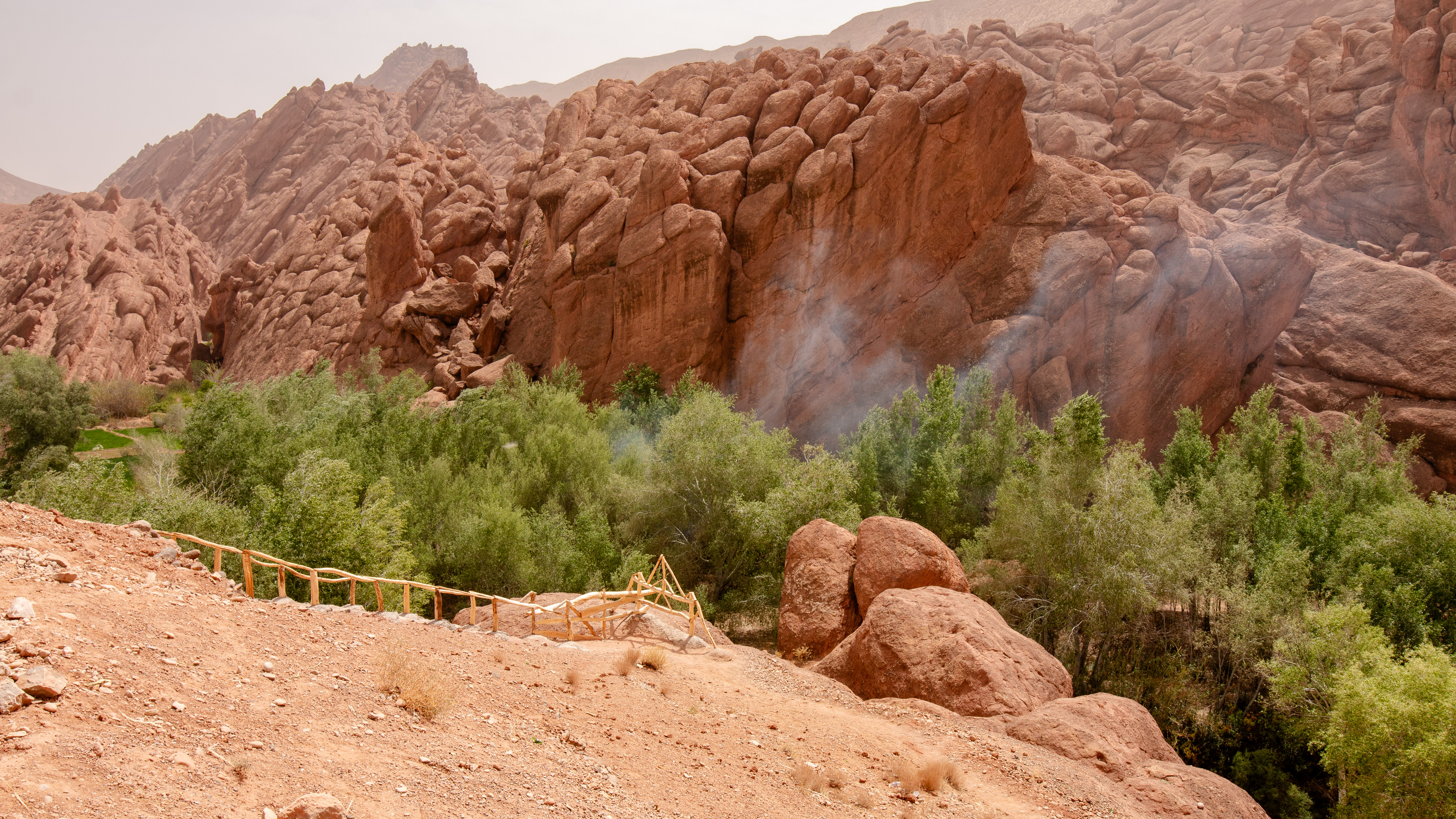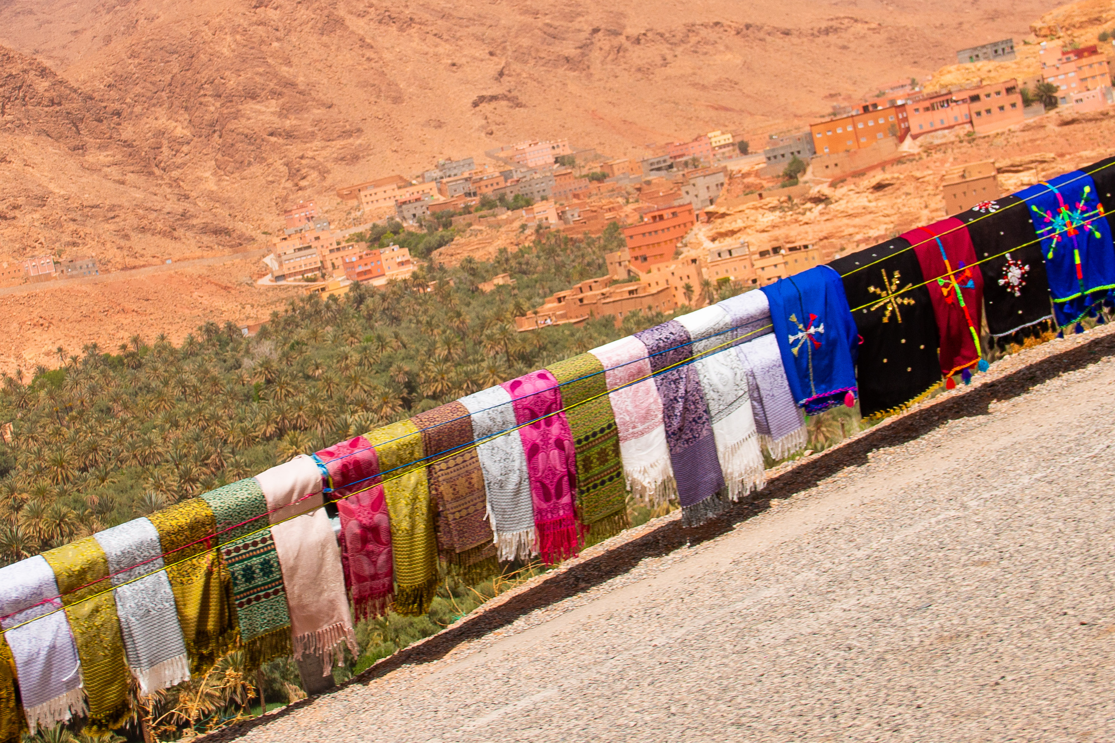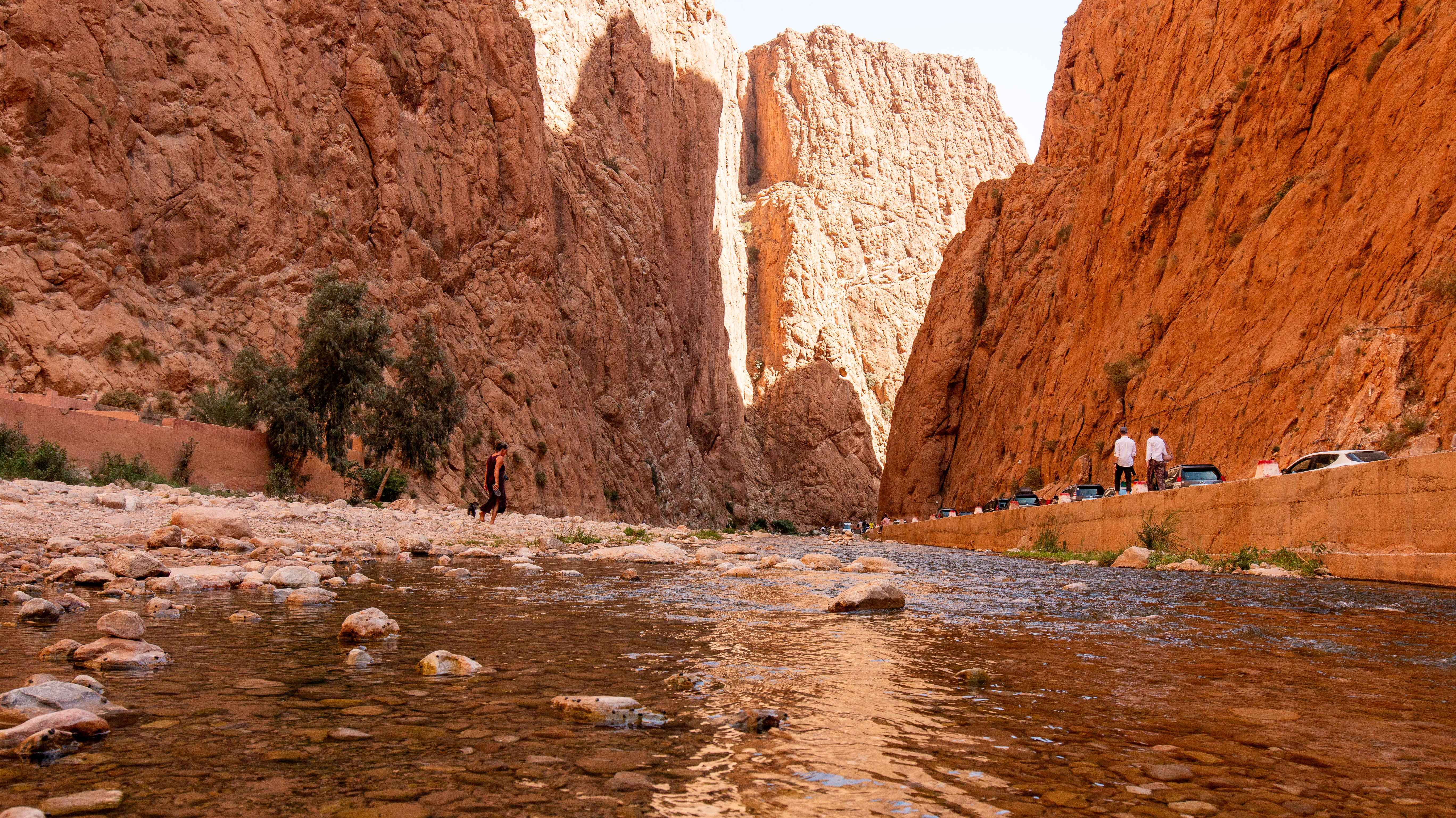Am späten Nachmittag fahren wir hinauf in die Todra-Schlucht. Diese wurde in Jahrtausenden vom Fluss Oued Todra in das hohe Atlasgebirge gegraben, bevor er sich bei Tinghir in der Ebene verliert. Der Ould Todra speist nicht nur die Oase sondern gibt auch der Stadt Tinghir sein Wasser. Bis zu 300 Meter hoch ragen die steilen Felswände vom Fluss hinaus zu den Felshöhen. Der Talsohle der Schlucht liegt auf 1400 Meter Meereshöhe. Die Schlucht selbst und die umliegenden Felswände sind ein Eldorado für Kletterfreaks aus der ganzen Welt, die hier, winzig klein, buchstäblich wie die Fliegen, oben an der Wand kleben.
