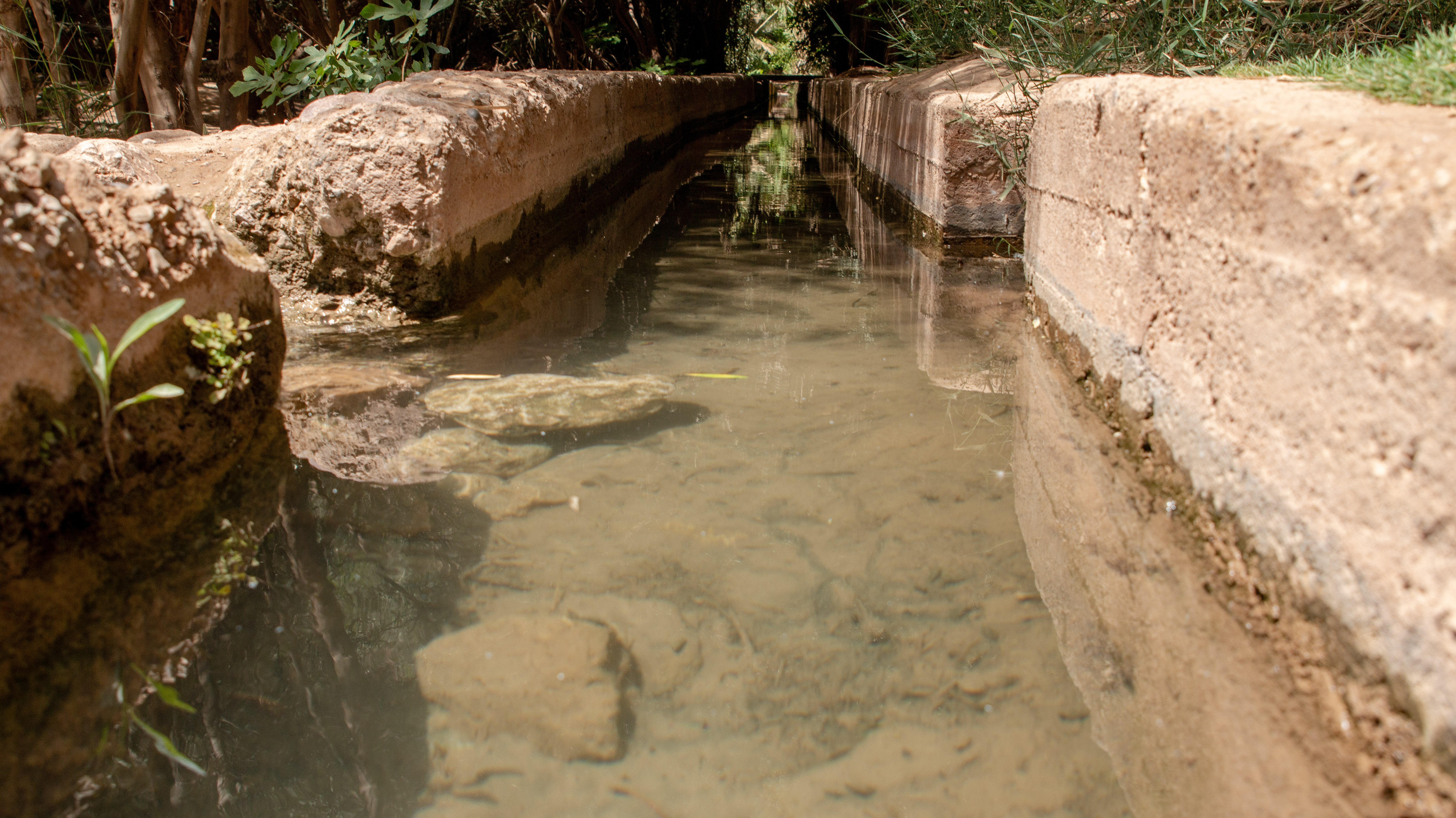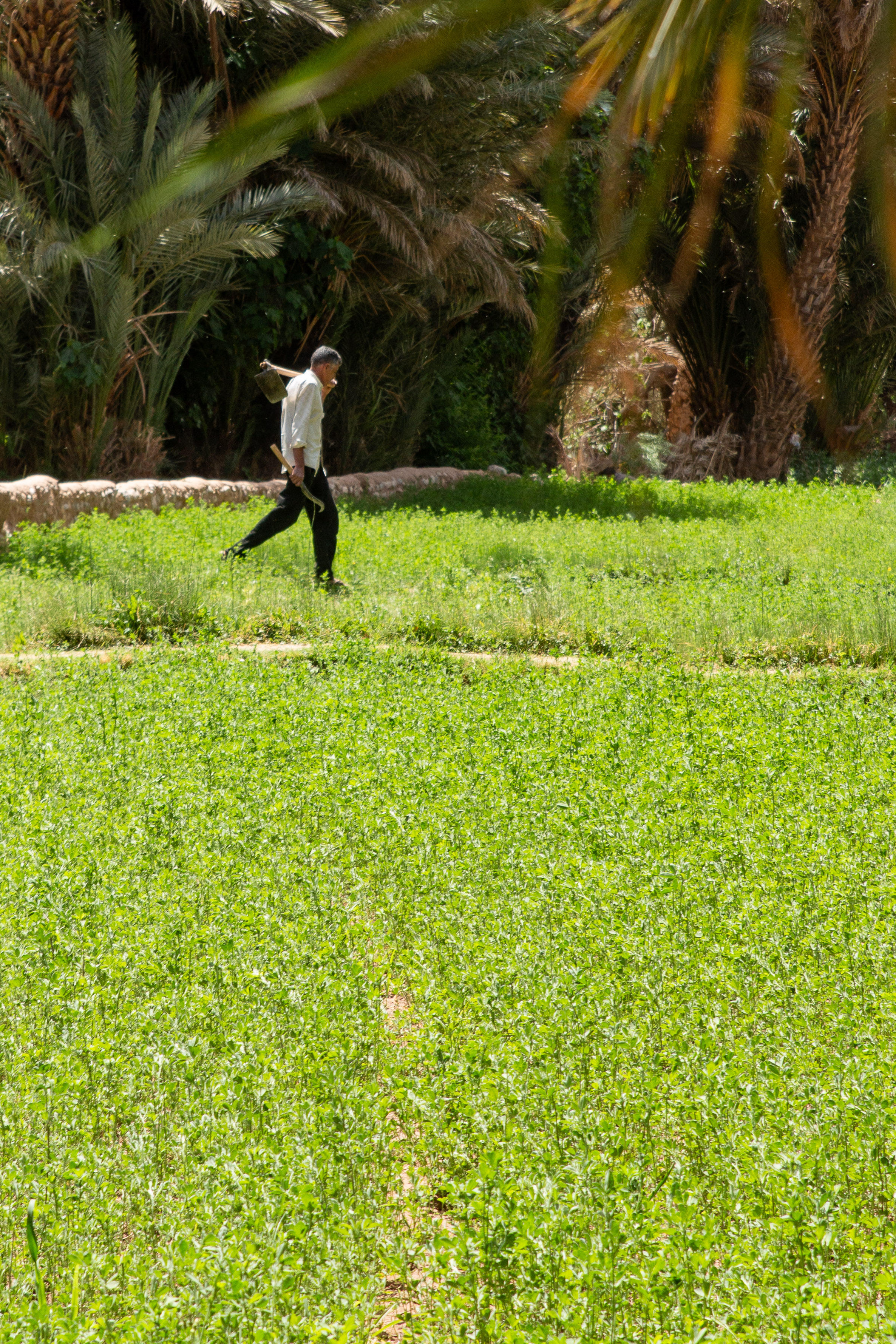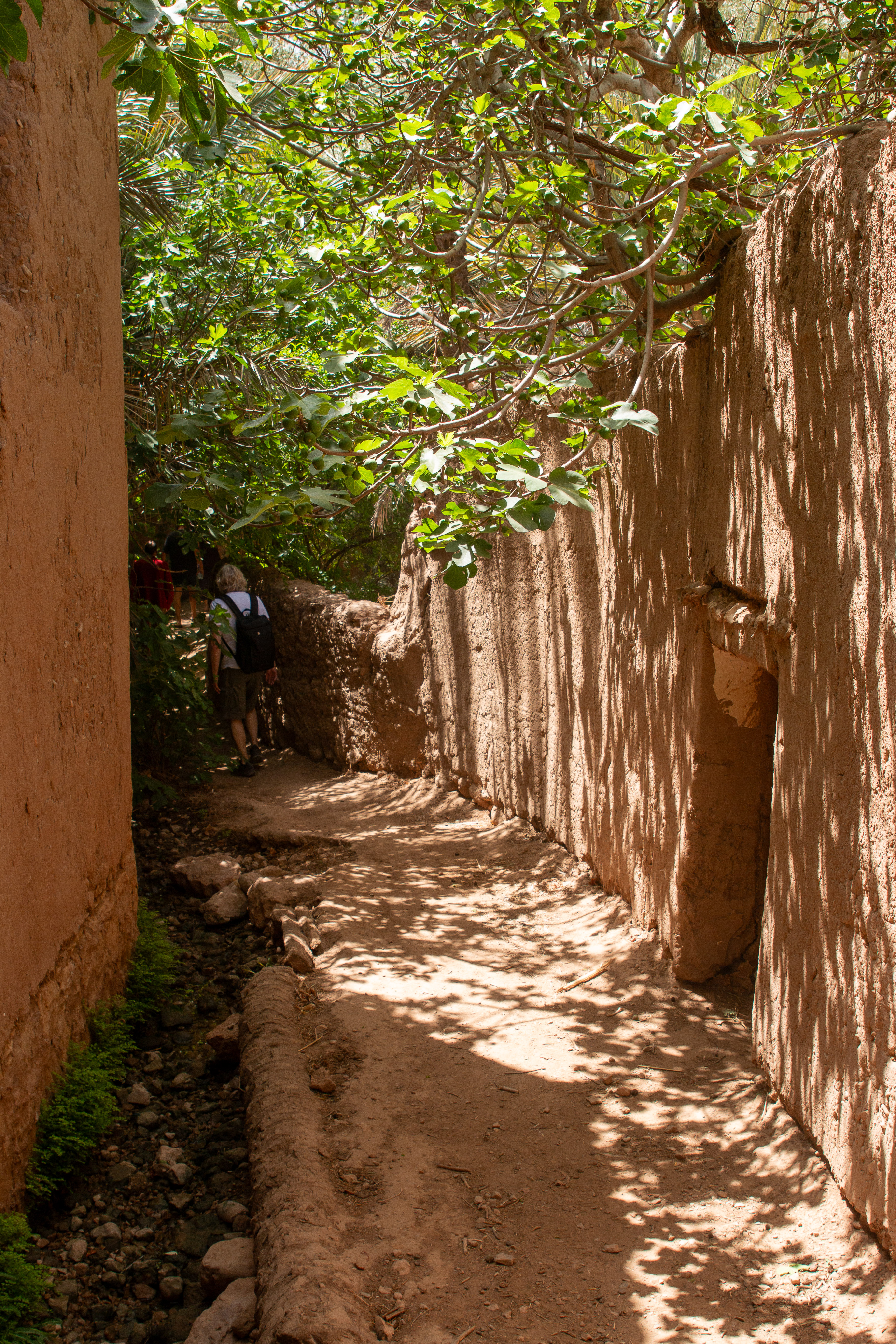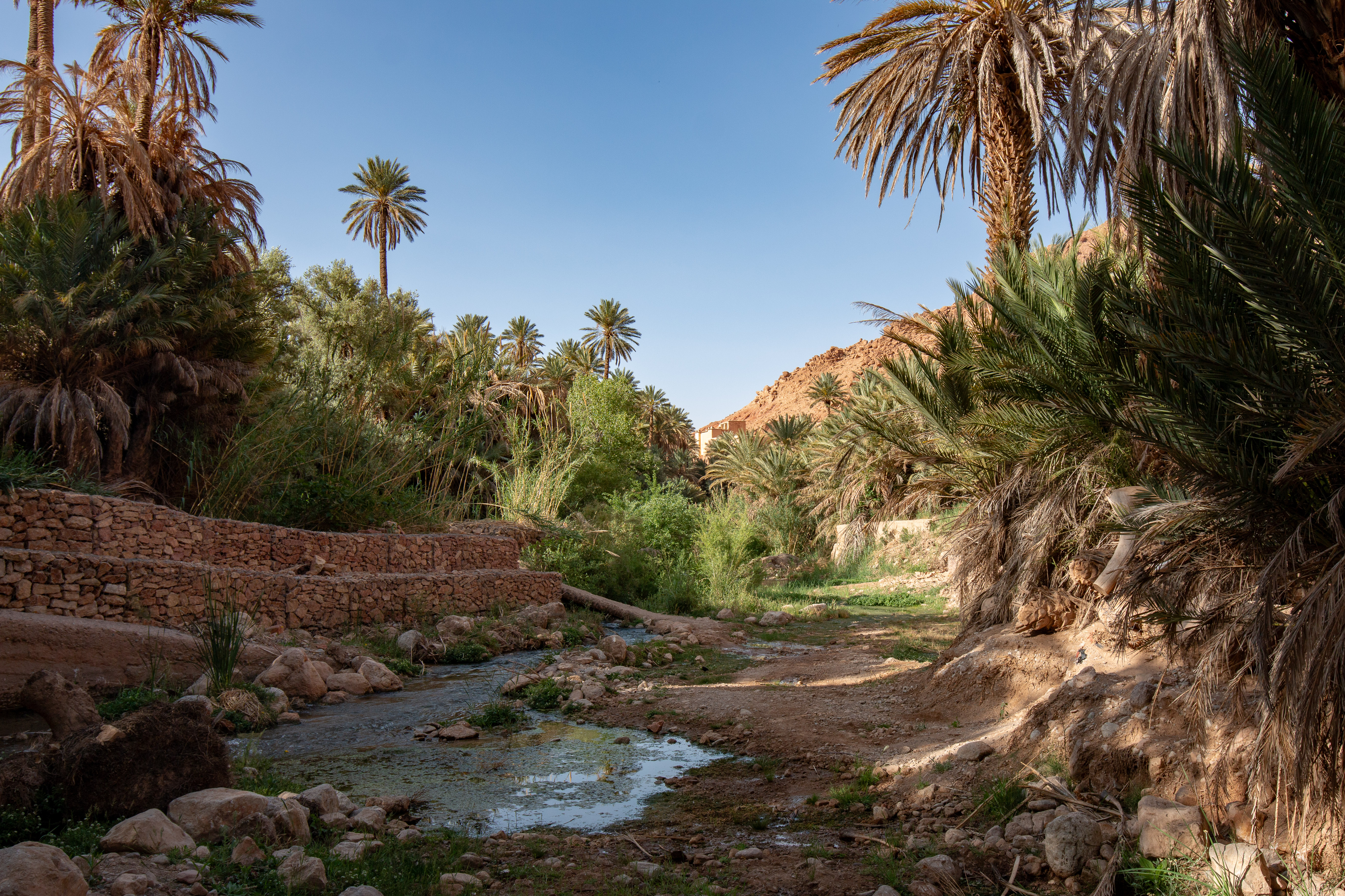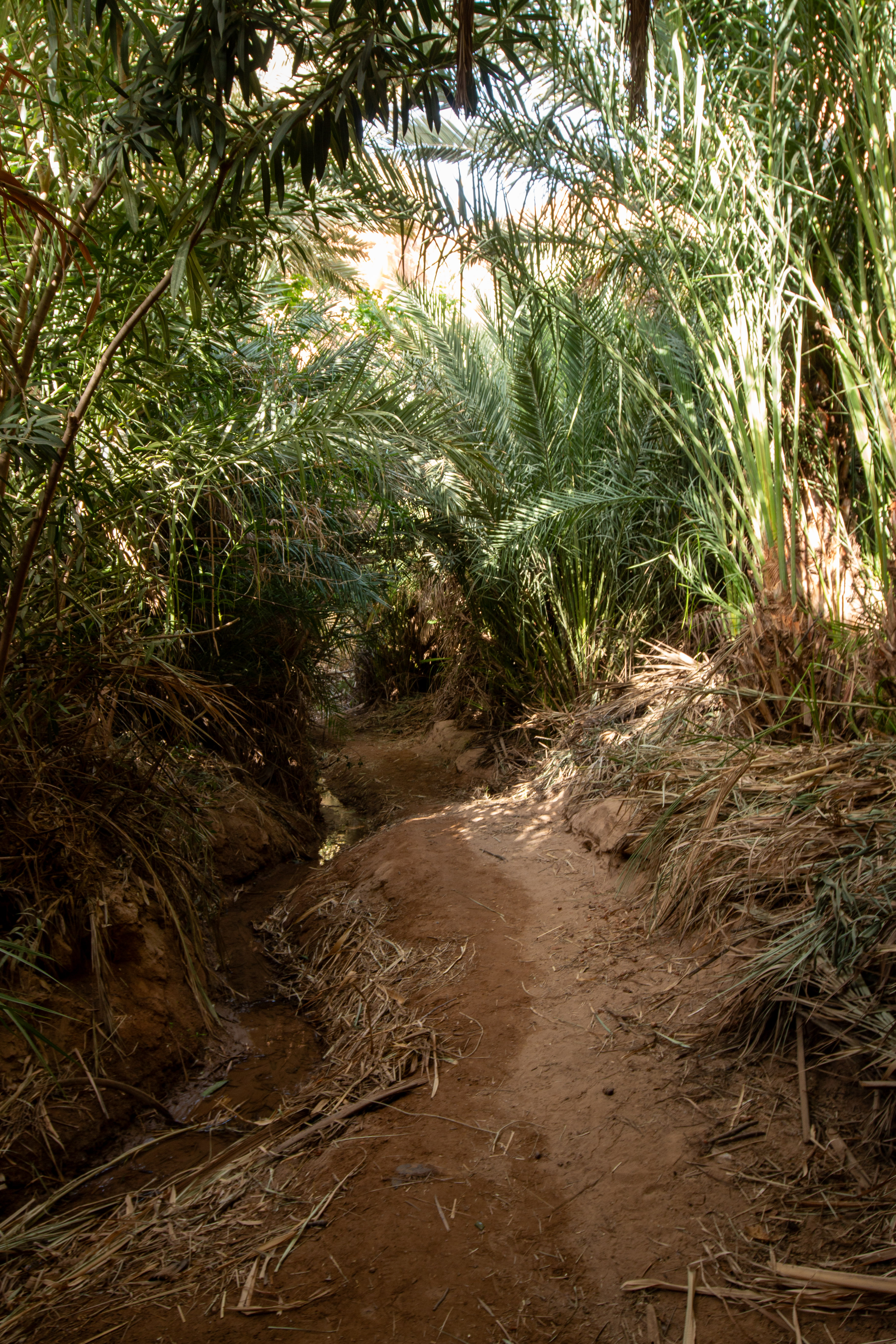 Gleich hinter dem Stellplatz fließt der Fluss, der die Tordaschlucht in Jahrmillionen gegraben hat und die Oase speist. Jetzt ist das Flussbett mit nicht mehr als einem Flüsschen gefüllt, aber die massiven Flutmauern rechts und links am Ufer zeugen davon, dass es hier offenbar auch anders aussehen kann. Der kleine Marsch durch die Oase ist hochinteressant: zur Bewirtschaftung haben sich die Bauern zu einer Art Genossenschaft zusammengeschlossen. Jeder bestellt seine eigenen Felder, ohne jegliche Maschinen archaisch von Hand, allenfalls unter Zuhilfenahme von Eselskraft. Datteln, Feigen, etwas Getreide, ein paar Mandelbäume, Bohnen, Minze gedeiht auf den kleinen Flurstücken. Die Felder, eigentlich sind es eher Lichtungen im Palmenwald, sind durch kleine Wälle in Beete unterteilt. Das Wasser aus der Schlucht wird durch ein uraltes, aber sehr klug angelegtes System von kleinen Kanälen auf die Felder geleitet. Jedem wird, je nach Verfügbarkeit eine bestimmte Zeit zugeteilt, in der Wasser auf eine Felder geleitet wird. Dies geschieht durch Öffnen bzw. Das Schliessen einzelner Kanäle. Der „Sheich“, der Vorsteher, der Älteste des Dorfes und damit der Genossenschaft fungiert als Friedensrichter bei Streitigkeiten. Dieses System funktioniert seit tausenden von Jahren und keiner wird bevorzugt oder benachteiligt. „Take what you you need and leave the rest“ ist das Motto. Die Natur dankt es.