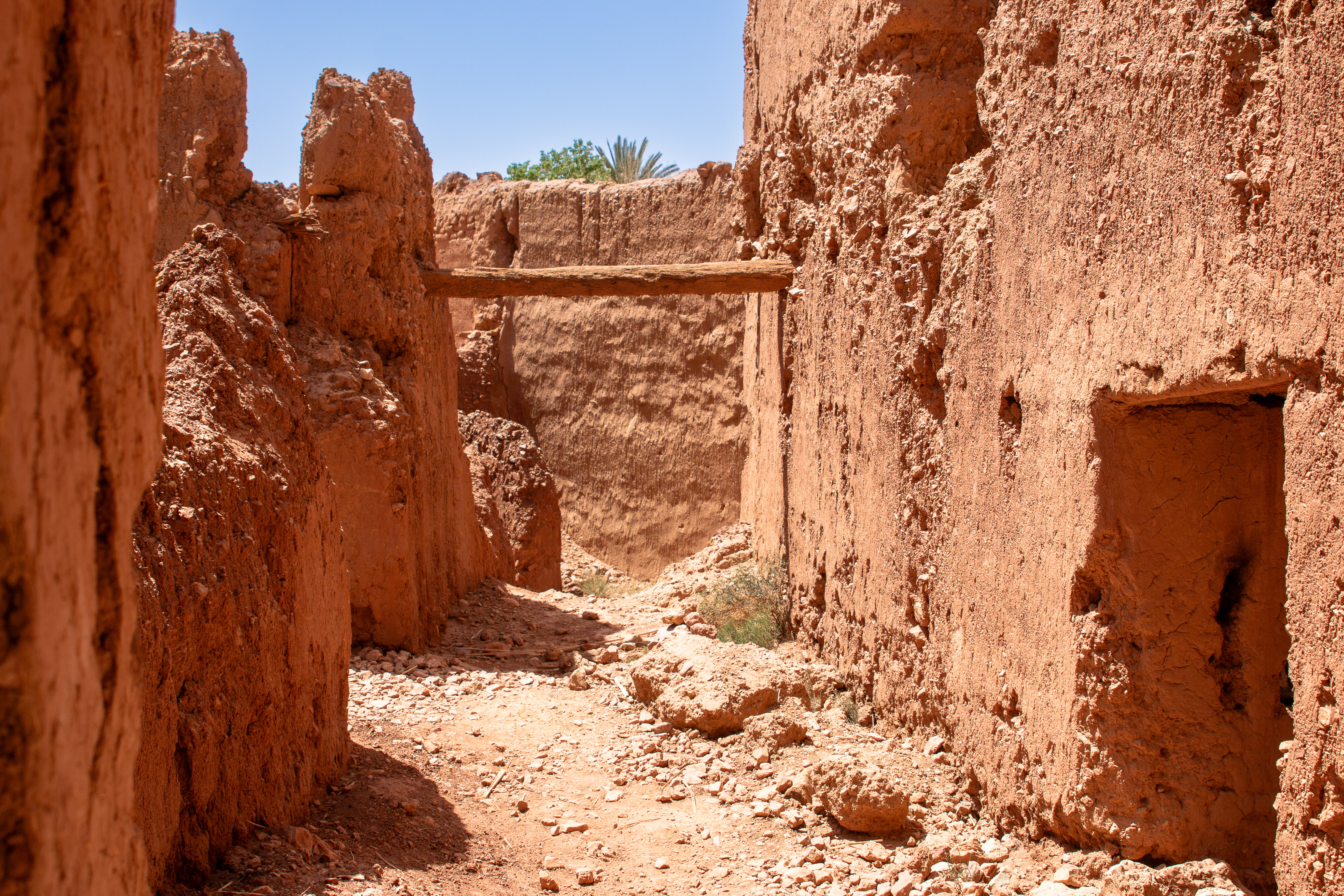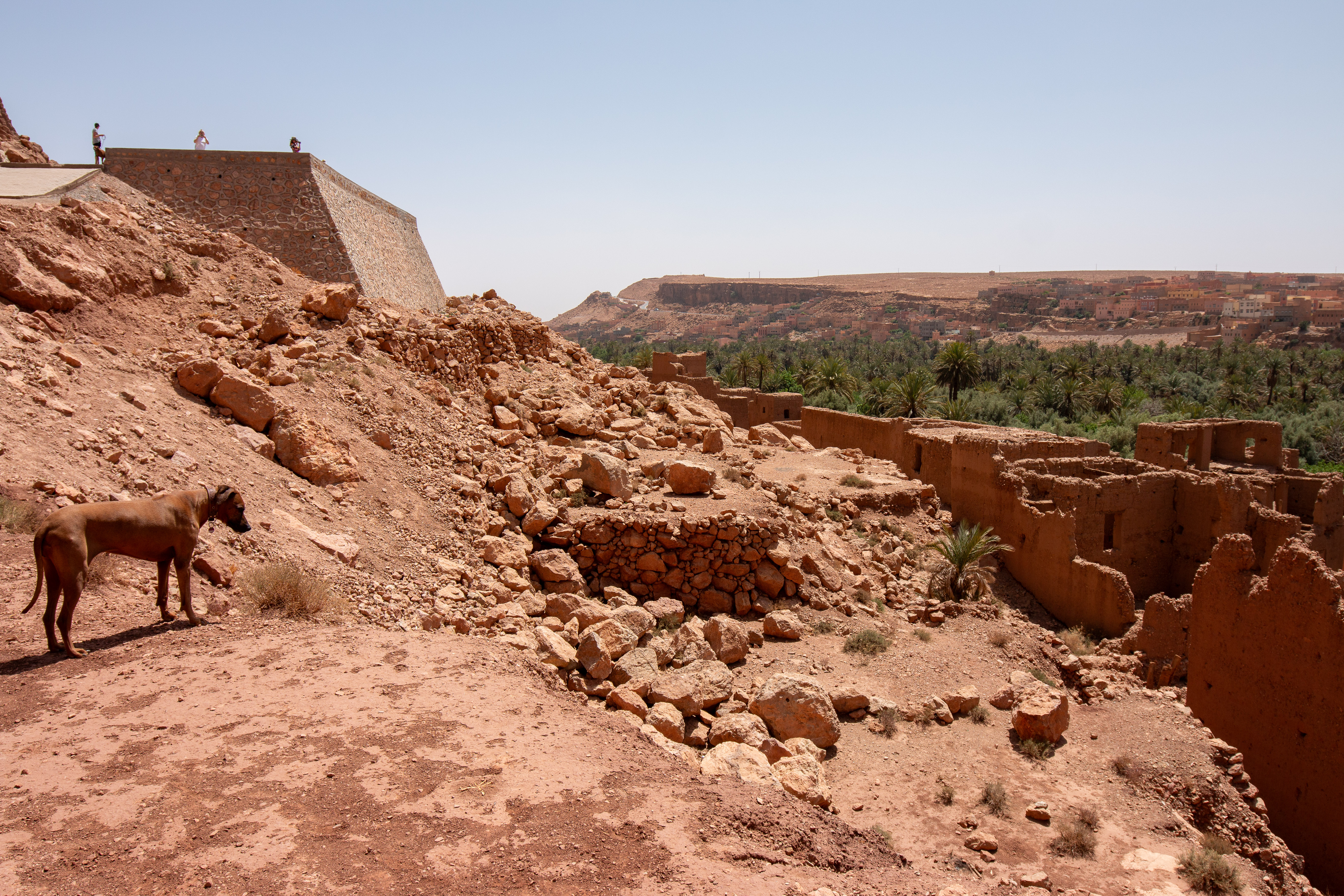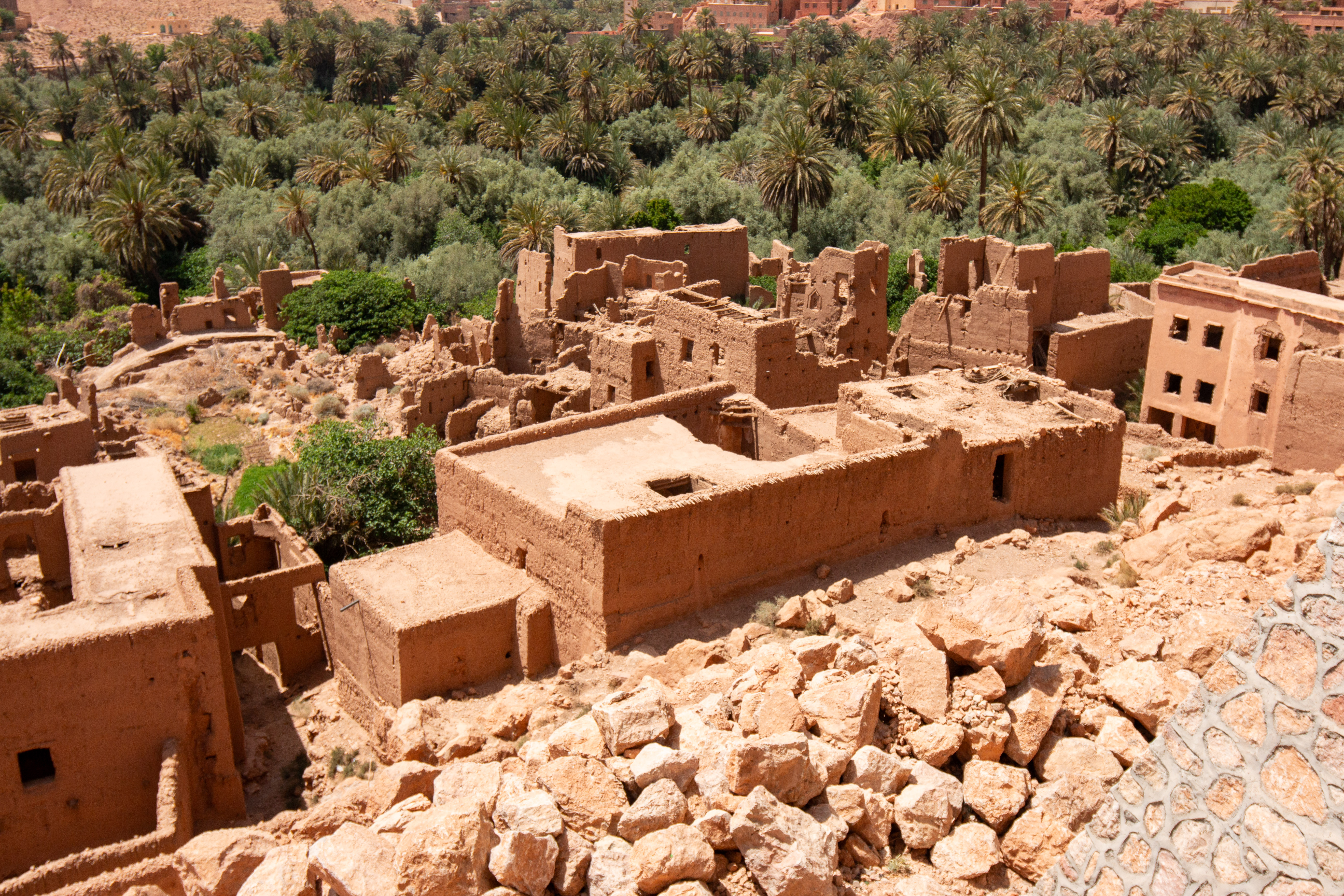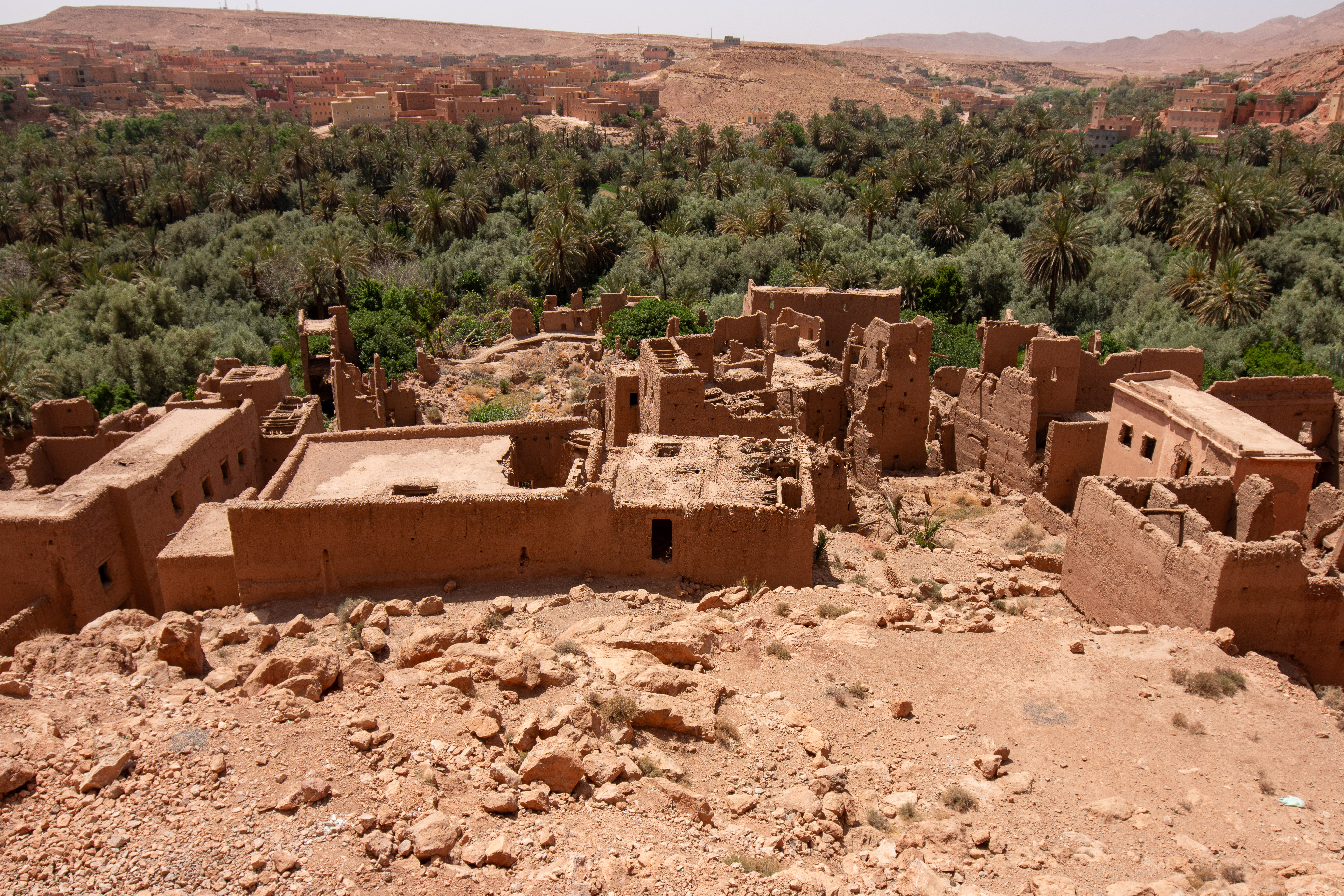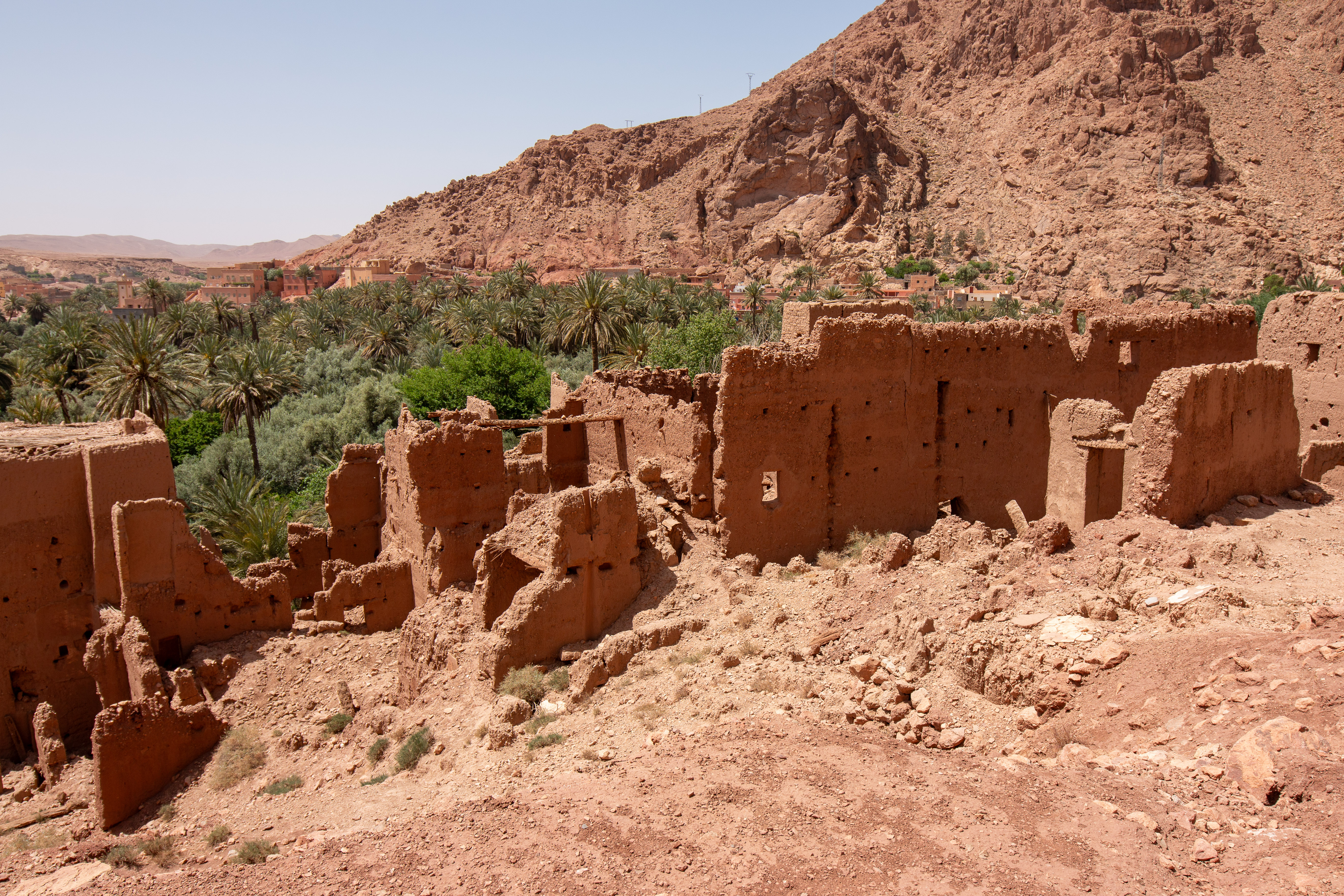 Die alte Kasbah, die sich an die Felswand der Schlucht gedrängt hatte, ist seit vielen Jahrzehnten verlassen, dem Verfall preisgegeben. Der Grund hierfür war offenbar die wachsende Gefahr von Felsabgängen durch die fortschreitende Erosion der Schlucht. Das Baumaterial der Häuser bestand aus Lehm, Stroh und Holz. Eines Tages wird sich die Natur diese Baumaterialien wieder vollständig und spurenlos zurückgeholt haben. Der drohende Felsschlag wird dabei die baldige Zerkleinerung der Bauwerke übernehmen. Ein einfaches, effizientes, ökologisches System.