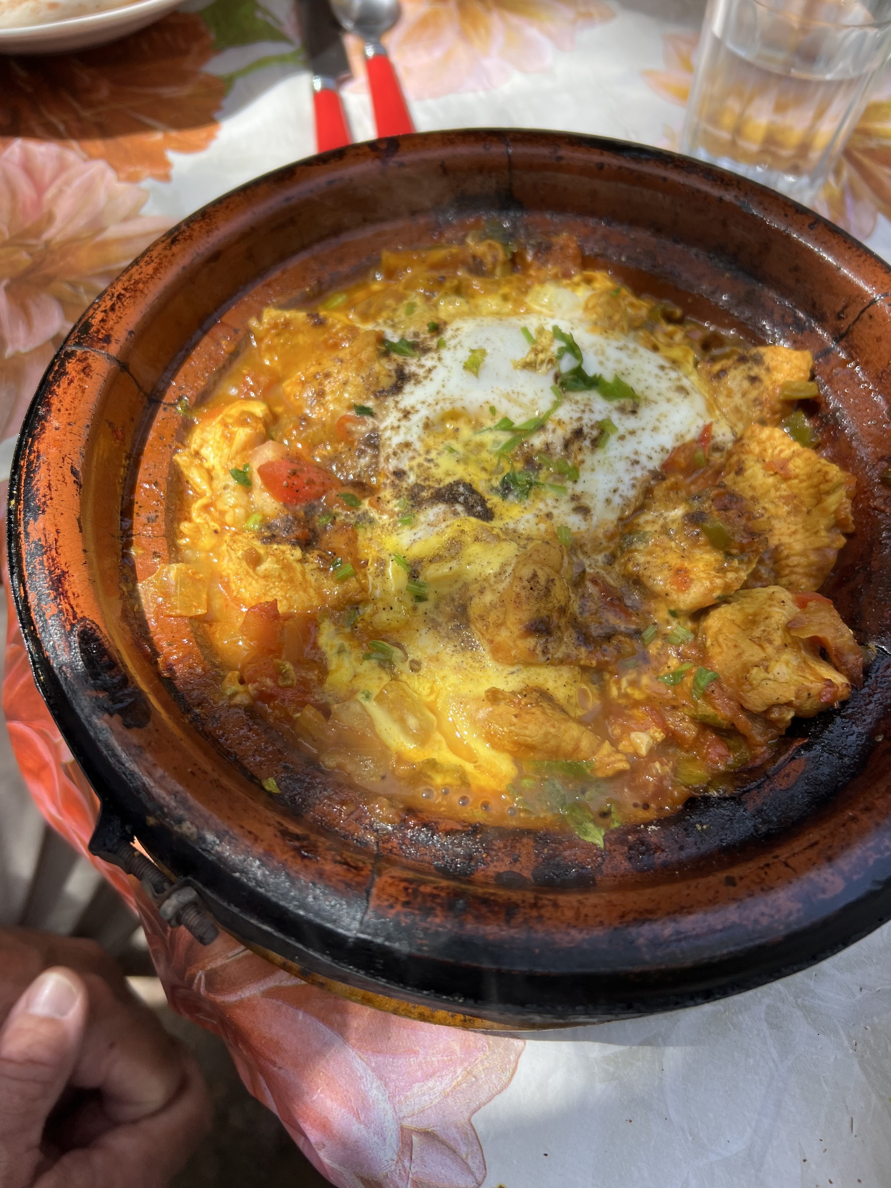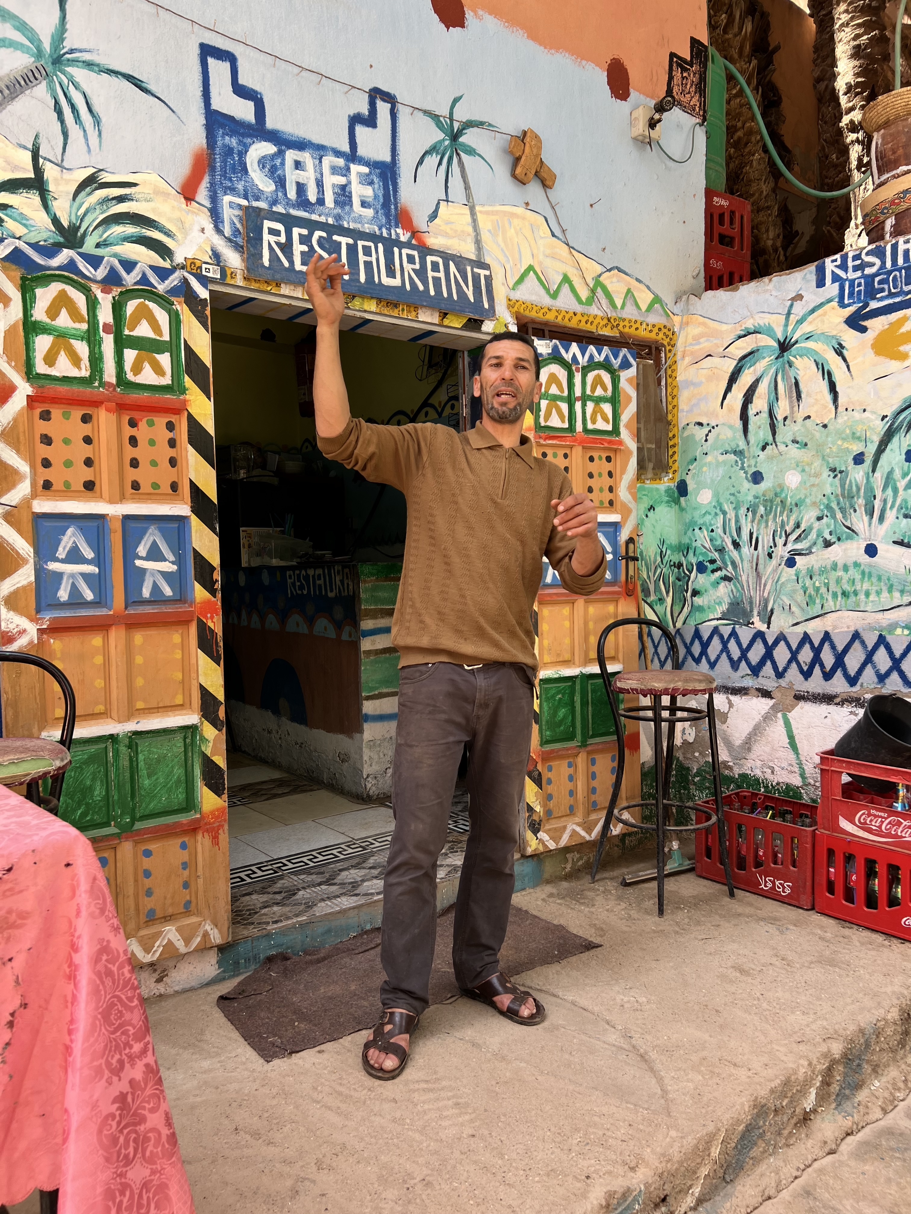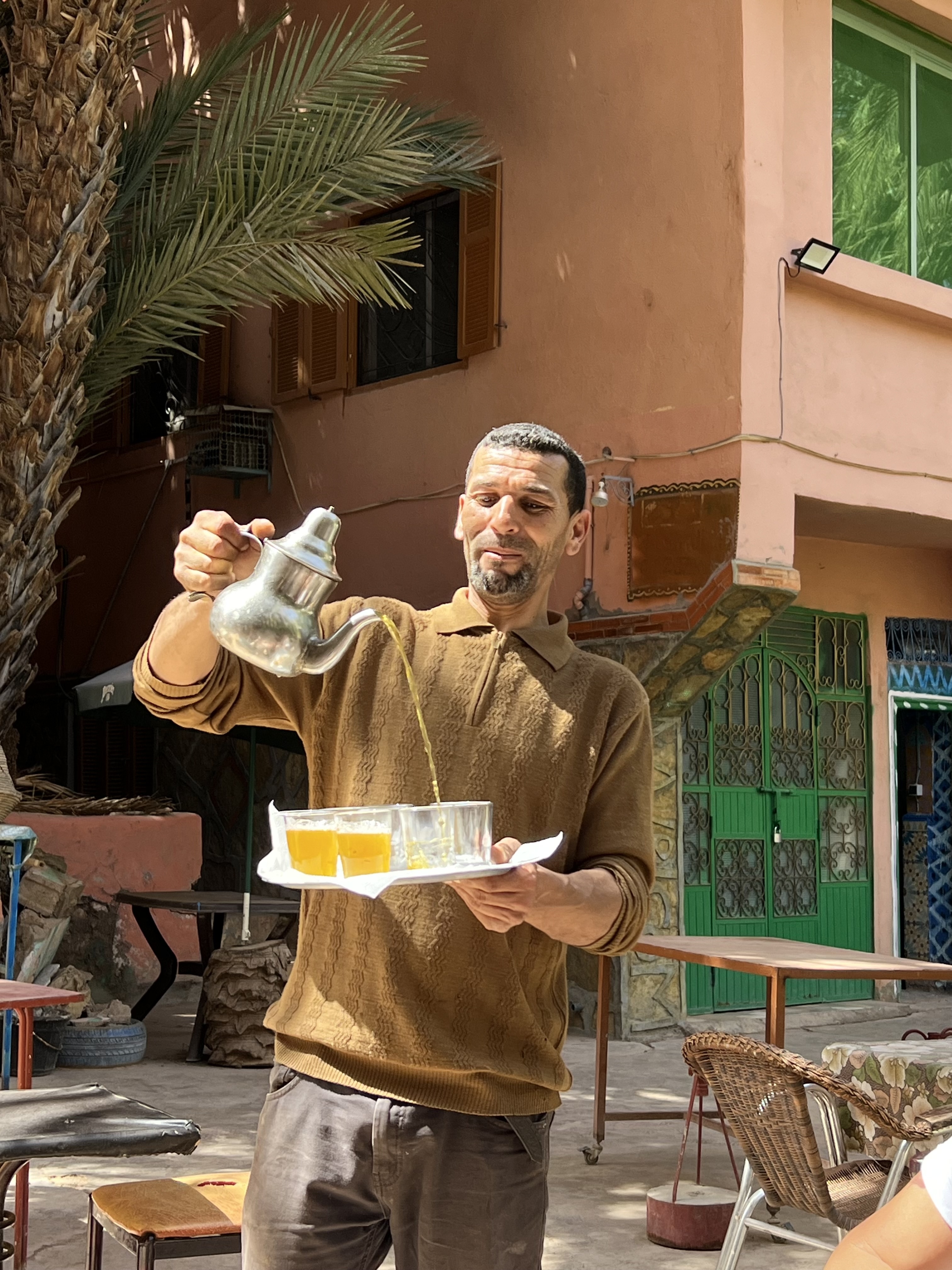 Am Ende unserer Wanderung durch die Oase kommen wir an einem kleinen Gartenlokal vorbei. Spontan entscheiden wir uns dort zu essen. Eine richtige, gute Entscheidung. Unser Gastgeber, ein sehr zuvorkommender Mann, überschlägt sich förmlich für uns. Salat, Oliven, das Brot und die Tagines sind köstlich und unverfälscht marokkanisch. Zum Abschluss des Essen für diese kleine, zufällig bunt zusammengewürfelte Gruppe gibt es für uns den bisher besten Minztee aka „Berberwhisky“ auf dieser Reise.
