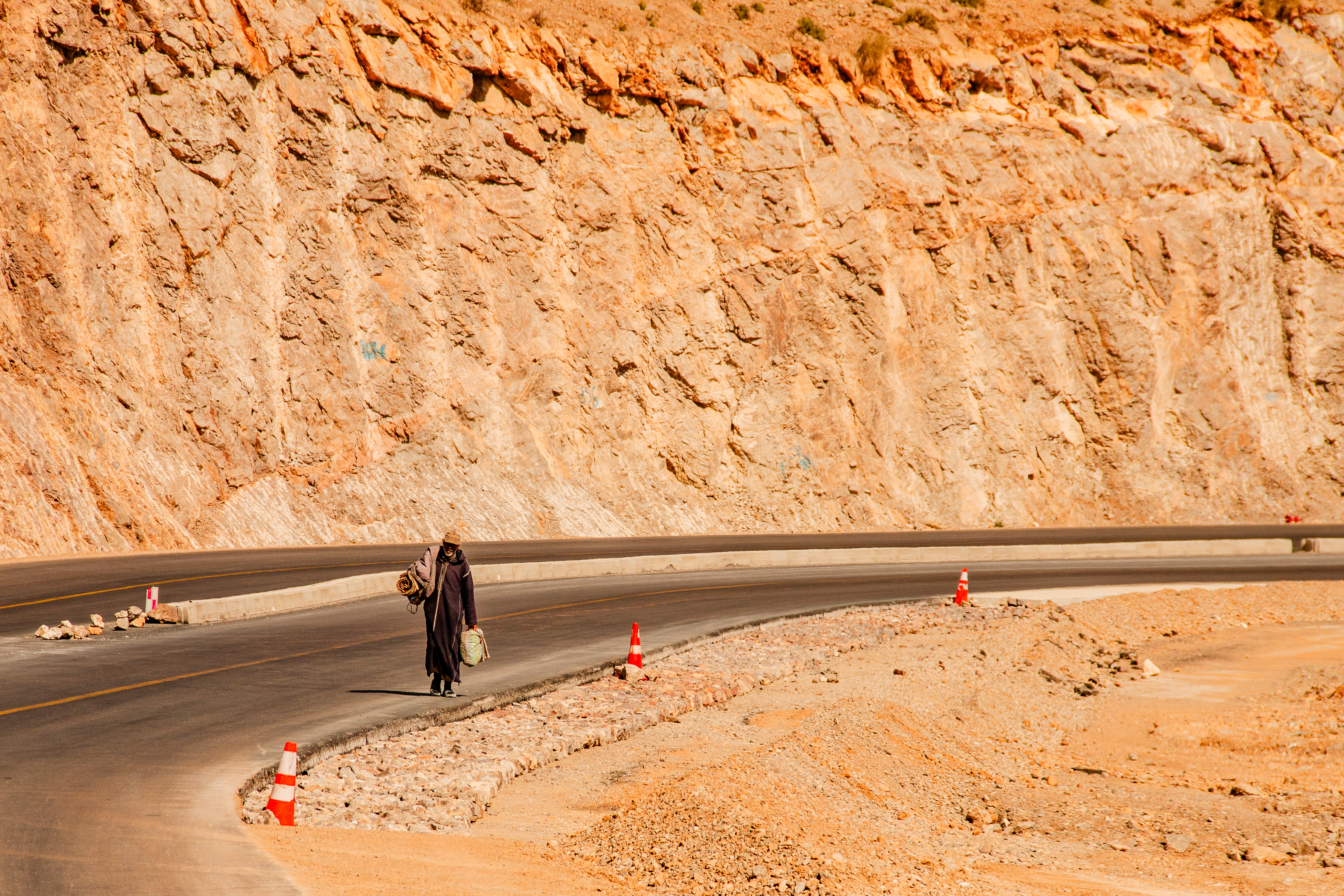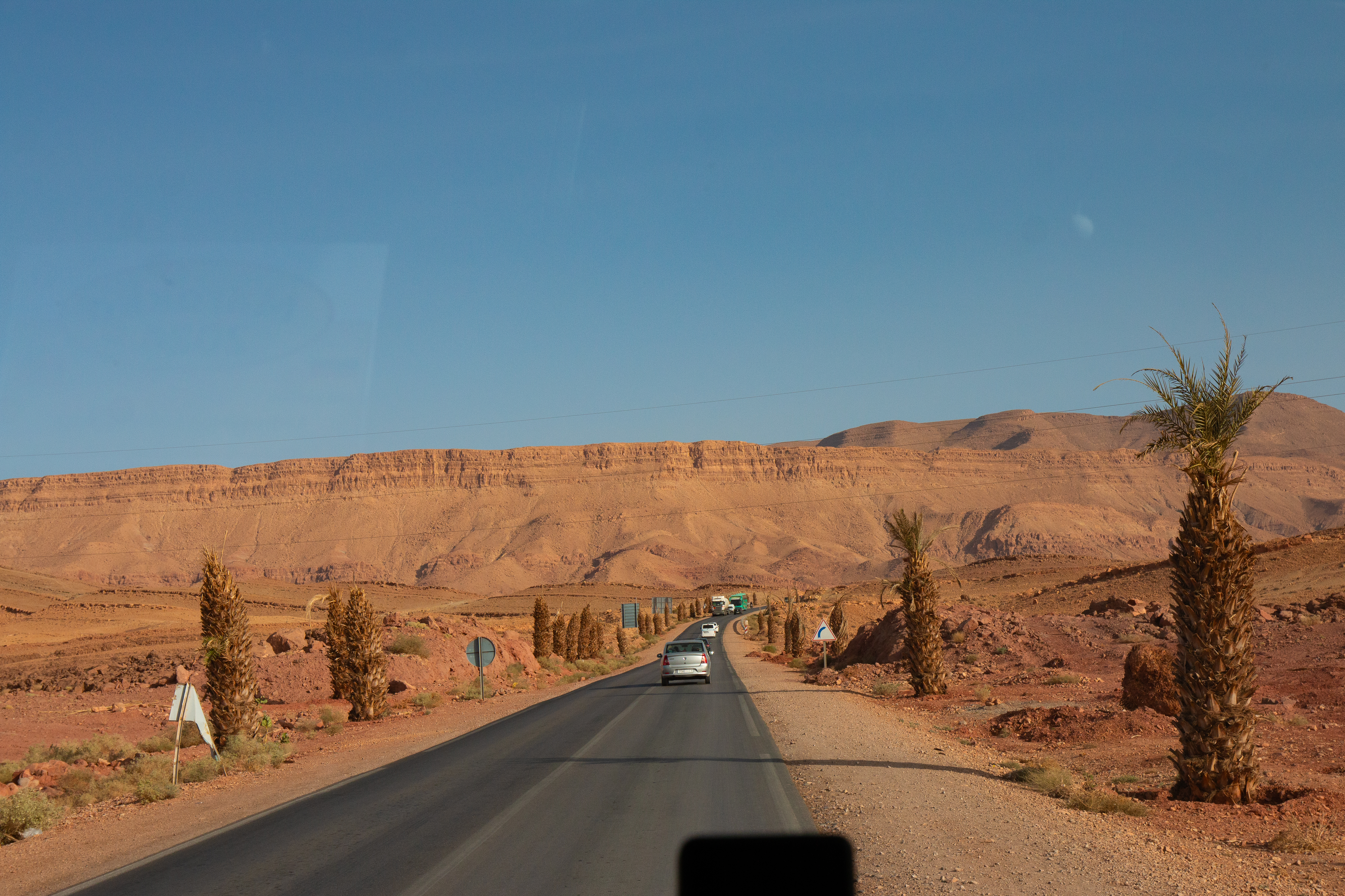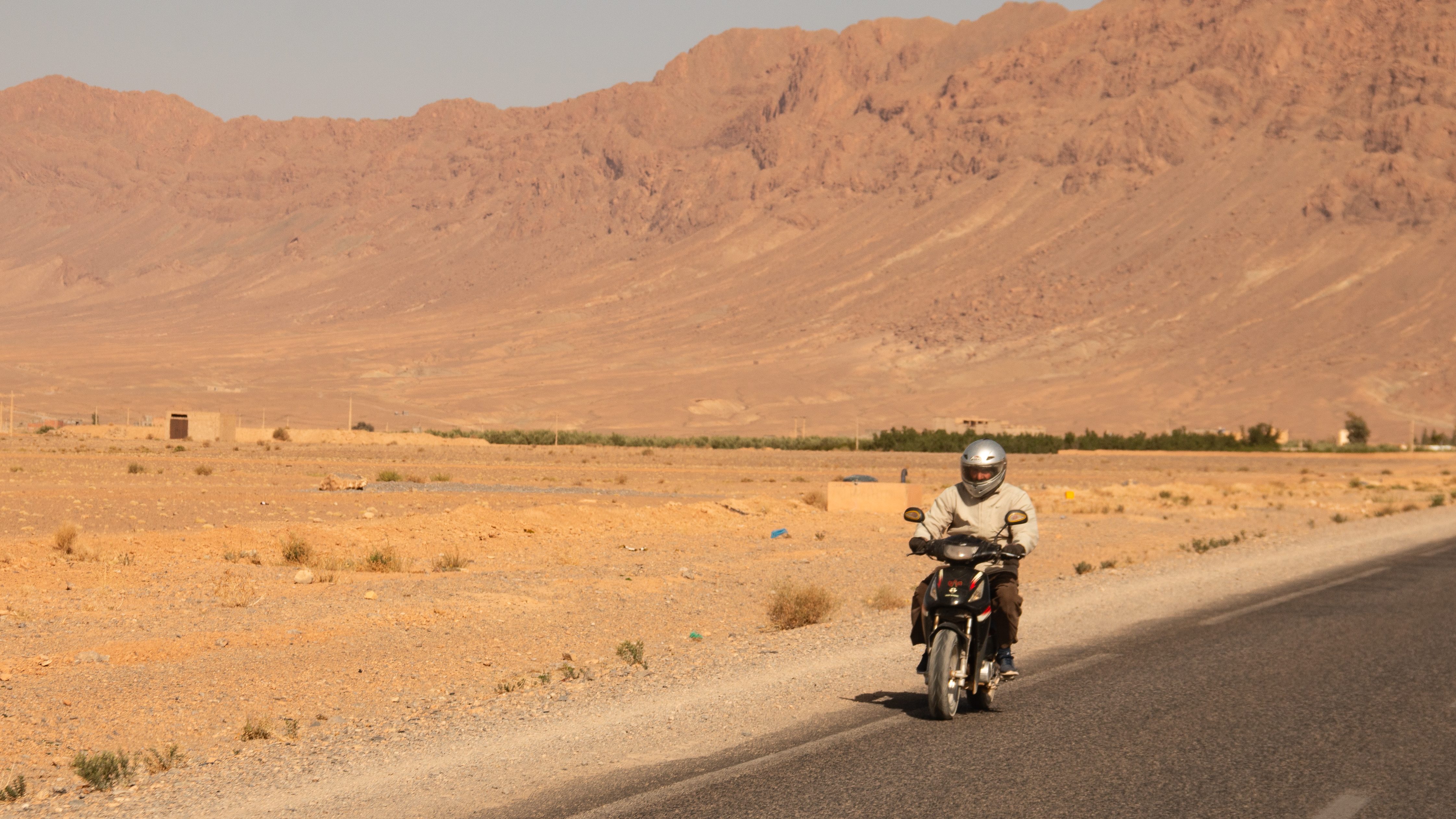 Ein lokales Hotel, eins für einheimische Gäste und somit ohne Lizenz zum Alkoholausschank, reicht das landestypische Abendessen: Tagine „mit irgendwas“. Mir schmeckt es, die zum Nachtisch gereichten Orangen sind aber steinhart und mit dem stumpfen Messer nicht zu schälen. Also puhle ich sie mit den Fingern auf und esse die Segmente aus der Hand. Ein schwerer Fehler, wie ich am nächsten Morgen schmerzlich feststellen muss. Die Früchte waren sicher nicht gewaschen gewesen und die „Rache Montezumas“ ist durchschlagend. Mit einer ordentlichen Dosis Imodium kriege ich die Sache währende des Tages „in den Griff“. Übrigens ist es in solchem Fall echt von Vorteil, wenn man mit eigenem Badezimmer unterwegs ist.