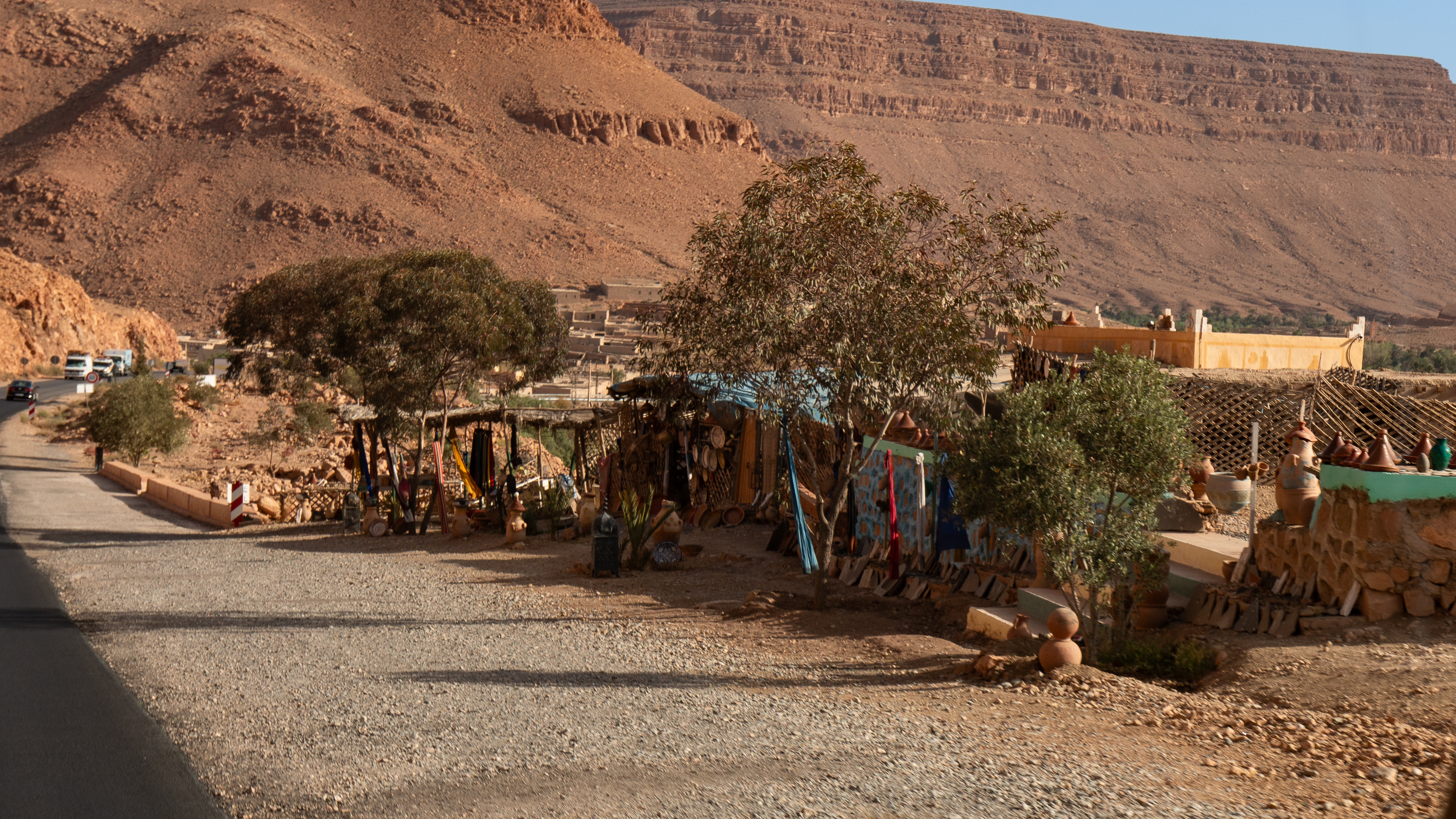 Unterwegs haben wir wieder einfache, meist improvisierte und halb versteckte Verkaufsstände mit allem möglichem Kram gesehen. Inzwischen wissen wir, dass es in Marokko keinerlei Sozialhilfe gibt. Allein die Preise für Grundnahrungsmittel wie Brot und Mehl sind staatlich kontrolliert und werden subventioniert. So kostet z.B. ein kleines Baguette (500 g) umgerechnet etwa 45 Cent. Auch das Schulwesen bis zu universitären Ausbildung ist in Marokko kostenfrei. Die Gesellschaft ist stark durch familiäre Bindungen geprägt, die Großfamilie erfüllt eine wichtige soziale Funktion, da alle Generationen sich gegenseitig unterstützen und helfen. Im Schnitt ernähren drei Menschen (Männer) in Arbeit alle Generationen einer Familie. Jeder, der keine feste Arbeit hat, muss „eine Idee“ haben, um etwas zu verdienen. Eine Mittelschicht ist in Marokko quasi nicht vorhanden.