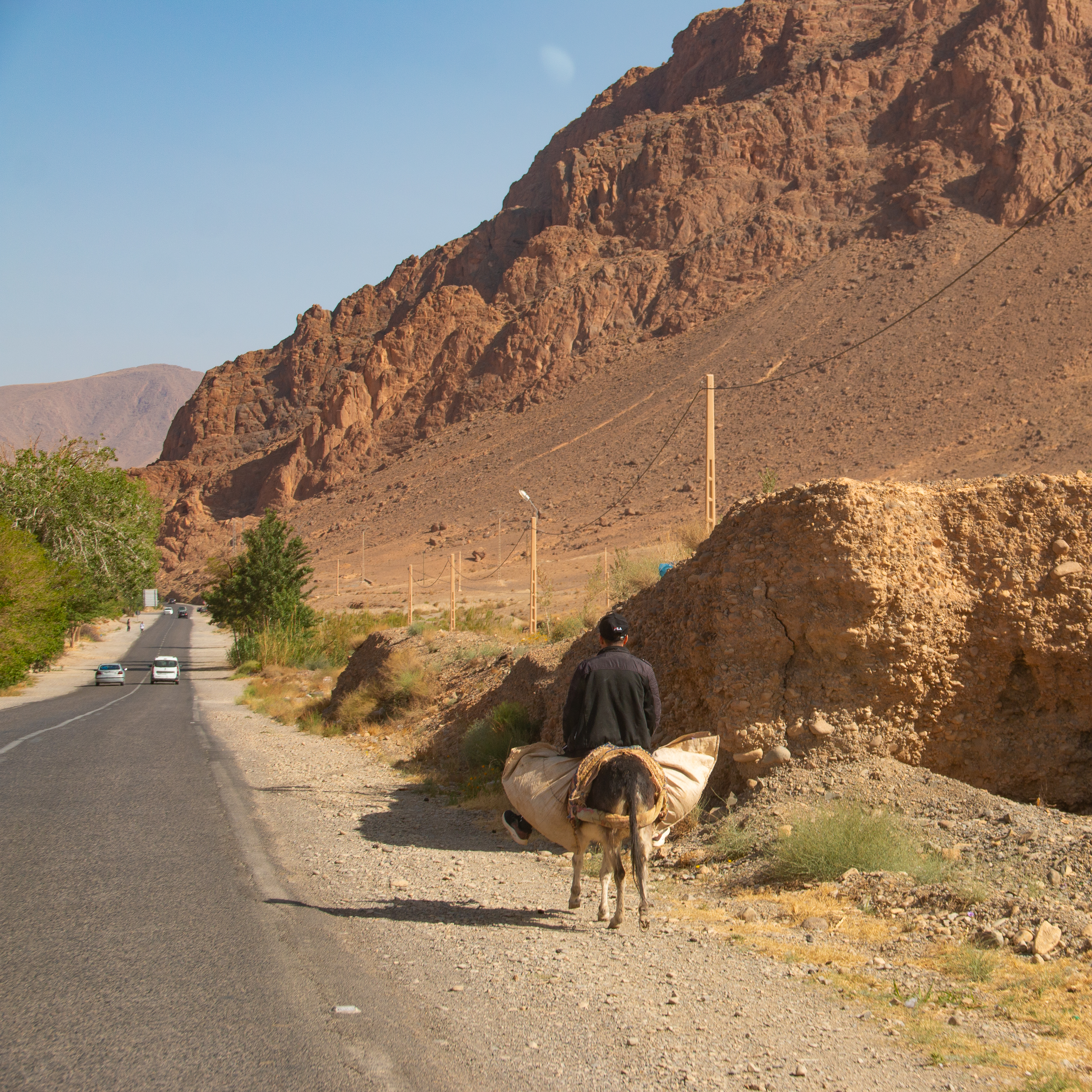 Das Vorwärtskommen in Marokko ist oft beschwerlich: Mit dem Moped, auf dem Esel oder gar zu Fuß durch die heisse Region des mittleren Atlas unterwegs zu sein ist, gerade im Sommer, kein Zuckerschlecken. Bis zu 35-38 Grad, selbst in den großen Höhen dies Gebirges, sind normal. Wir haben es da besser, die Klimaanlage im Auto ist ein wahrer Luxus.