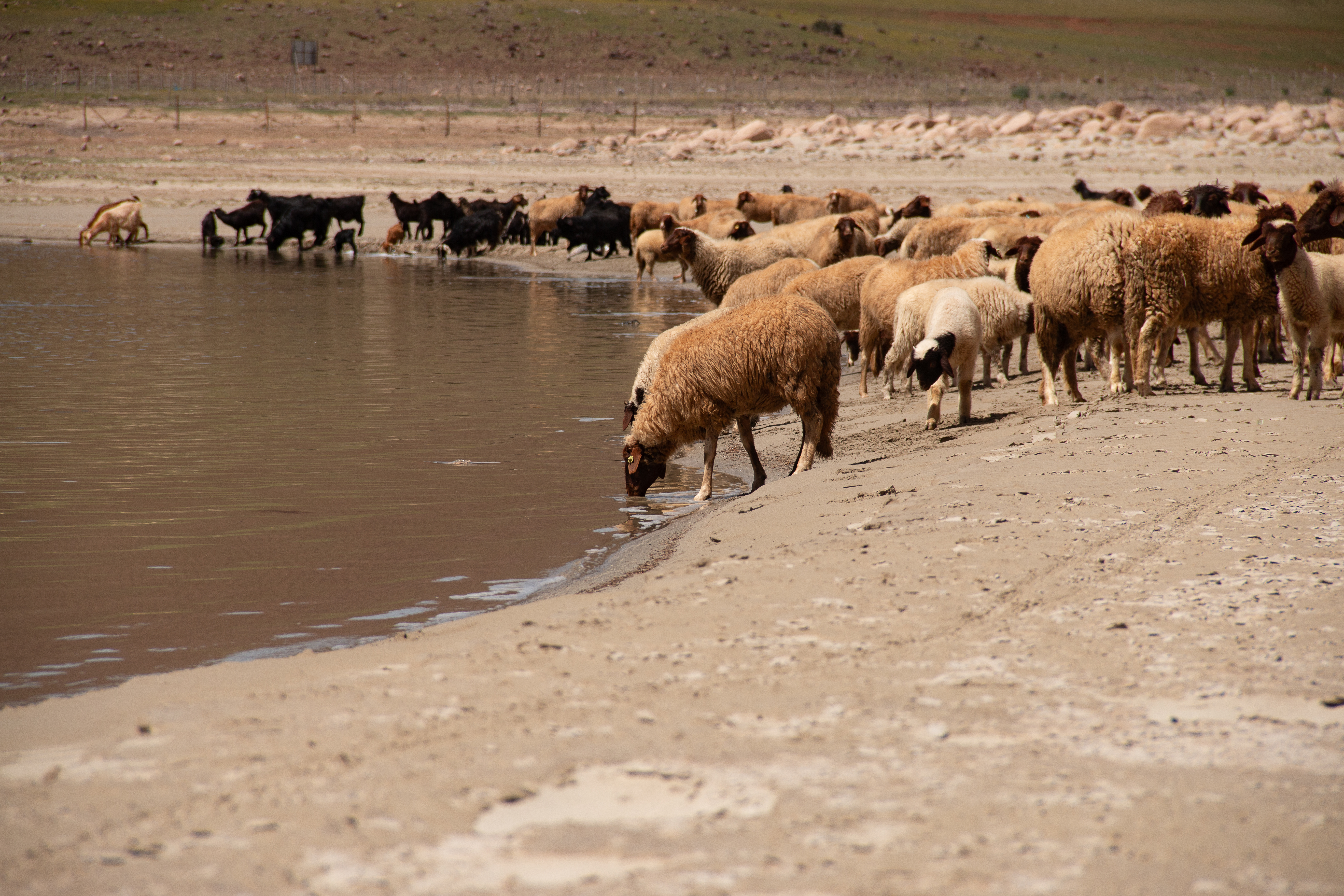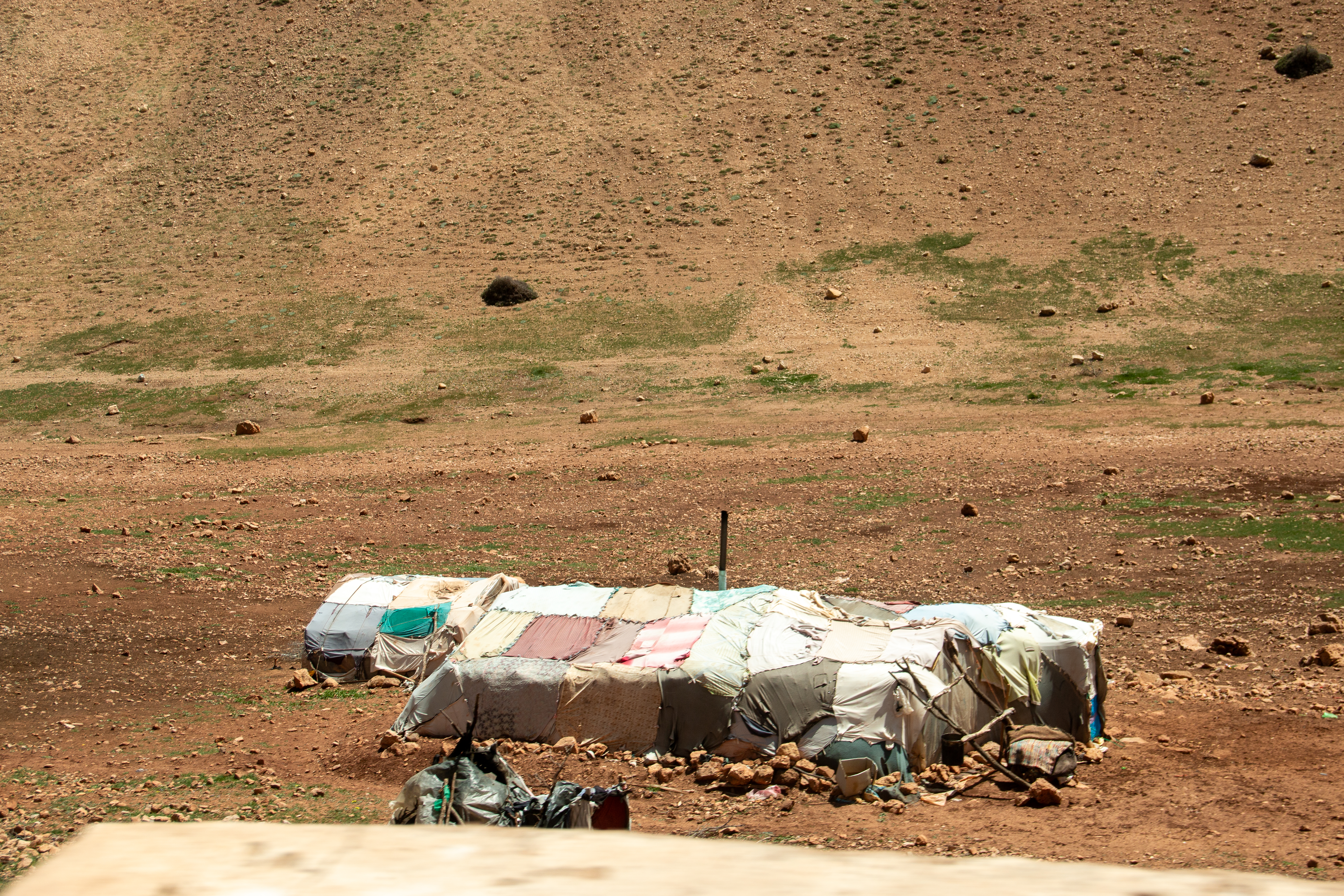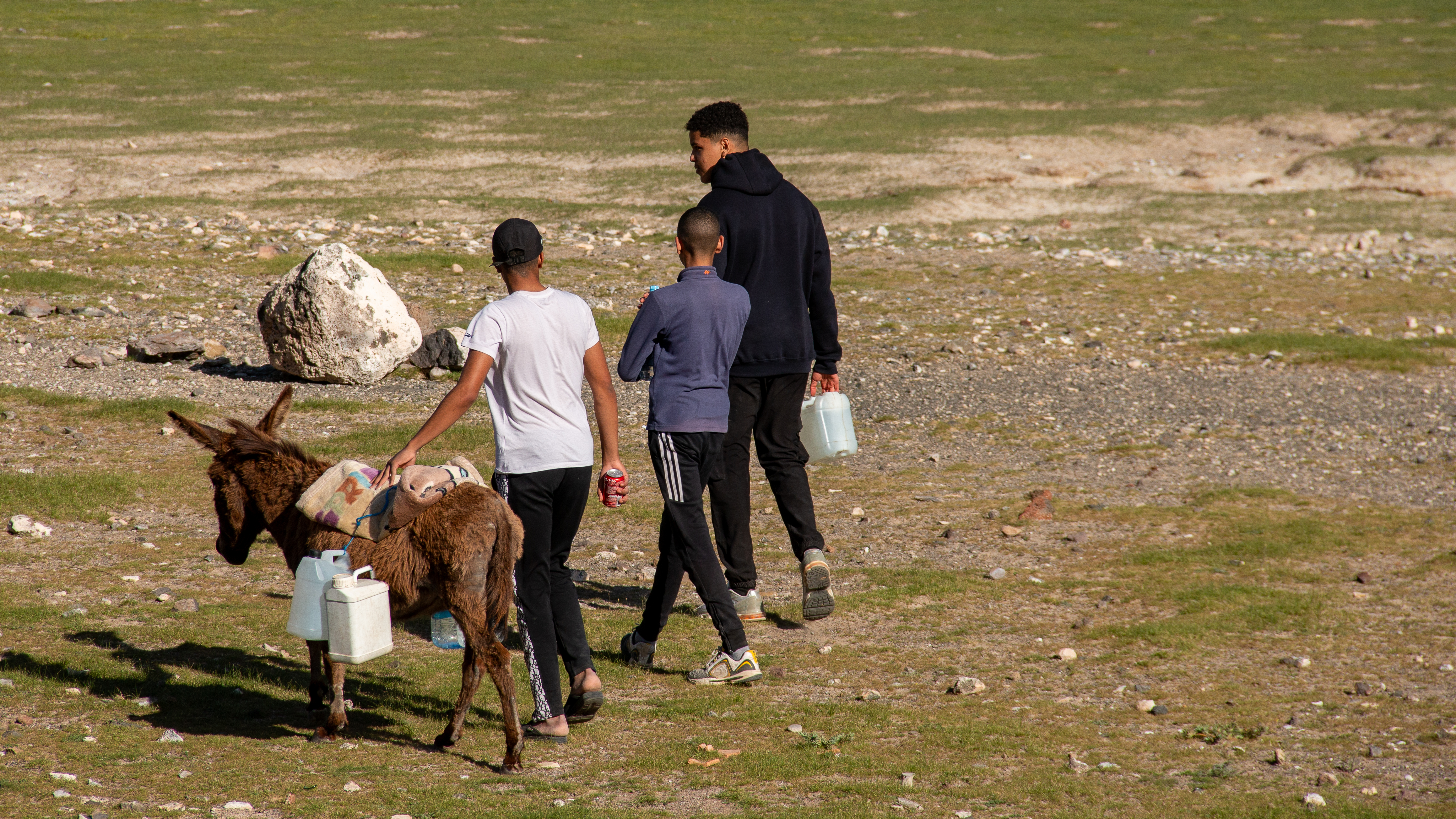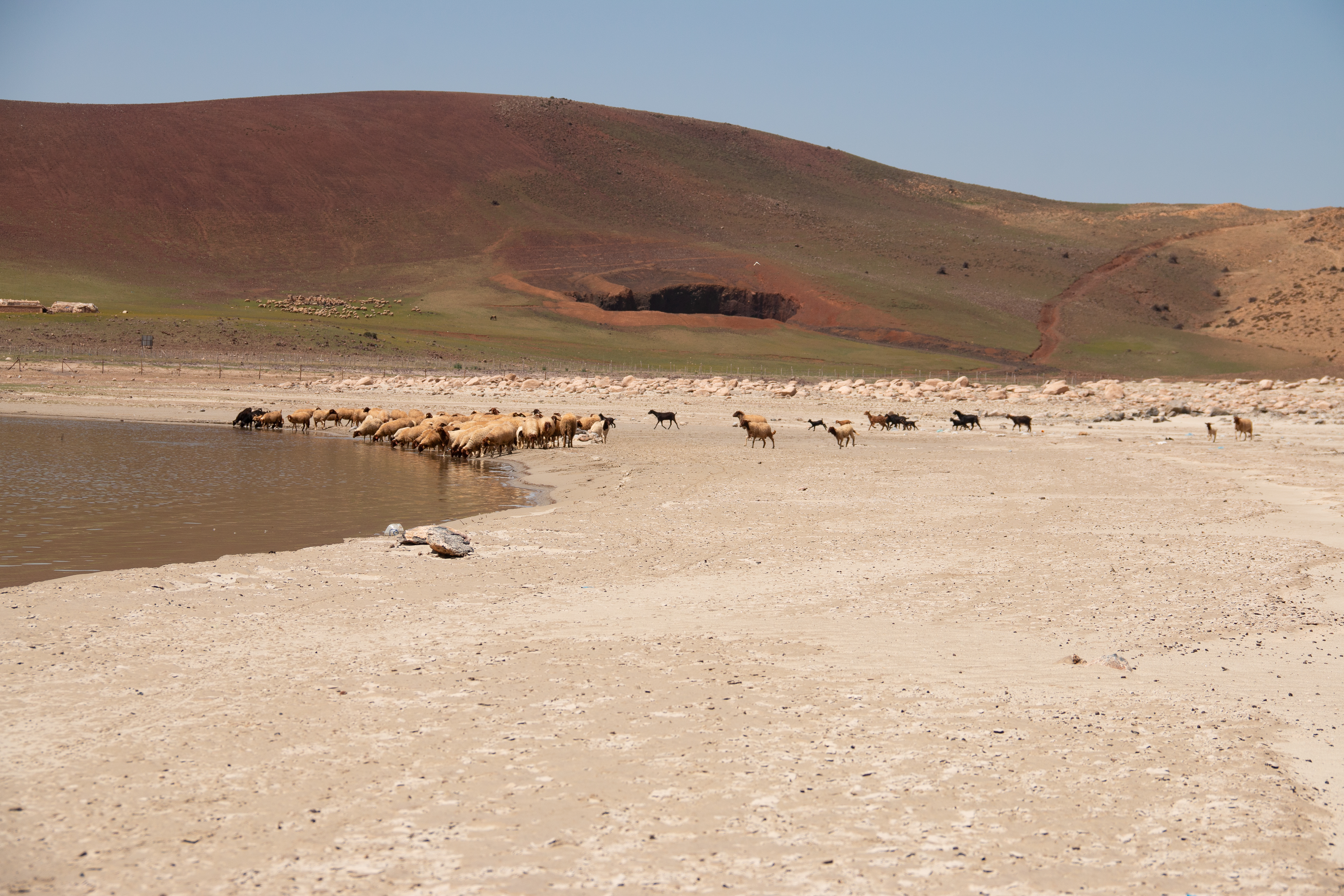 In der Tat ist es dort oben sehr, sehr einsam; nur ein paar wenige Tagesgäste können wir am späten Nachmittag ausmachen. Draussen, dort wo wir stehen, weiden noch echte Nomaden ihre Schafherden und kommen gegen Abend zum offenbar einzigen Wasserhahn der Gegend. Mit ihrem Esel holen sie Trinkwasser in spärlicher Dosis, ein paar Kanister nur, während wir unseren Frischwassertank mit mehreren hundert Liter füllen. Peinlicher Überfluss.