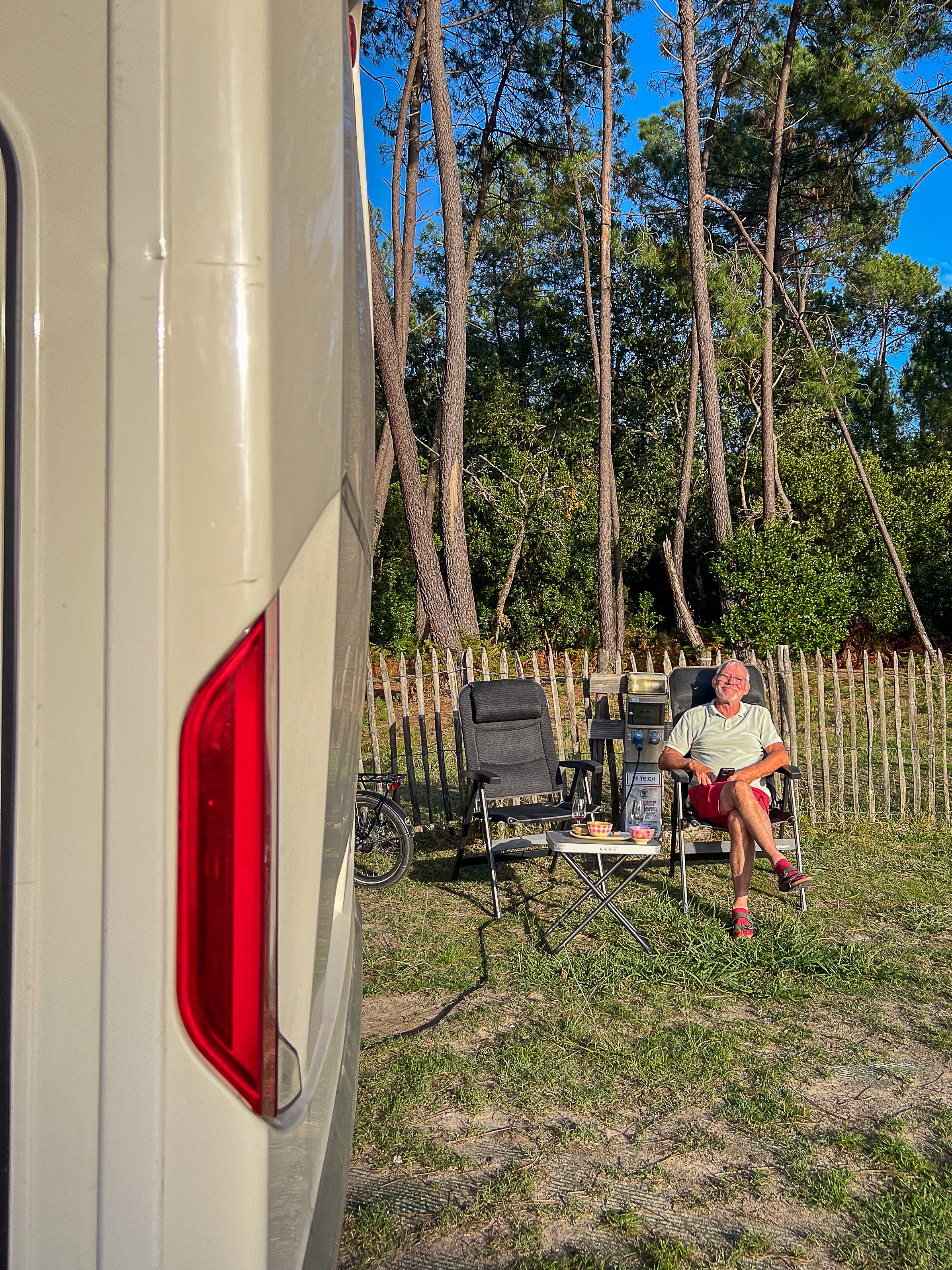 Nach genüsslich-gemütlicher Reise kommen wir mittags in einem Vorort von Arcachon an. Der Stellplatz liegt auf der Lichtung eines weitläufigen Kiefernwaldes, eigentlich ganz idyllisch. Aber in Sichtweite gibt einen grossen Freizeitpark mit Schwimmbad und allerlei anderem Gedöns. Zum Glück für uns hat er geschlossen. Im Sommer ist hier sicher die Hölle los, Lärmpegel inbegriffen. Da würden wir nicht so gerne hier sein wollen. Aber im Moment ist alles wunderbar ruhig. Wir haben den Platz deshalb ausgesucht, weil wir uns mit Freunden aus Süddeutschland hier verabredet haben. Als „Normalreisende“ haben sie ein Quartier in Arcachon, daher suchten wir die Nähe zur Stadt.