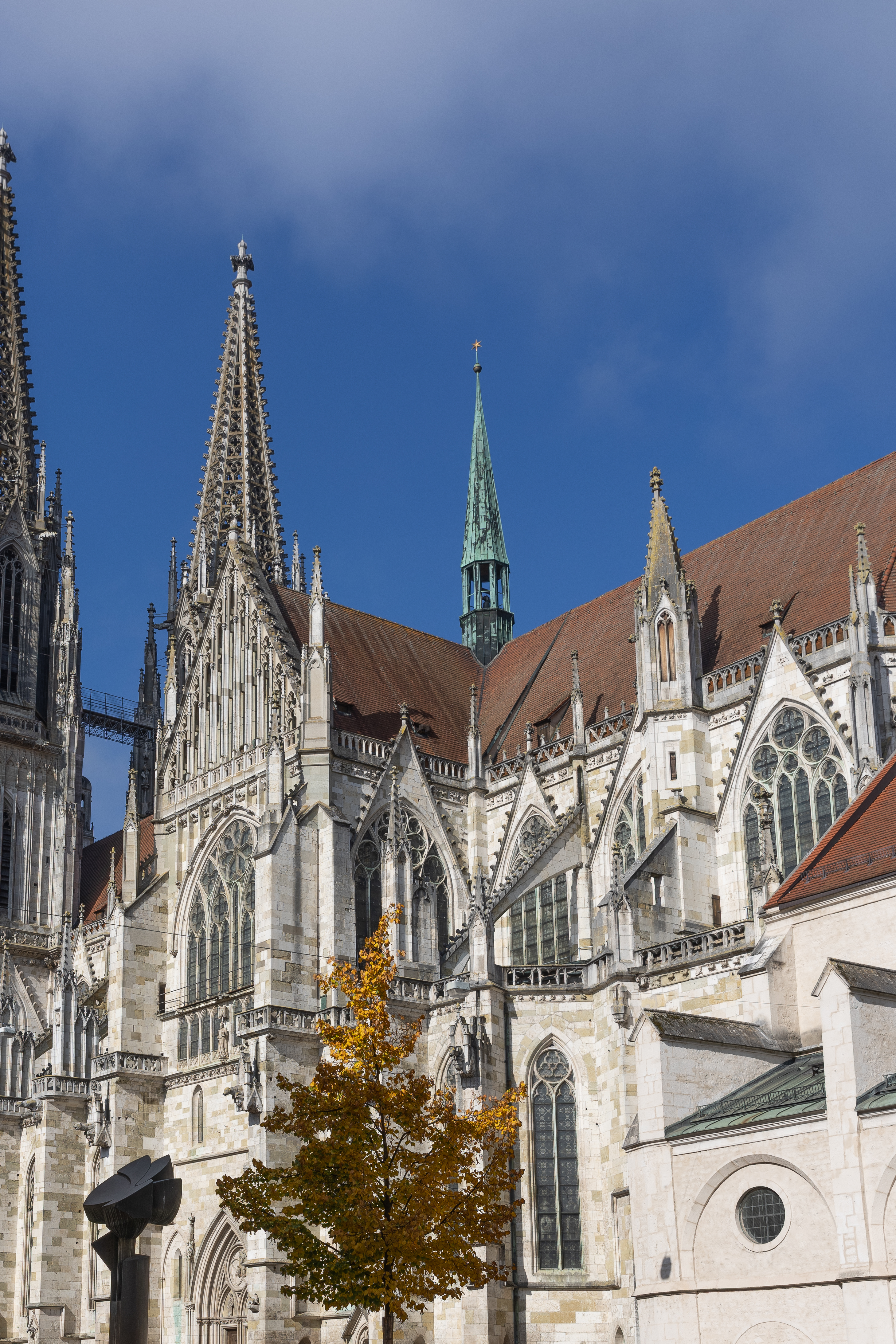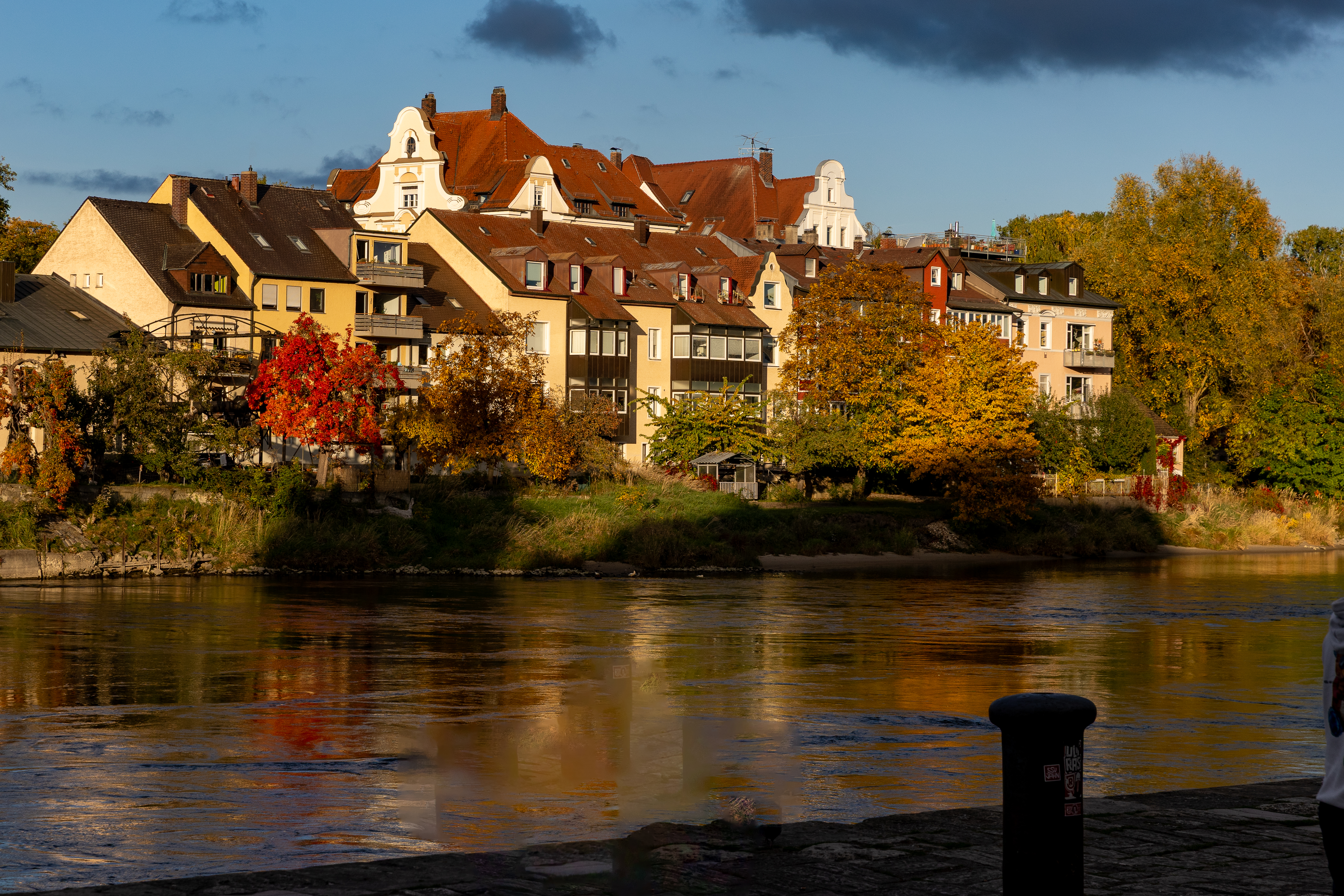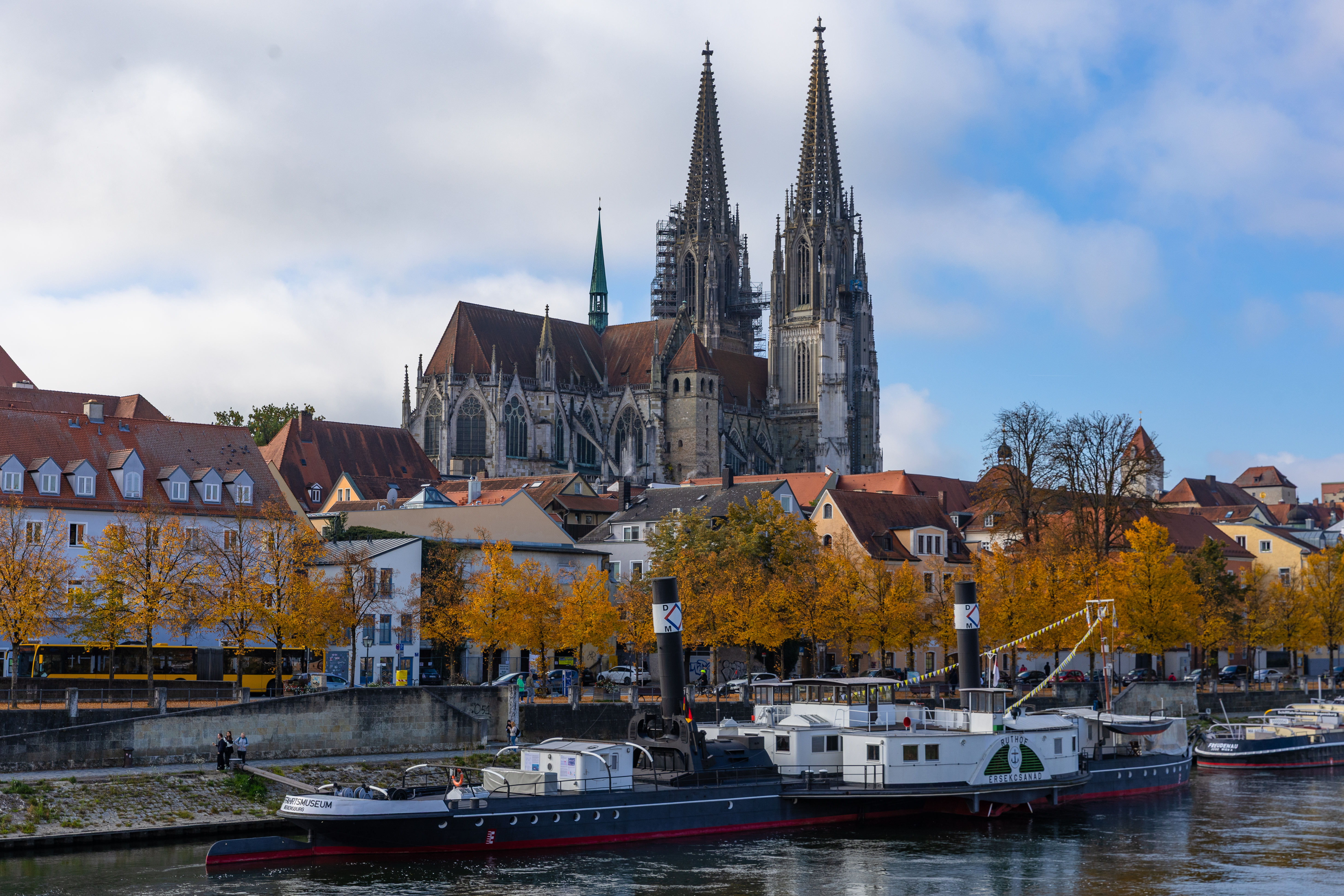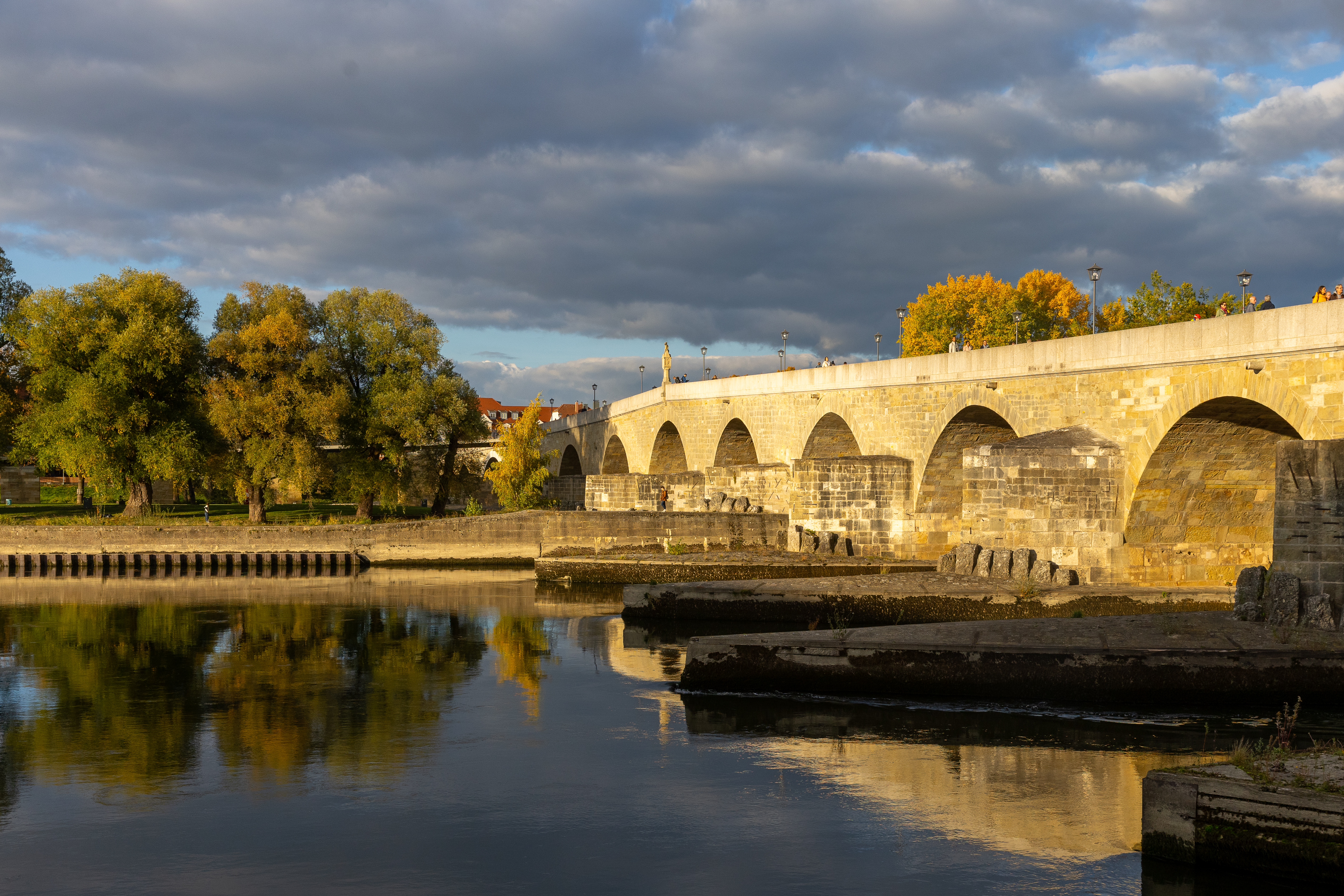 Am Morgen fällt die Wahl des heutigen Reiseziels auf Regensburg. Wir haben im Campingführer einen Platz direkt an der Donau, für teures Geld zwar, aber immerhin, gefunden. Gegen frühen Nachmittag kommen wir an. Unseren Stellplatz finden wir idyllisch unter hohen Ahornbäumen, die ihr herrlich goldenes Laubkleid über uns ausbreiten. Wir stehen nur wenige Meter vom Donauufer entfernt und schnell holen wir die Räder raus und radeln die kurze Strecke in die Stadt. Die Natur hat sich für uns herausgeputzt mit ihrem buntesten Kleid: es ist strahlendes Herbstwetter!