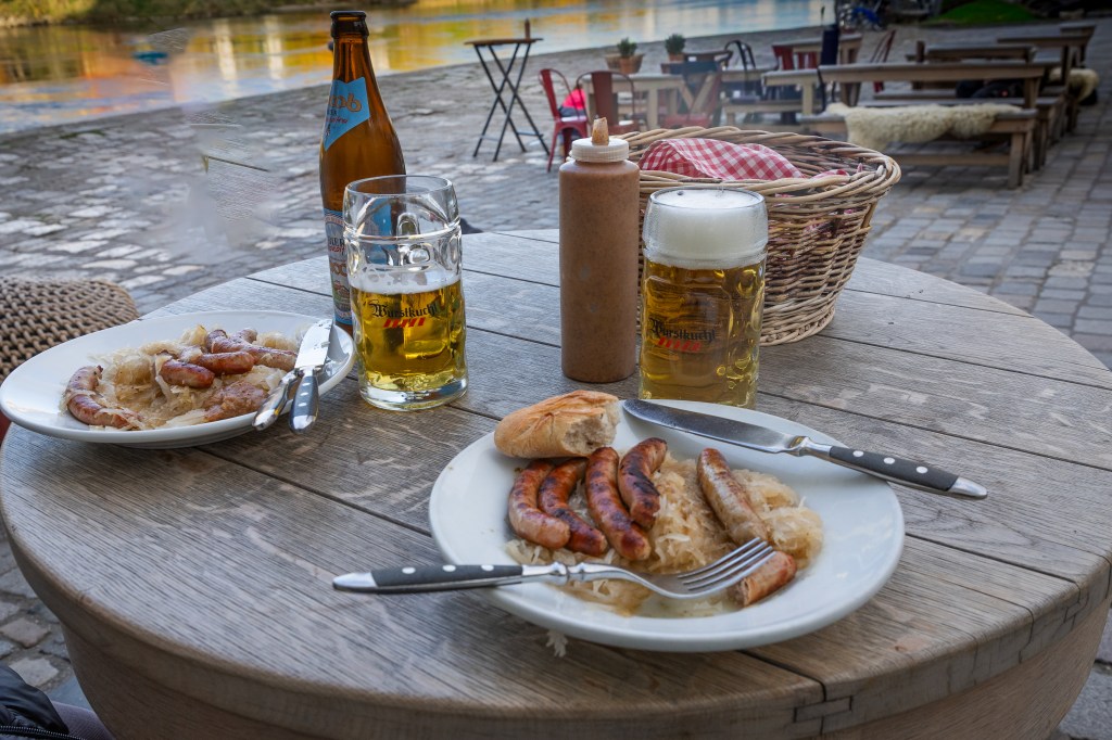 Bummelnd durch die alten Gassen bestaunen wir die Architektur und freuen uns am bunten Treiben. In der „Wurstkuchl“, einer alten Garküche direkt an der steinernen Brücke über die Donau haben schon vor 500 Jahren die Flussschiffer der Donau ihr Tagesmahl eingenommen. Wir bestellen uns Bier und bayrische Bratwürste mit Kraut, ebenso wie die Schiffer sie damals verspeisten.